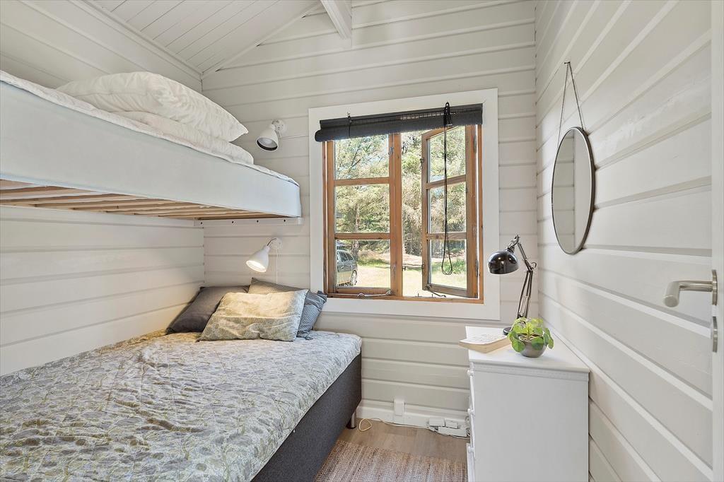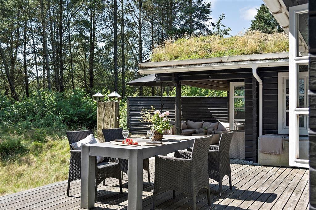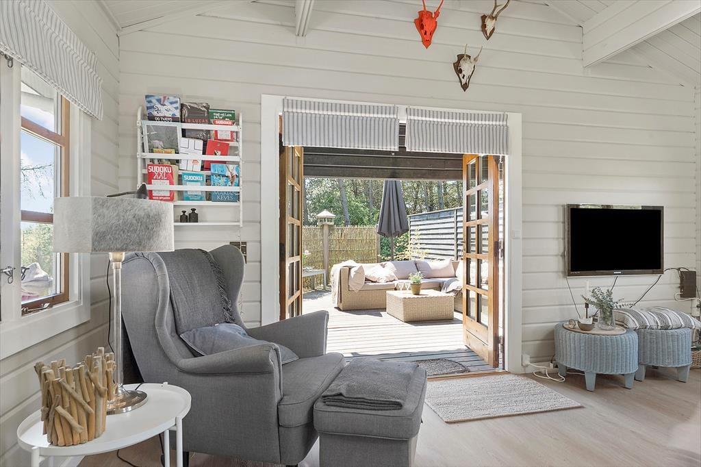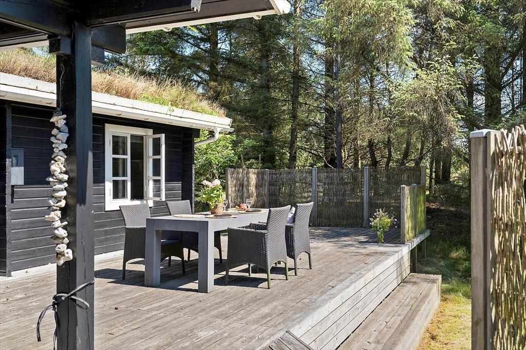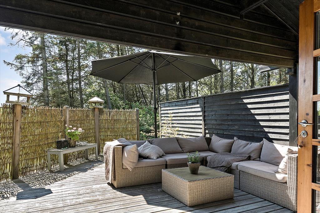 Draußen erwartet dich eine große Terrasse, auf der du den ganzen Tag in der Sonne genießen kannst. Die Terrasse ist ungestört und liegt auf einem naturnahen Grundstück, was dir den perfekten Rahmen für deinen morgendlichen Kaffee oder das Abendessen vom Grill bietet. Der private Innenhof ist der ideale Ort zum Entspannen und zur Ruhe zu kommen. Vom Ferienhaus aus ist es nur ein kurzer Spaziergang zu einem gemütlichen Shelterbereich, in dem du die wunderschöne Natur genießen und das Gefühl haben kannst, ganz nah an Wald und Meer zu sein. Am Abend kannst du auf der Terrasse sitzen und den Vögeln zuhören, während die Sonne untergeht.