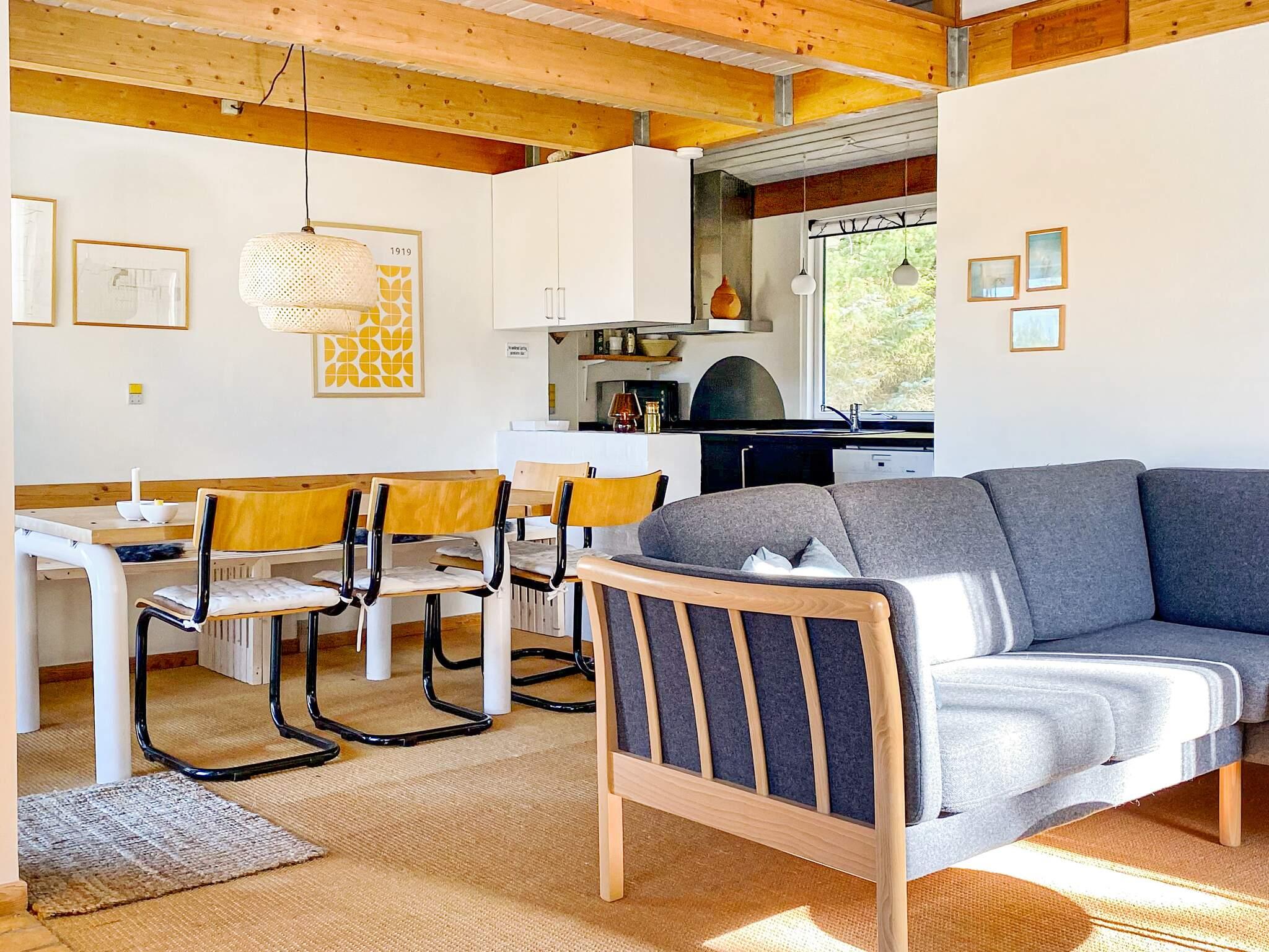 Das Haus verfügt über drei Schlafzimmer und ein funktionales Badezimmer. Das Herzstück des Hauses bildet der offene Küchen- und Wohnbereich, der mit einem Essbereich und einer gemütlichen Sitzecke für Familienfeiern konzipiert ist. Von hier aus haben Sie direkten Zugang zur teilweise überdachten Holzterrasse, auf der Sie Mahlzeiten im Freien genießen oder einfach an der frischen Luft entspannen können. An kühleren Tagen sorgt die Wärme des Holzofens für eine gemütliche Atmosphäre, während die energieeffiziente Wärmepumpe eine moderne und klimafreundliche Alternative bietet. Ein kleiner Dachboden (Hems) bietet zusätzliche Schlafmöglichkeiten, besonders geeignet für Kinder.