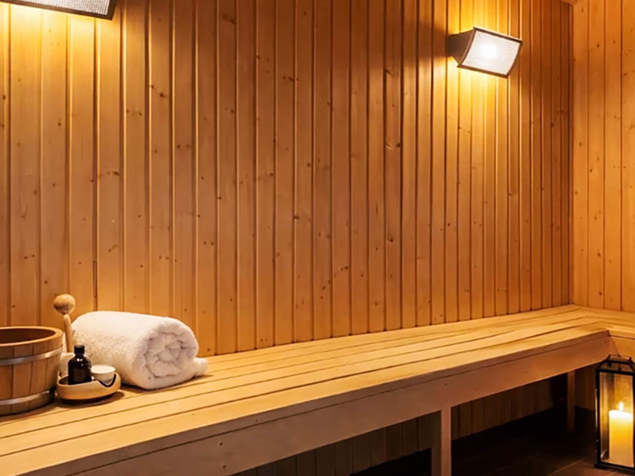 Der Poolraum bietet einen schönen, großen Pool, einen Whirlpool, eine Sauna und ein Badezimmer für Wellness und Badespaß mit der Familie.