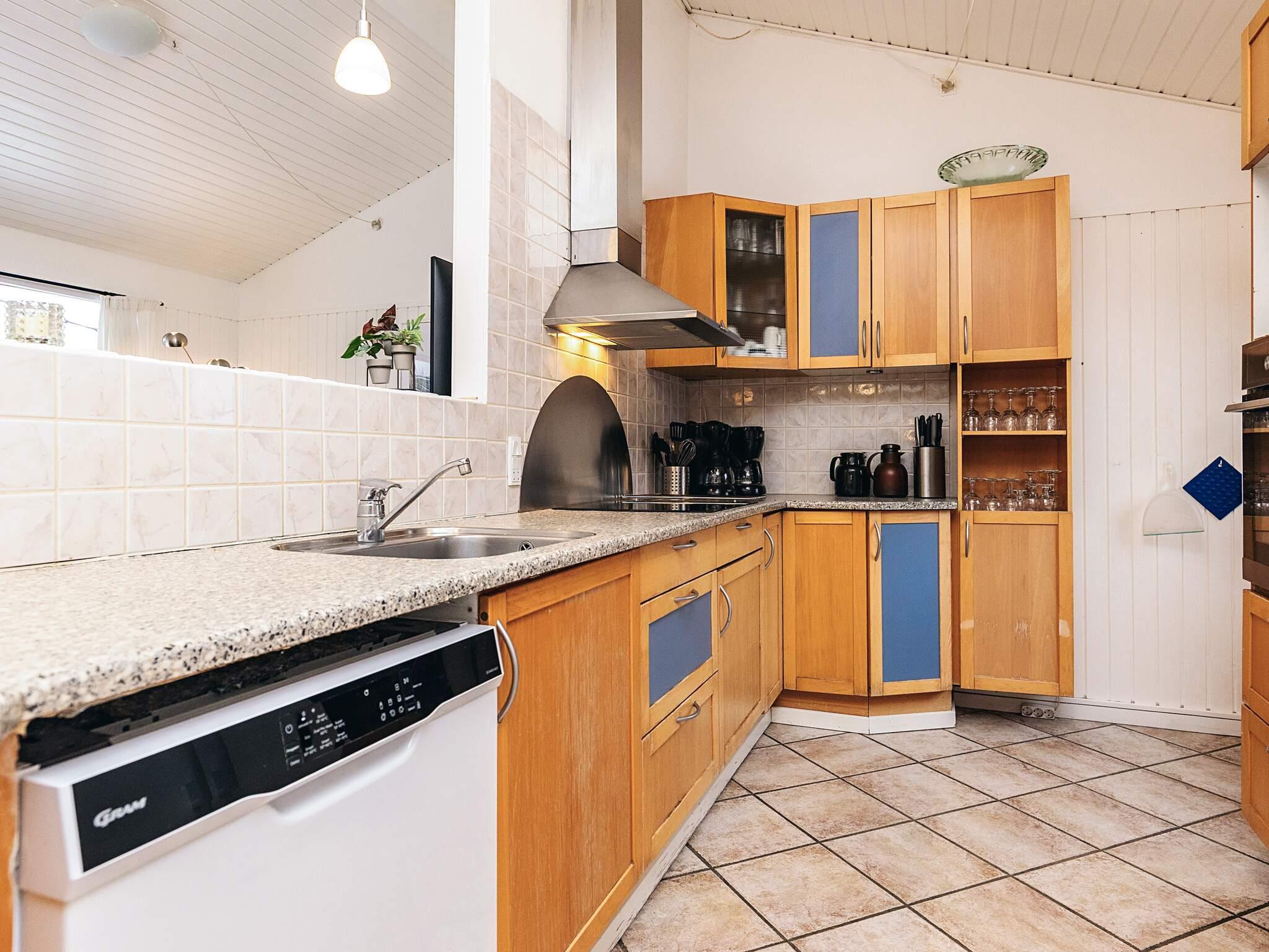 Die große, offene Küche ist direkt mit dem Wohnzimmer verbunden und komplett ausgestattet mit Glaskeramikkochfeld, Dunstabzugshaube, Mikrowelle, Geschirrspüler, zahlreichen Schränken und allem nötigen Geschirr. Zusätzlich gibt es einen Freizeitraum mit Billardtisch, Tischtennisplatten (passend zum Billardtisch), Dartscheibe, Bobbahn und Tischfußball.
