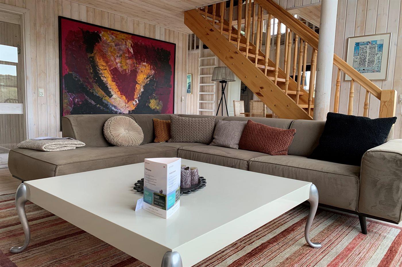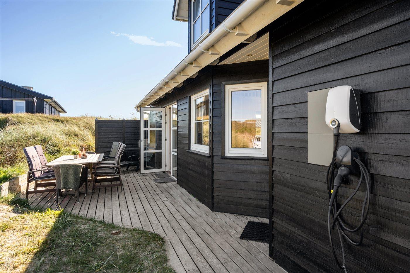 Die Ferienunterkunft liegt auf einem 2000 m² großen Dünengrundstück. Die Entfernung zum Meer beträgt 150 m. Die nächste Einkaufsmöglichkeit liegt 800 m entfernt. Es steht ein 30 m² Terrassenareal zur Verfügung. Geräteraum. Es ist ein Ladestecker für Elektroautos installiert. Parkplatz auf dem Grundstück.