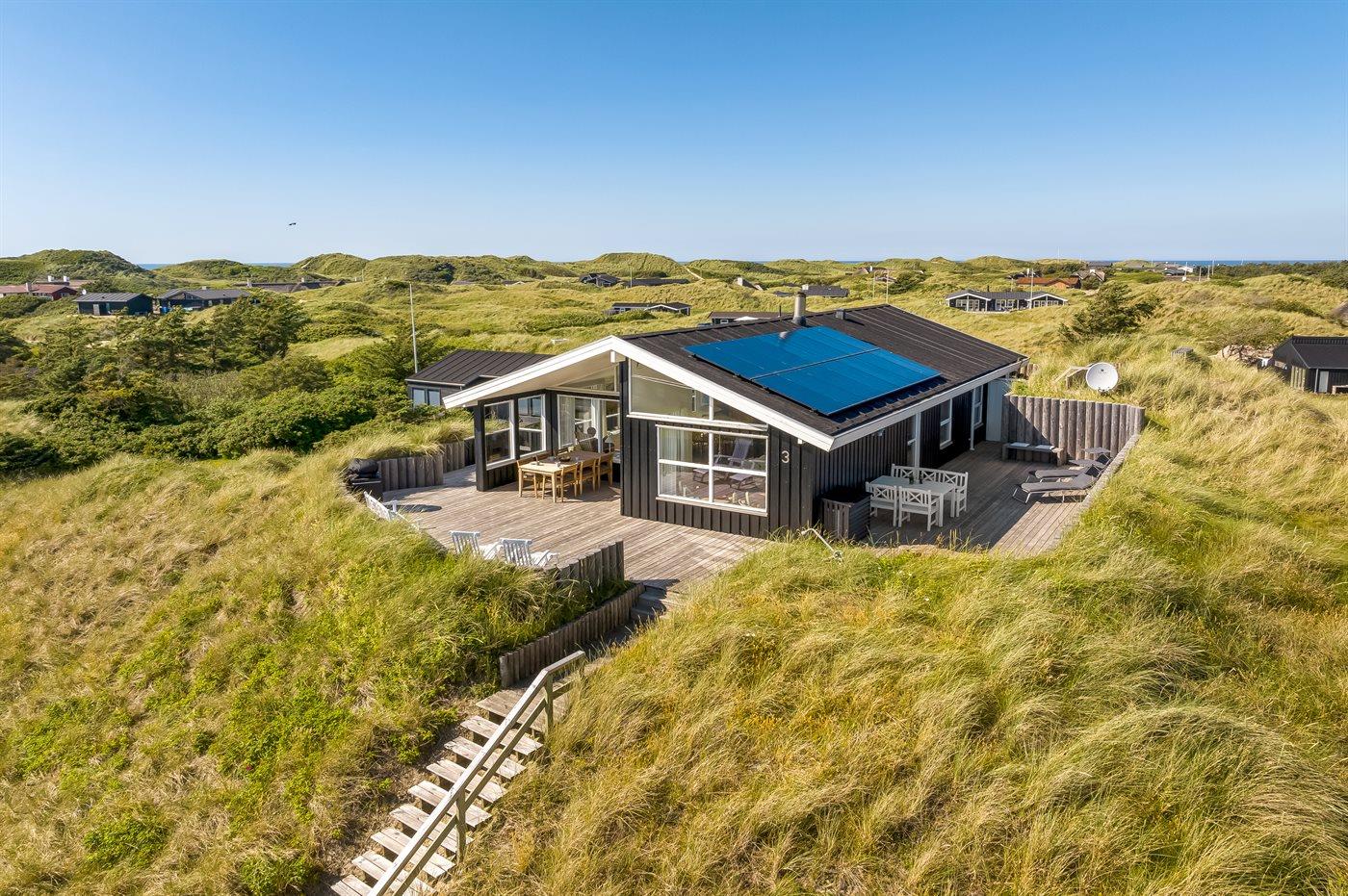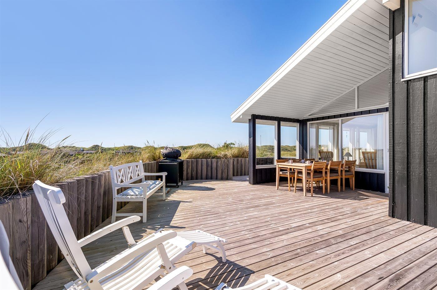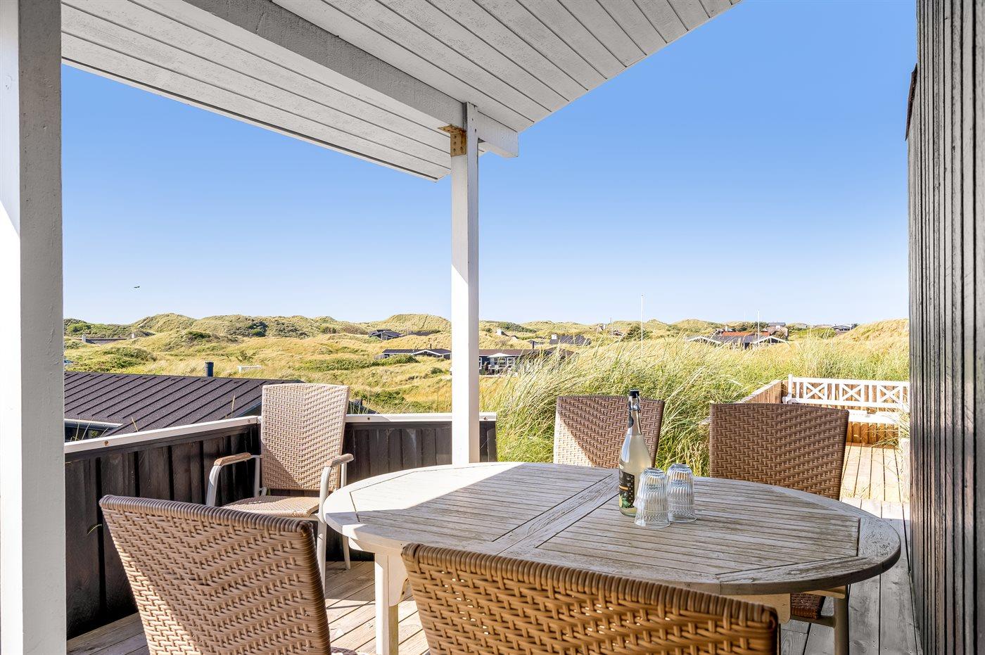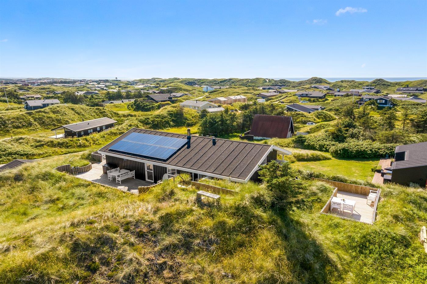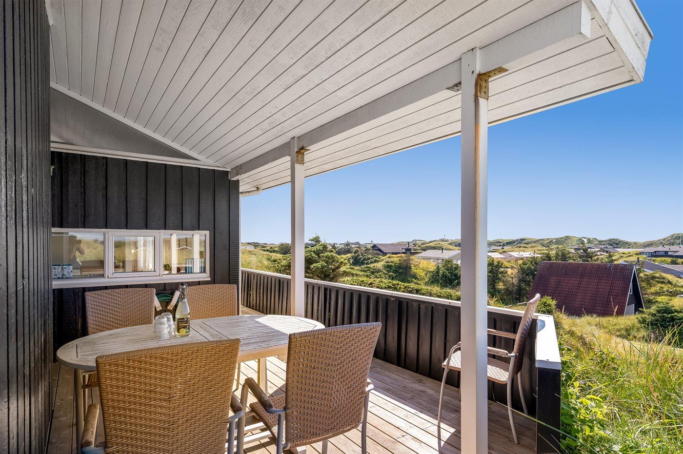 Auf dem höchsten Punkt eines hügeligen Dünengrundstücks, nahe am Strand von Blokhus, findest du dieses schöne Ferienhaus. Zum Haus gehören sowohl eine offene als auch eine überdachte Terrasse, von der aus du einen tollen Blick auf die Dünen und die Umgebung hast. Es gibt auch eine in Richtung Osten ausgerichtete Morgenterrasse und eine erhöhte Terrasse hinter dem Haus, von der aus man das Meer ahnen und den Sonnenuntergang sowie das gemütliche Beisammensein genießen kann.