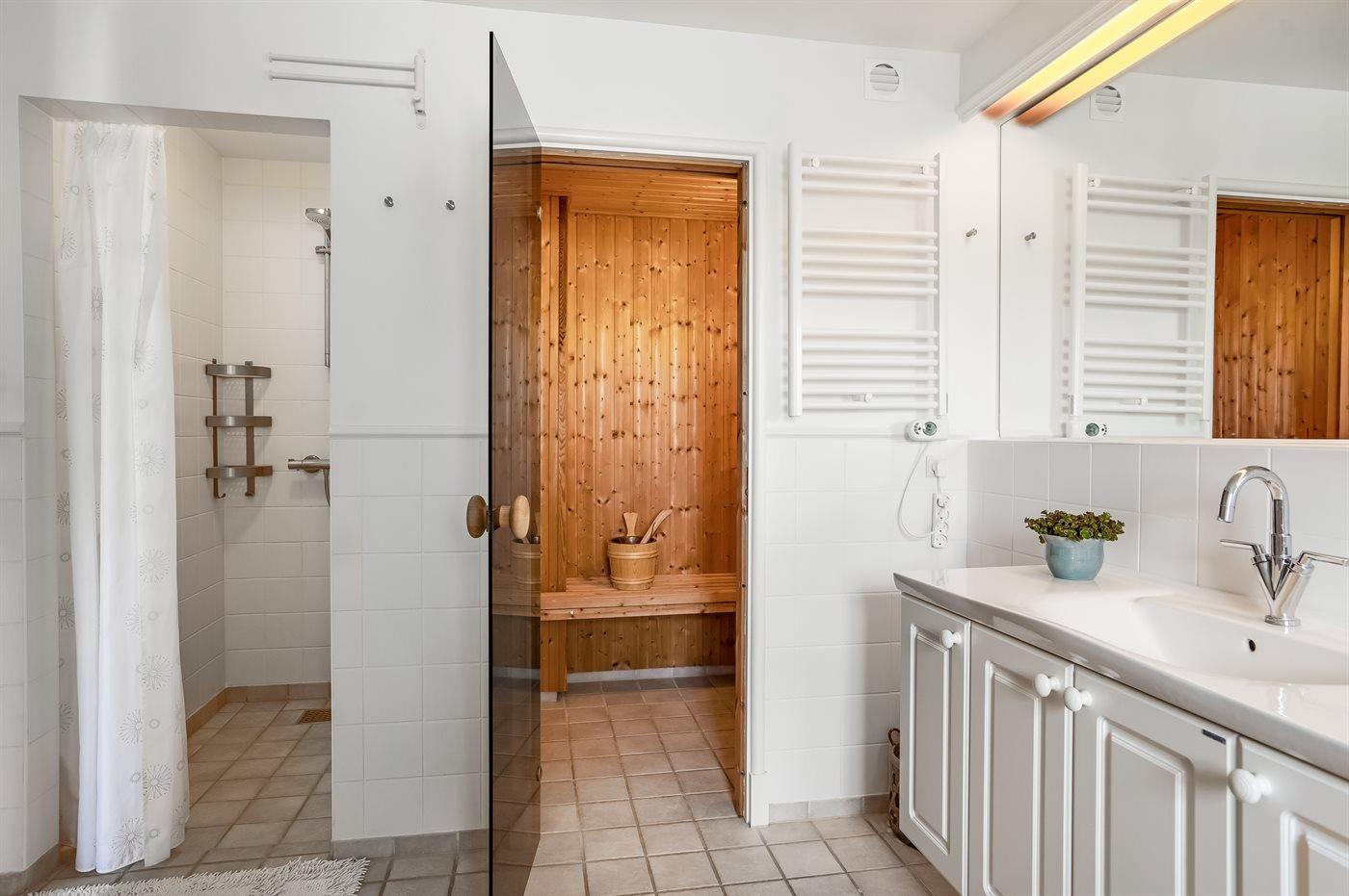 Es gibt 2 Badezimmer mit Duschnische und 2 Toiletten. Fußbodenheizung in 2 Badezimmern. Es steht eine Sauna zur Verfügung in der Sie sich so richtig entspannen können.