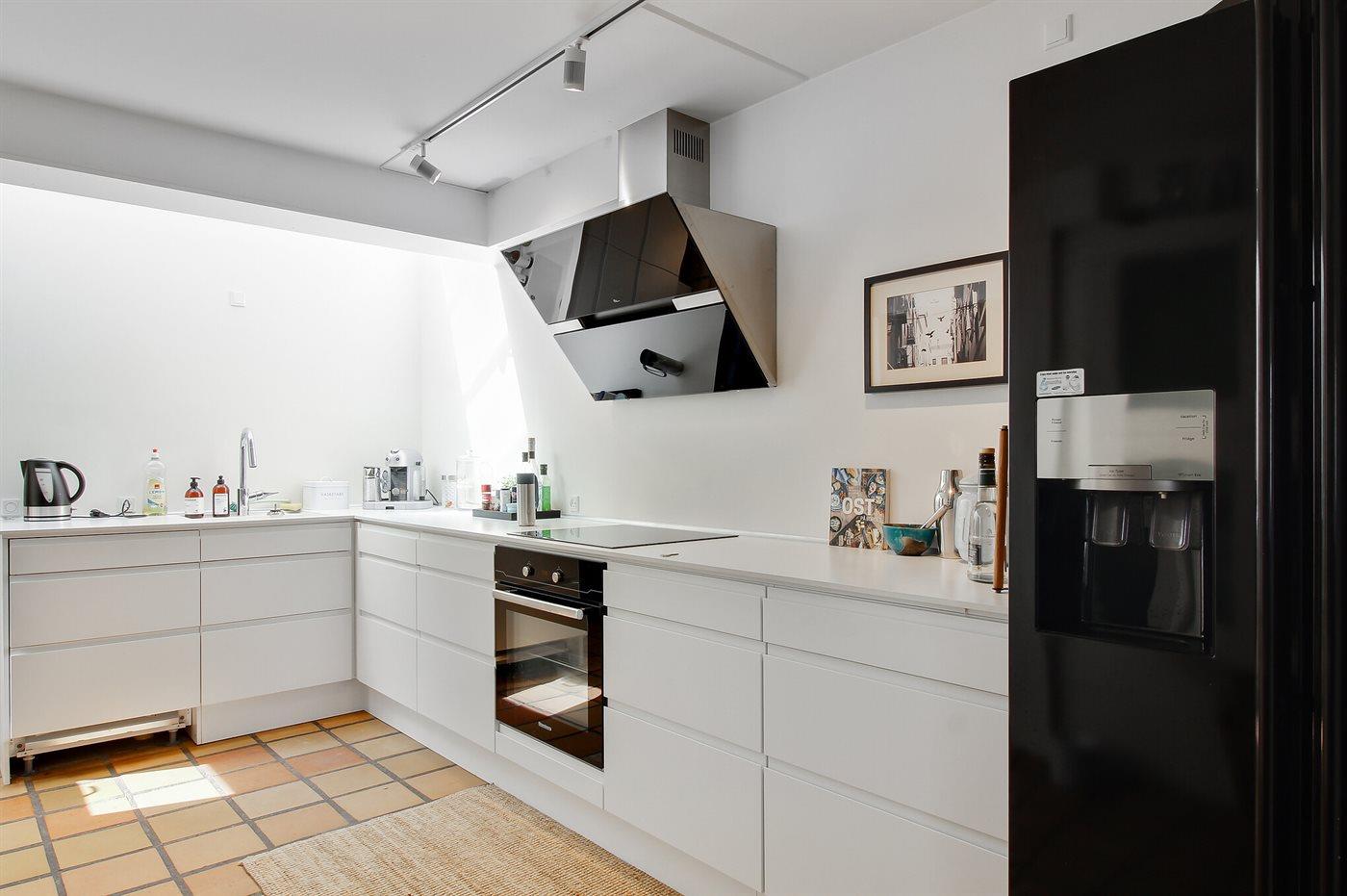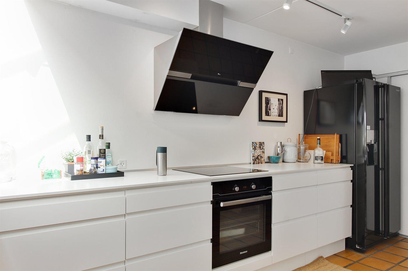 Die Küche ist mit Kühlschrank ausgestattet. Außerdem gibt es 4 Induktions-Kochzonen, Umluftofen, Mikrowelle sowie Geschirrspüler.