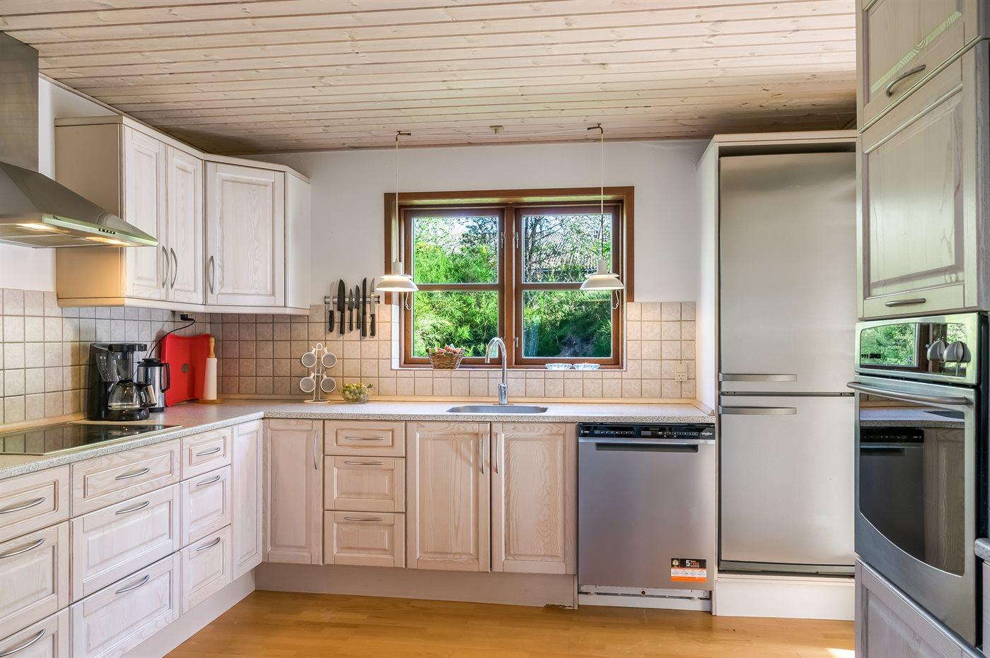 Die Küche ist mit Kühlschrank ausgestattet. Außerdem gibt es 4 Keramik-Kochfelder, Umluftofen, Mikrowelle sowie Geschirrspüler.