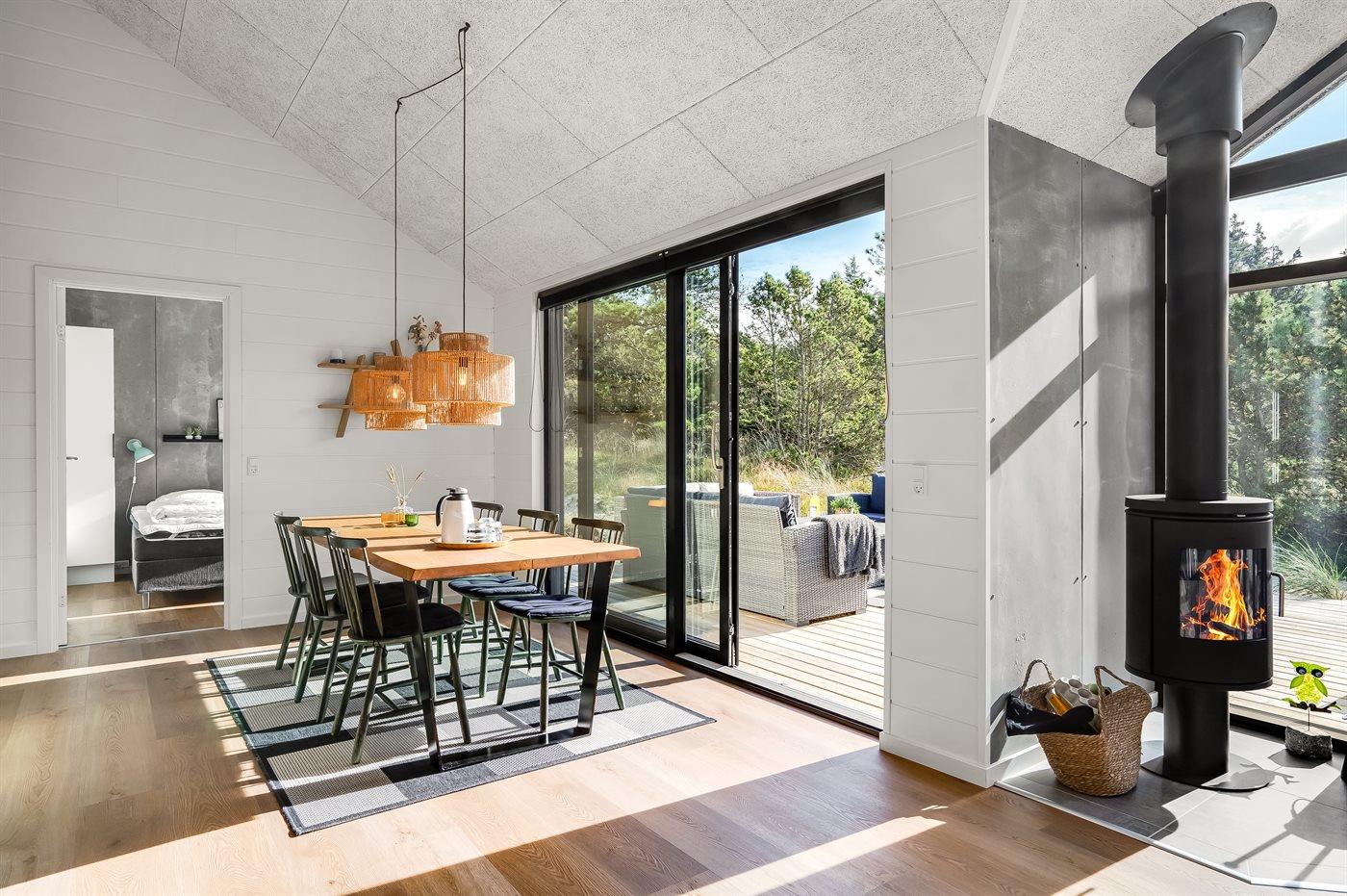 Sobald ihr das Haus betretet, werdet ihr von einem hellen und einladenden Wohnbereich empfangen, mit großen Fensterfronten, die das Tageslicht hereinlassen und die wunderschöne Landschaft ganz nah heranbringen. Beginnt den Tag mit einem leckeren Frühstück in der offenen Küche, während ihr die Aussicht auf die Natur genießt. Später könnt ihr euch auf dem Sofa entspannen und dieselbe atemberaubende Aussicht bewundern oder den Kamin anzünden, der an kühlen Tagen Wärme und Gemütlichkeit verbreitet.