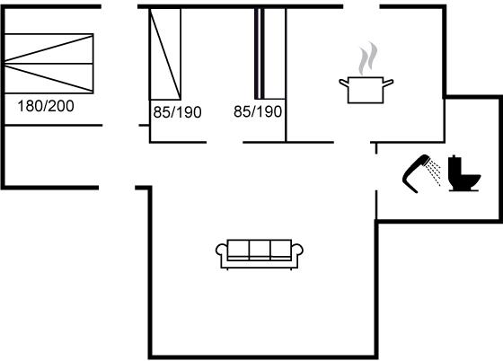 Die Schlafplätze verteilen sich auf 2 Schlafräume. 2 Schlafplätze in einem Doppelbett.1 Schlafplatz in einem Einzelbett. 2 Schlafplätze in einem Etagenbett.
