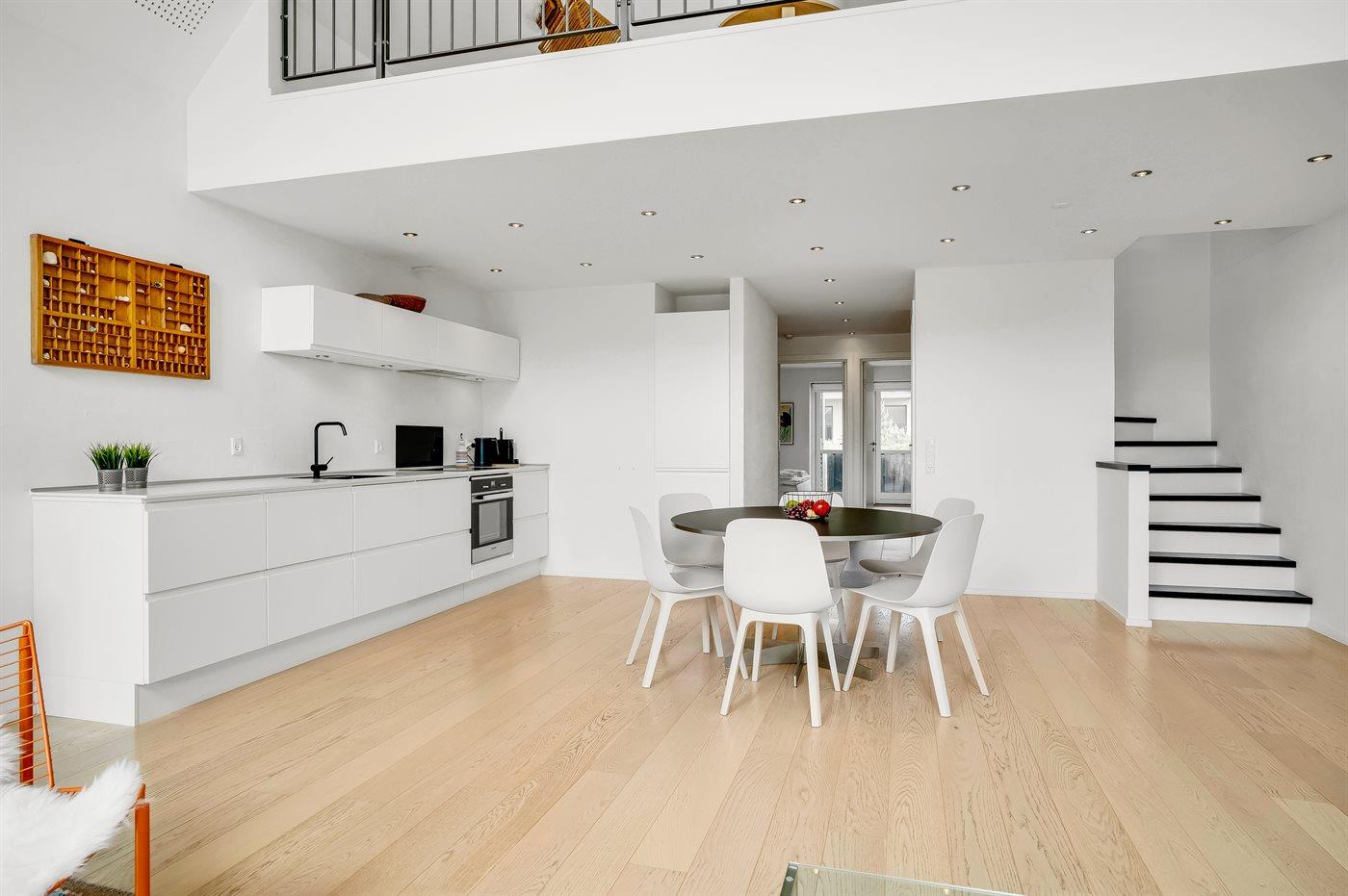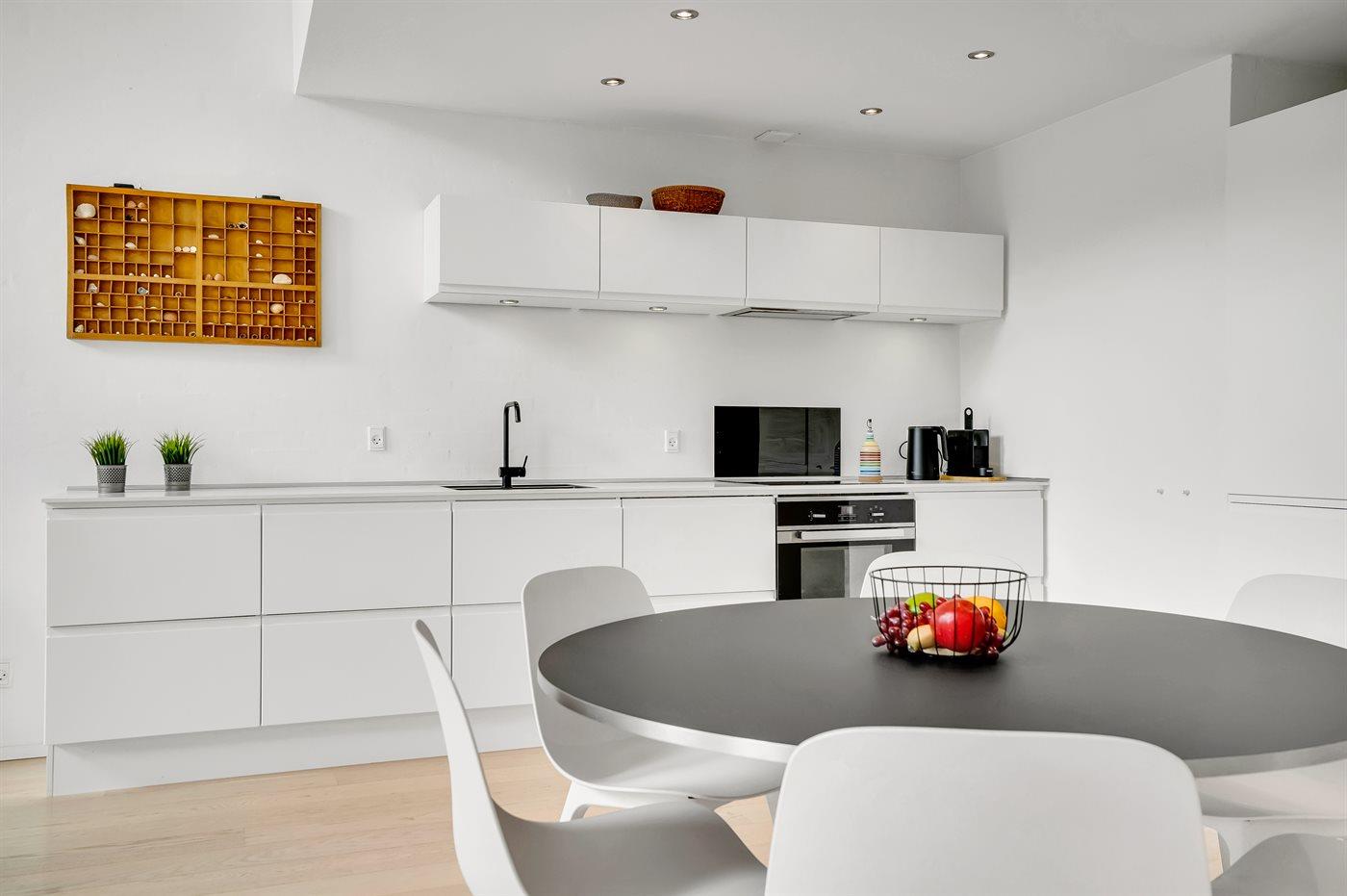 Die Küche ist mit Kühlschrank ausgestattet. Außerdem gibt es 4 Induktions-Kochzonen, Umluftofen sowie Geschirrspüler.