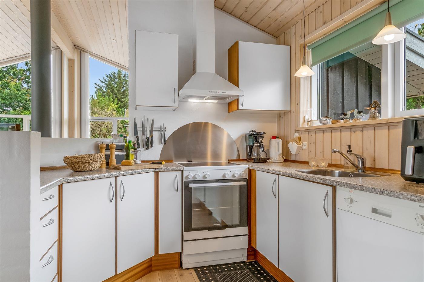 Die Küche ist mit Kühlschrank ausgestattet. Außerdem gibt es 4 Keramik-Kochfelder, Umluftofen, Mikrowelle, Airfryer sowie Geschirrspüler.