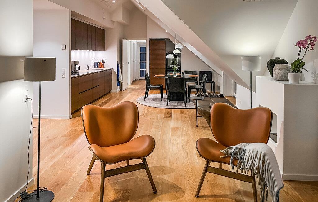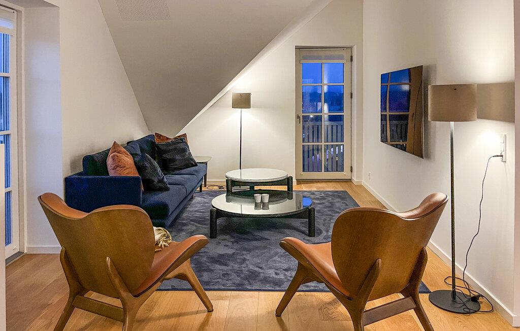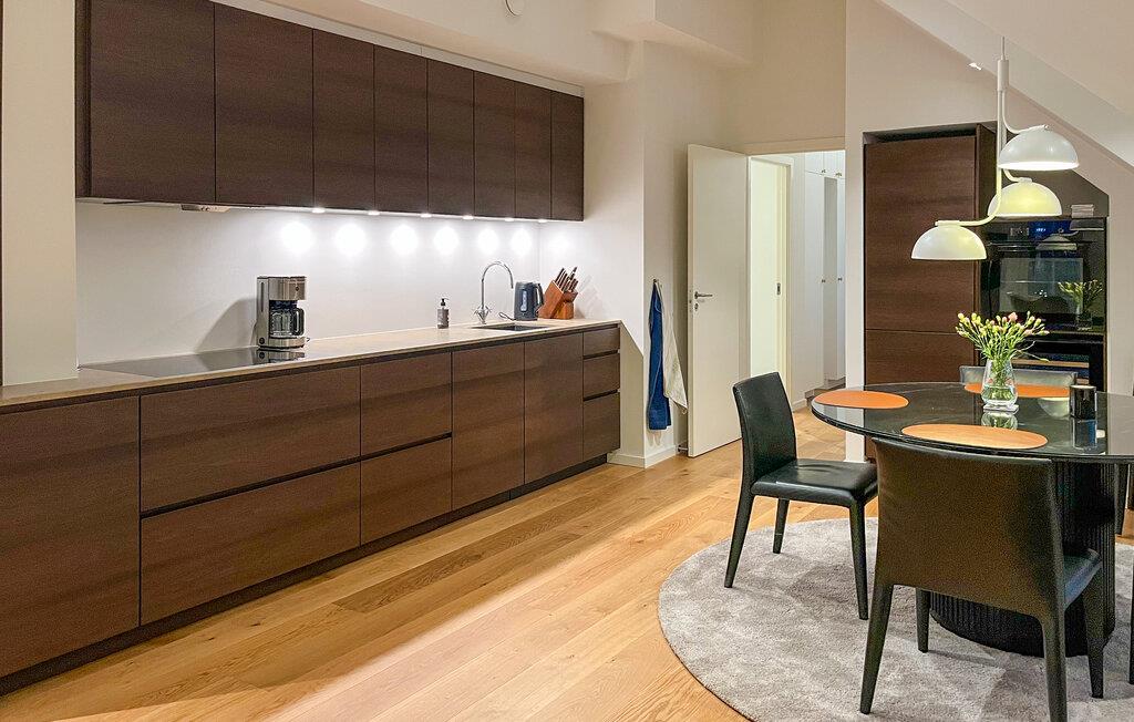 Willkommen in dieser attraktiven Penthouse-Wohnung, die Sie nahe dem Blokhus Torv und nur einen kurzen Spaziergang vom Strand entfernt empfängt. Die Innenausstattung besticht durch hochwertige Materialien und Lösungen, die Luxus, Komfort und Ästhetik perfekt vereinen. Jedes Detail wurde durchdacht, und das Apartment wirkt elegant, modern und exklusiv. Bereiten Sie leckere Gerichte zu, planen Sie Ihre Unternehmungen bei den gemeinsamen Mahlzeiten und machen Sie es sich nach einem langen Tag für einen Filmabend im einladenden Wohnzimmer gemütlich.