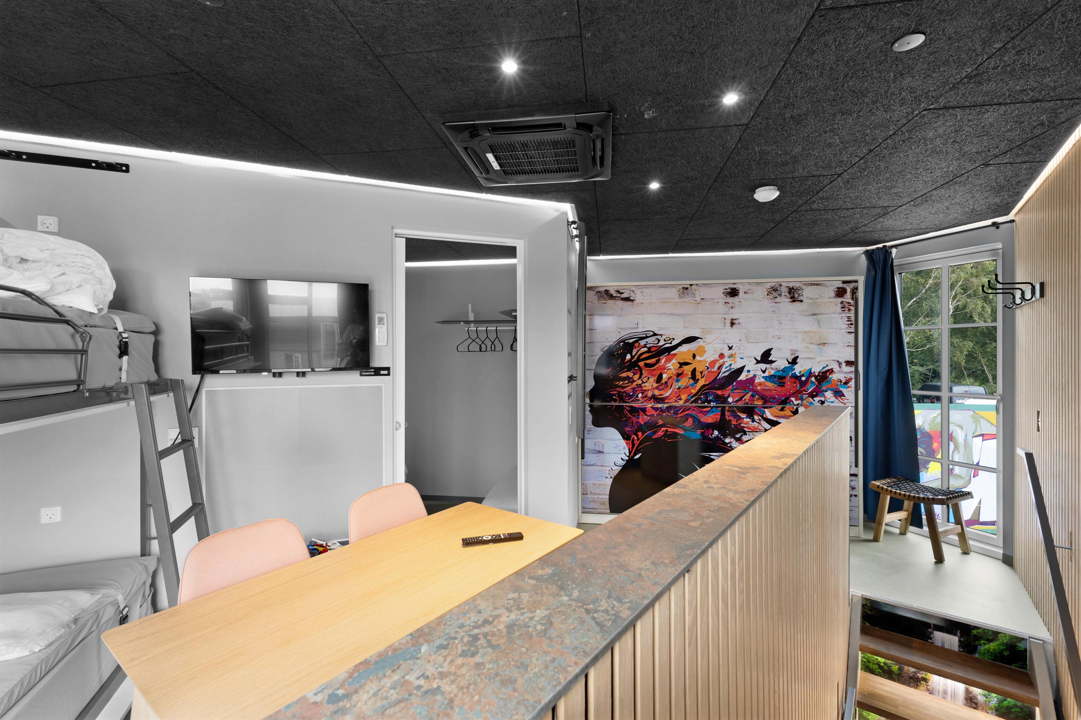 Die Ferienhäusern bieten Platz für bis zu 6 Personen, mit vier Etagenbetten und einem Doppelbett im ersten Stock - Bettwäsche inkludiert. Wenn Sie weniger Personen sind, können die Etagenbetten leicht in die Wände geklappt werden, was Ihnen mehr Platz gibt und es Ihnen ermöglicht, die großen Wandgemälde hinter den Betten zu genießen. Jeder Quadratmeter ist optimal genutzt, und Sie haben alles, was Sie für einen komfortablen Aufenthalt in der Nähe von Blokhus benötigen. Im Erdgeschoss finden Sie eine Küche/Wohnzimmer, ein Badezimmer und eine schöne Terrasse, ausgestattet mit Geschirrspüler, Waschmaschine, Trockner und Grill. Wenn es Konzerte oder andere Events gibt, wird es zu einem besonderen Erlebnis, Teil der Atmosphäre zu sein und sich in Fun Art zu bewegen! Es gibt auch Ladestationen für Elektroautos, und alle Häuser sind rauchfrei.