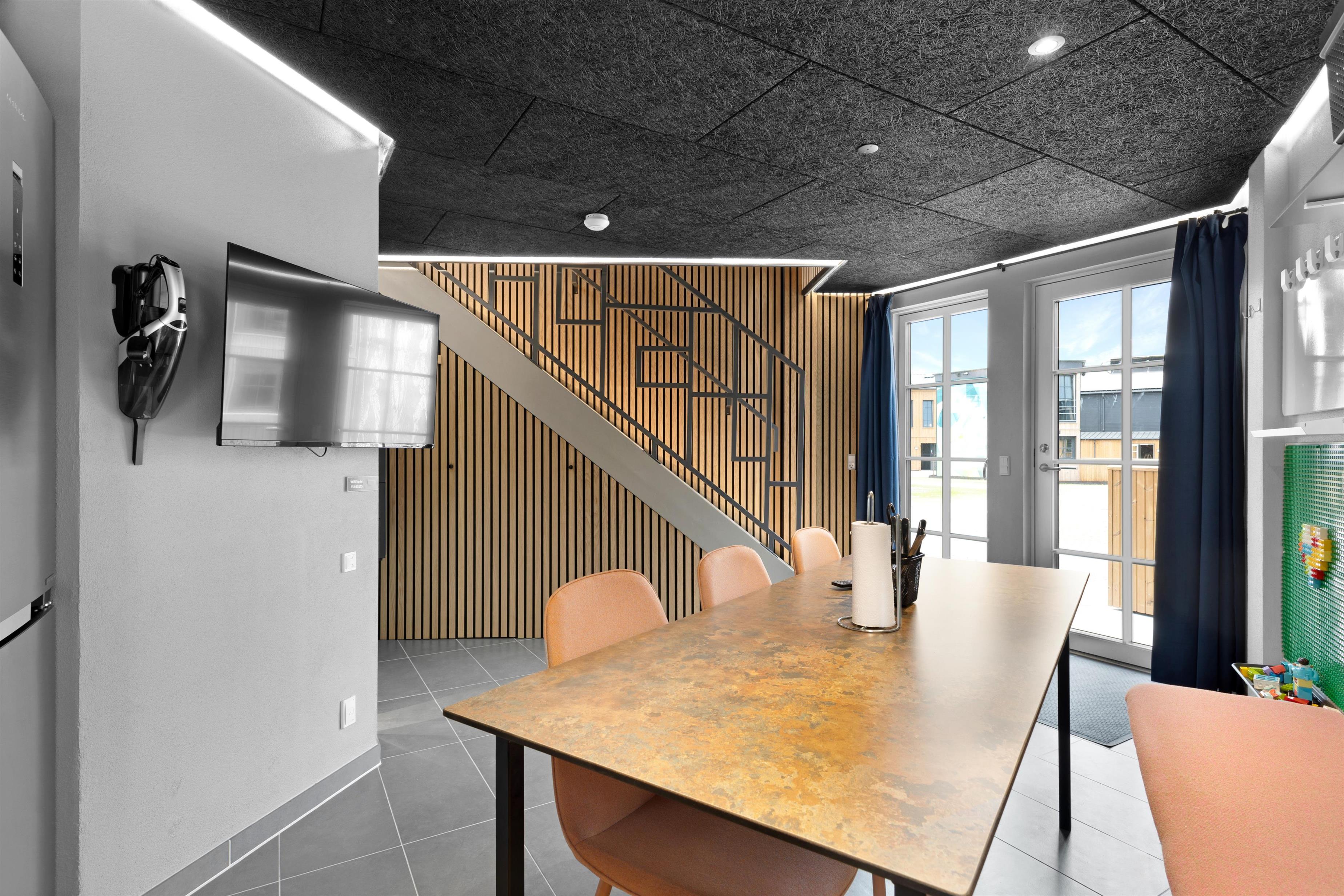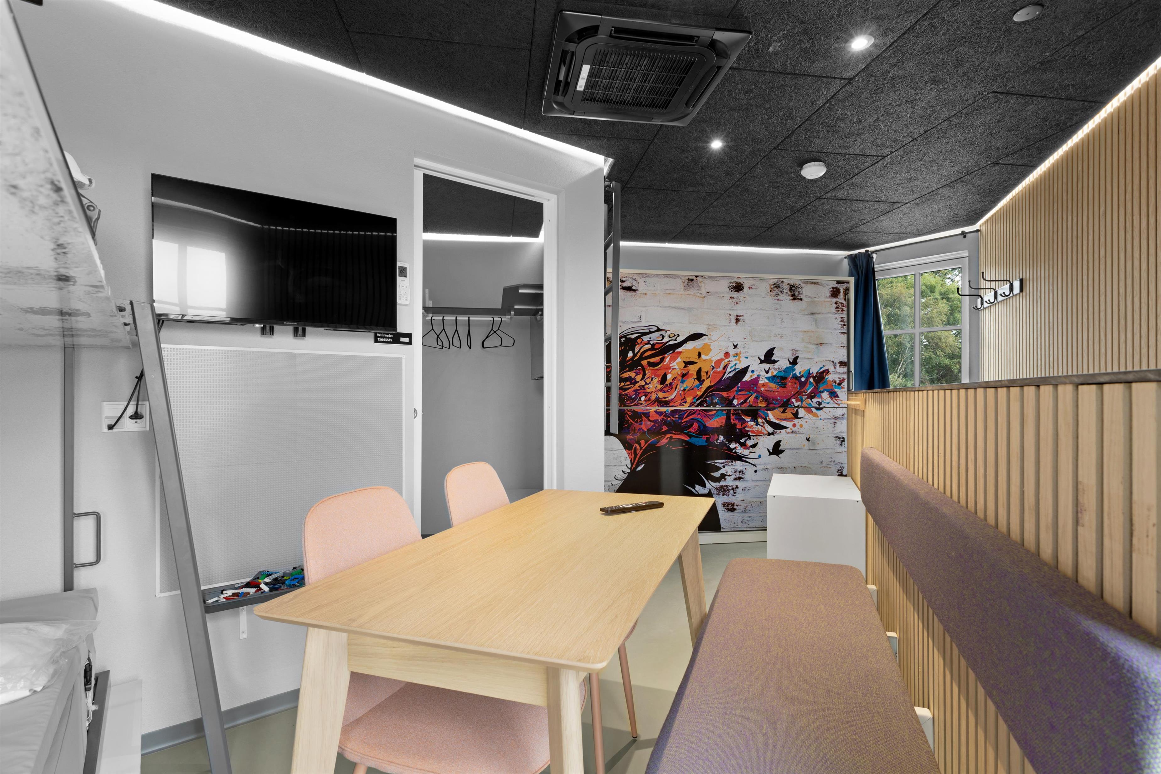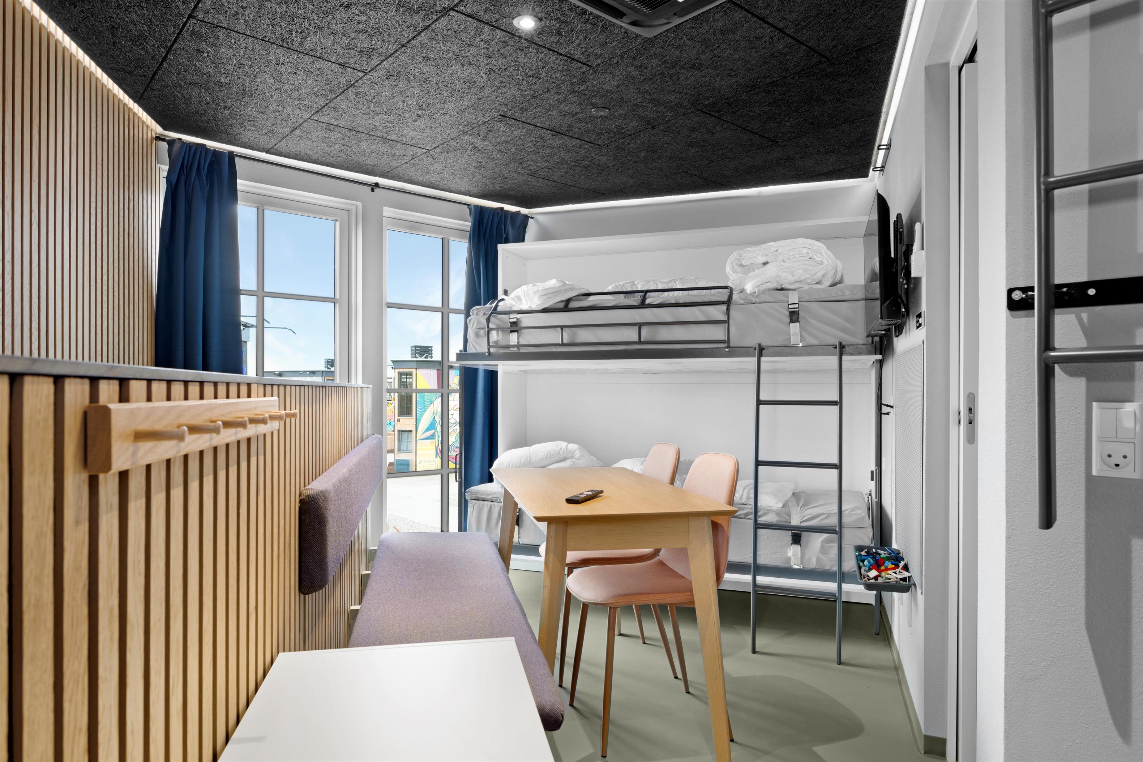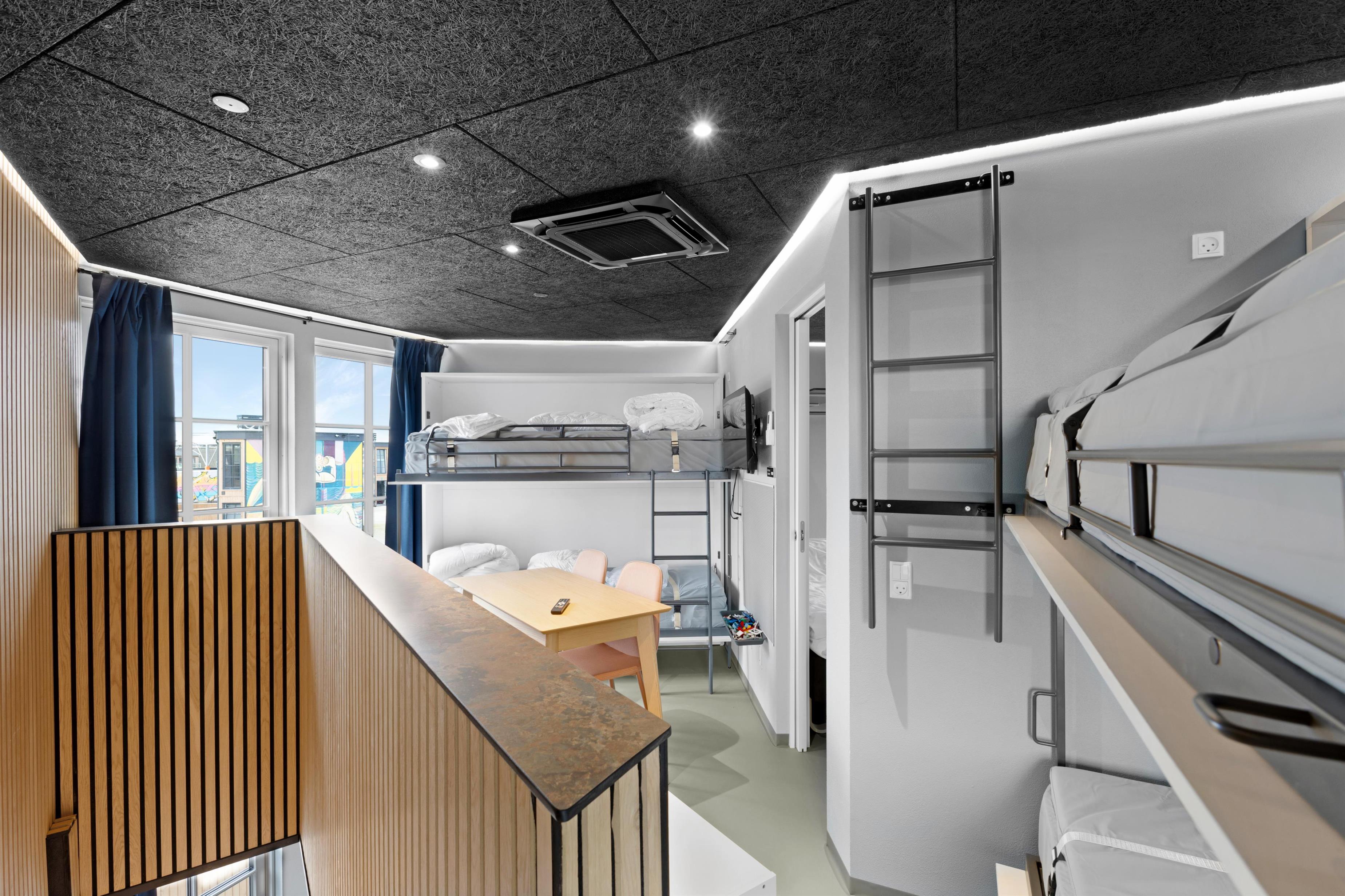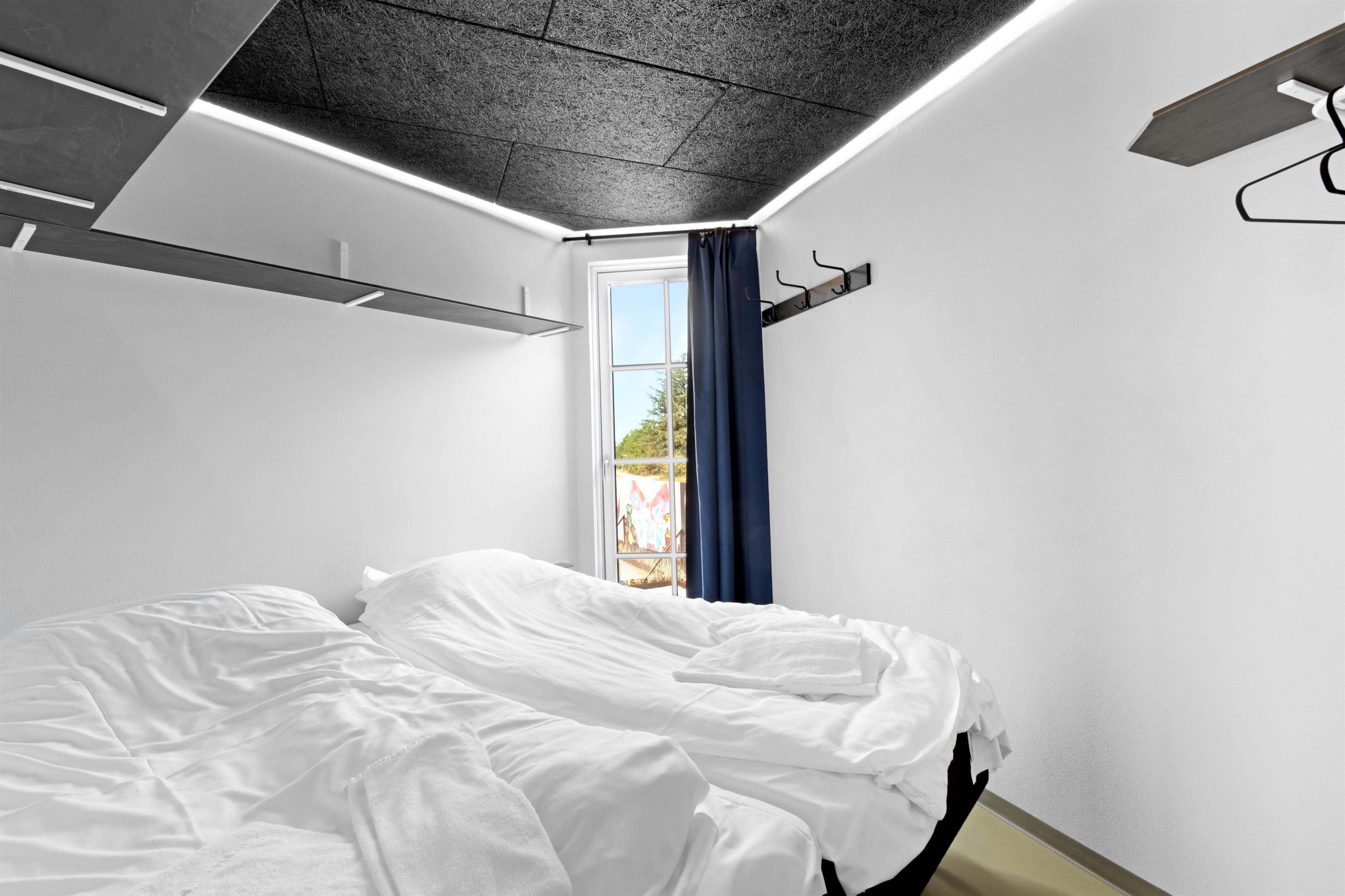 Die Hotelapartments bieten Platz für 6 Gäste mit vier Etagenbetten und einem Doppelbett – alle Schlafplätze befinden sich im ersten Stock. Wenn Sie weniger Personen sind, können Sie die Etagenbetten in die Wände einklappen, was den Raum besonders praktisch macht und ihm einen coolen Stil verleiht. Jeder Quadratmeter erfüllt eine bestimmte Funktion, und hier finden Sie alles, was Sie für eine Übernachtung in der Nähe von Blokhus benötigen, mitten in einer künstlerischen Erlebniswelt.