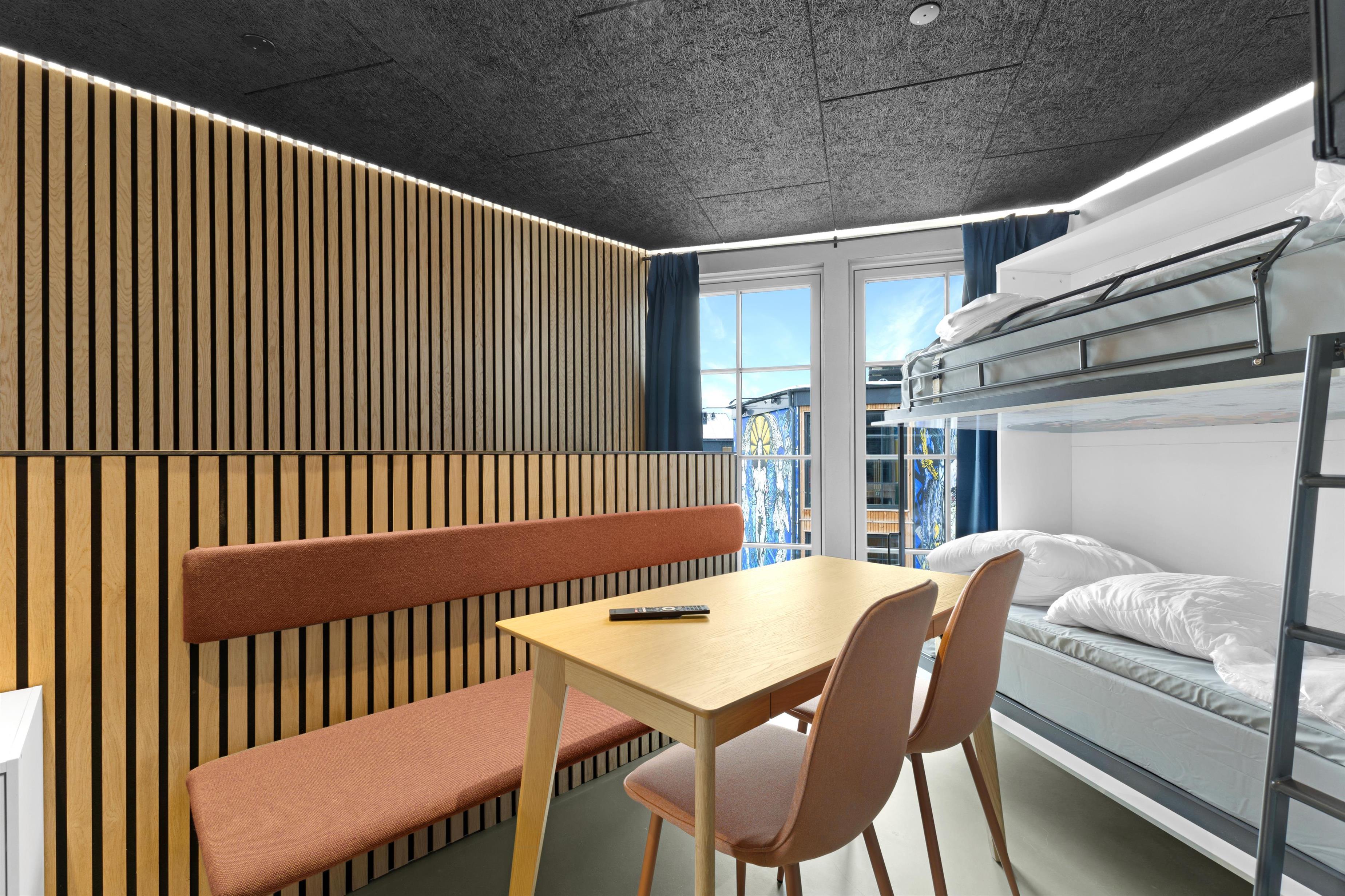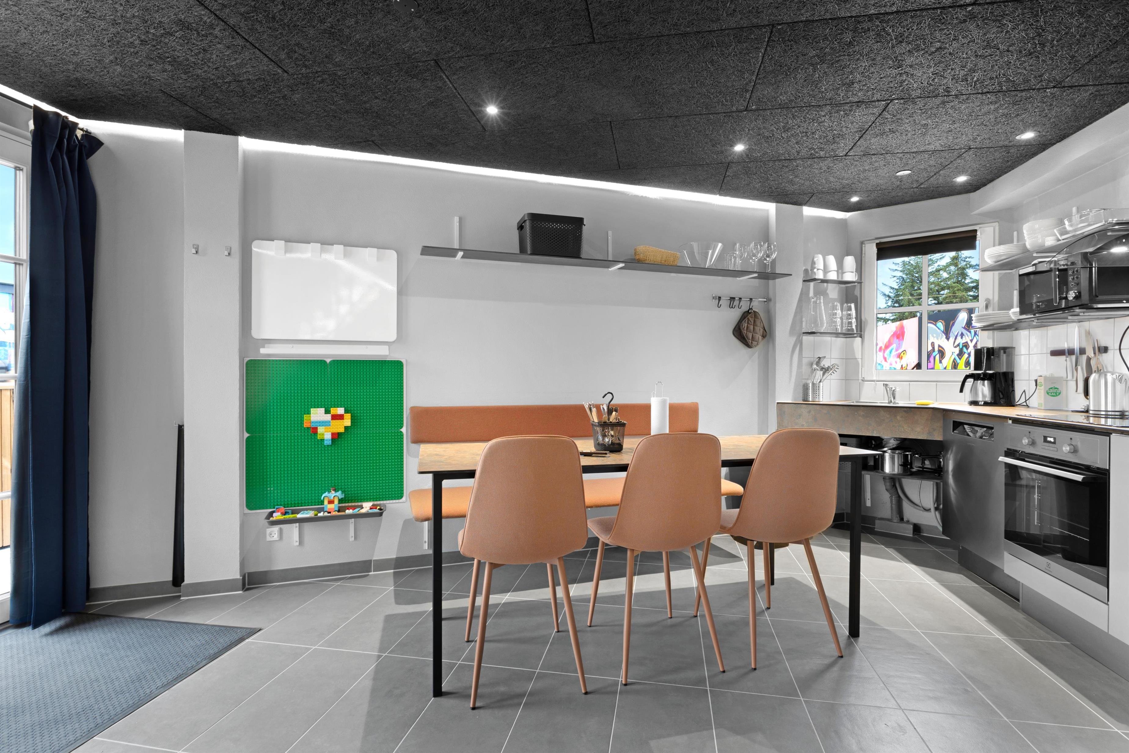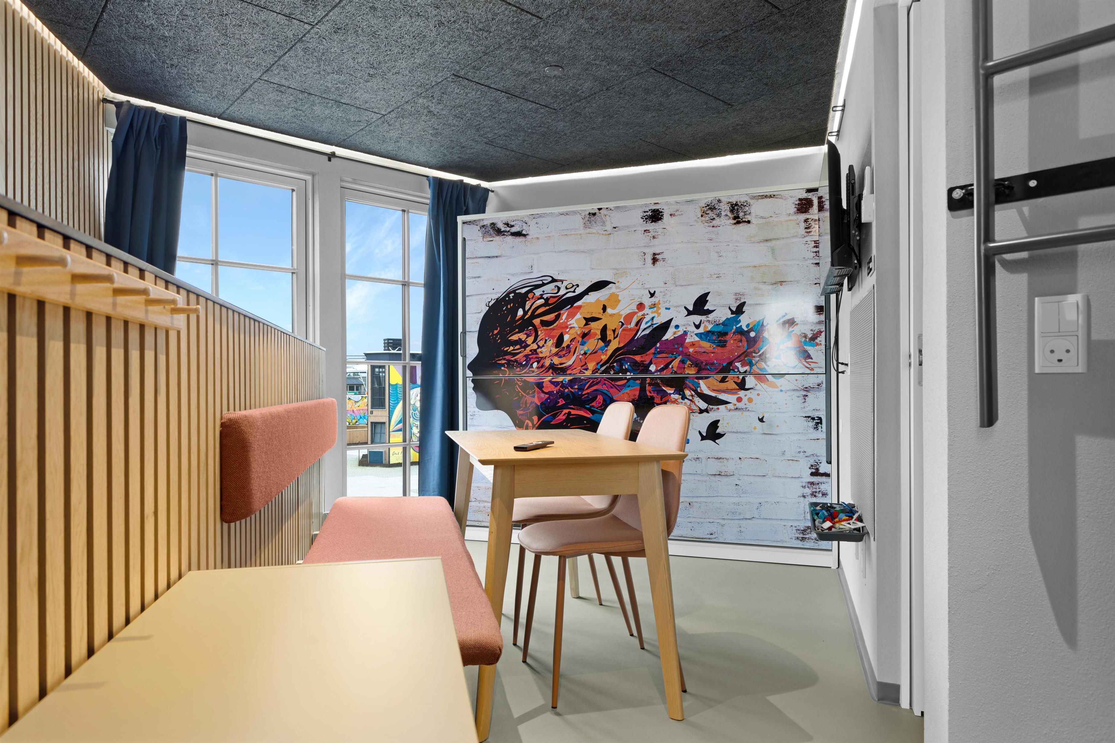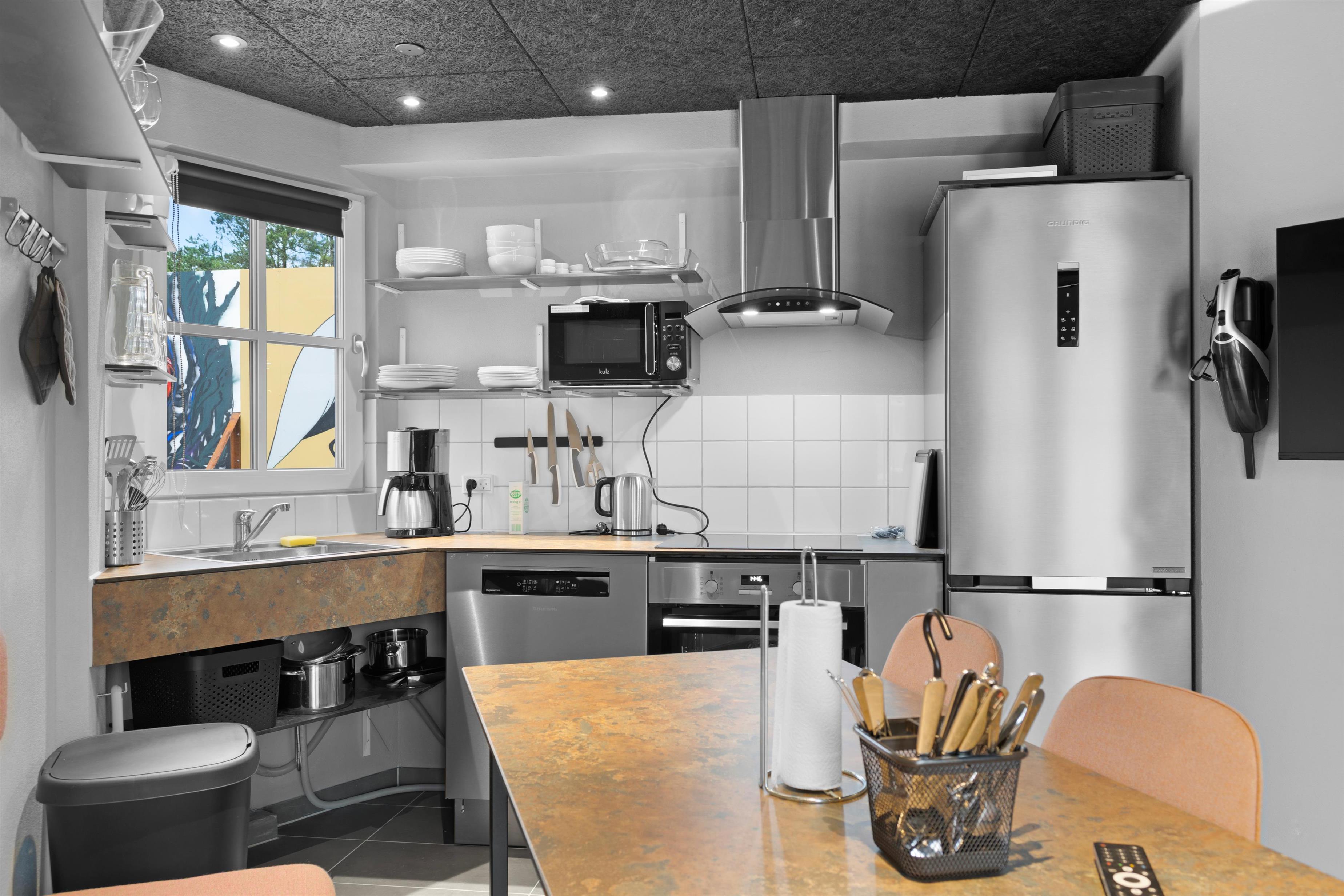 Die Hotelapartments bieten Platz für 6 Gäste mit vier Etagenbetten und einem Doppelbett – alle Schlafplätze befinden sich im ersten Stock. Wenn Sie weniger Personen sind, können Sie die Etagenbetten in die Wände einklappen, was den Raum besonders praktisch macht und ihm einen coolen Stil verleiht. Jeder Quadratmeter erfüllt eine bestimmte Funktion, und hier finden Sie alles, was Sie für eine Übernachtung in der Nähe von Blokhus benötigen, mitten in einer künstlerischen Erlebniswelt.