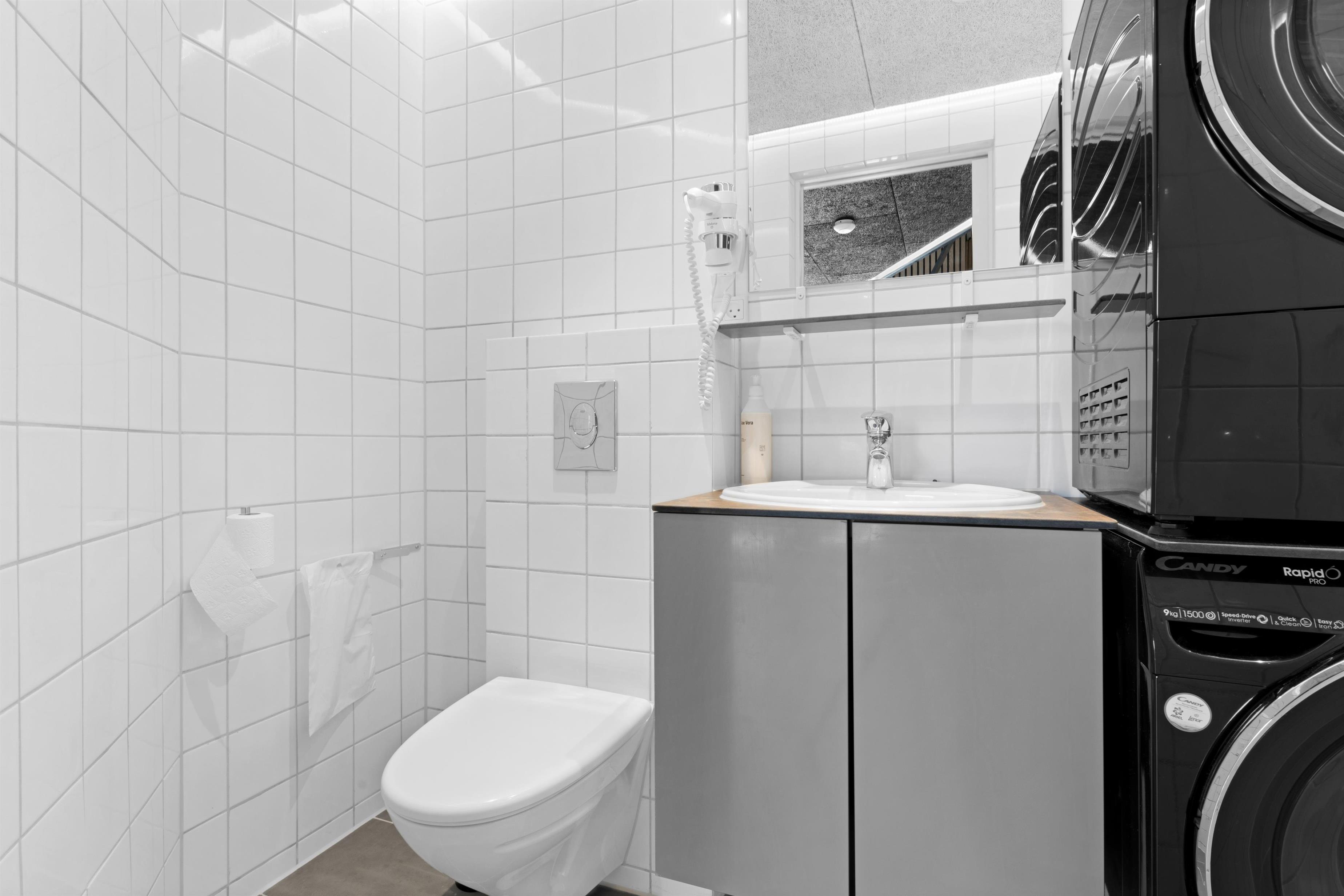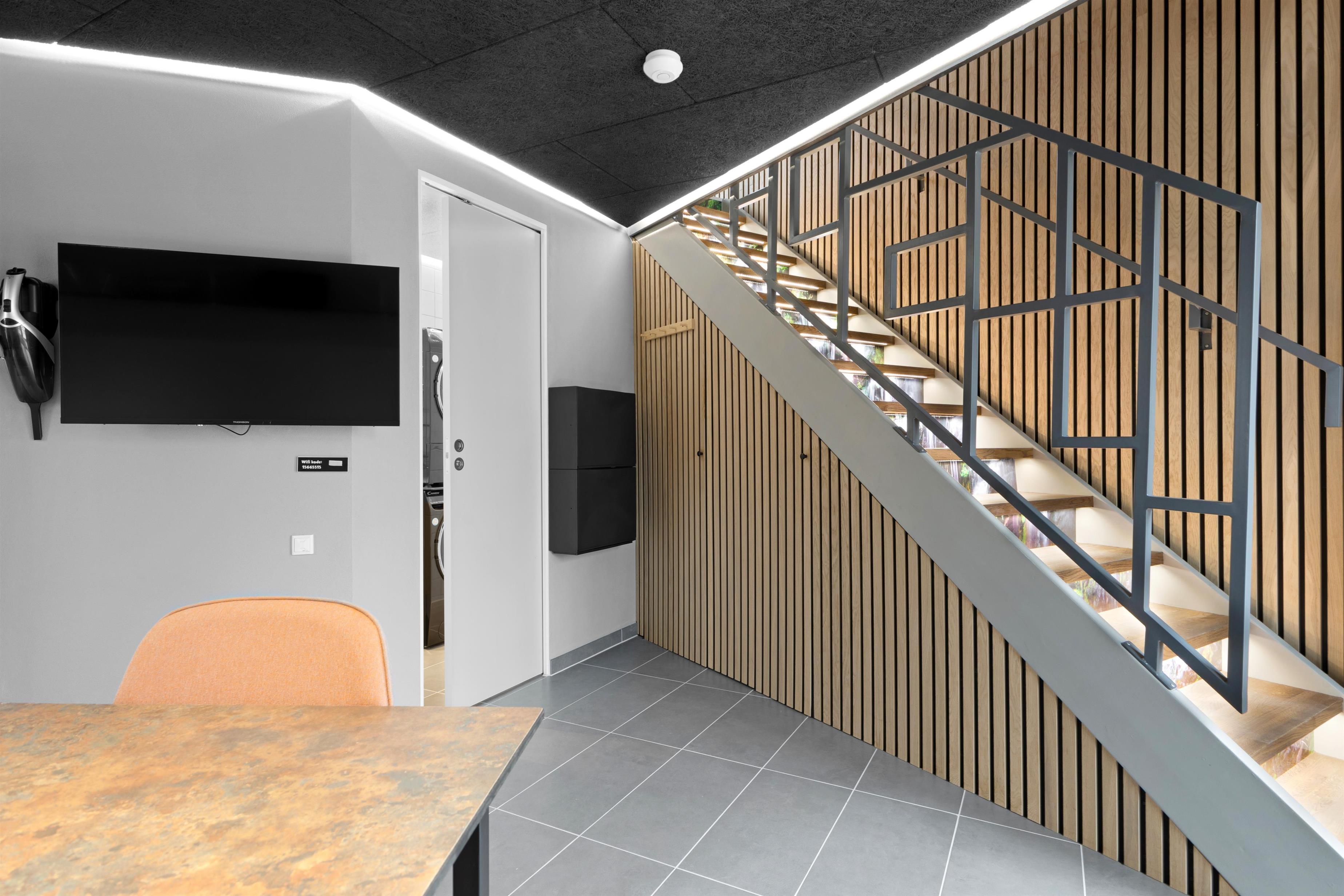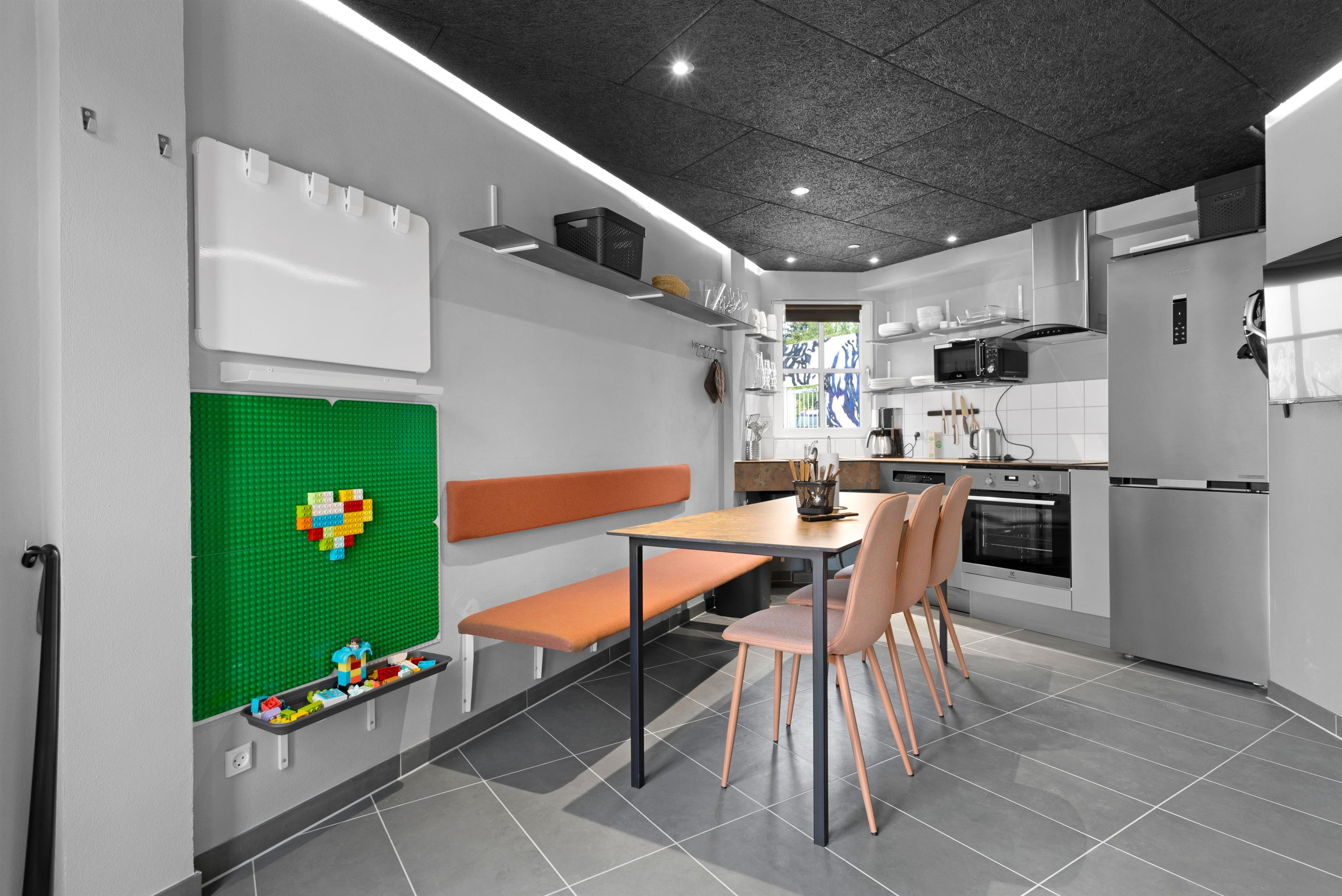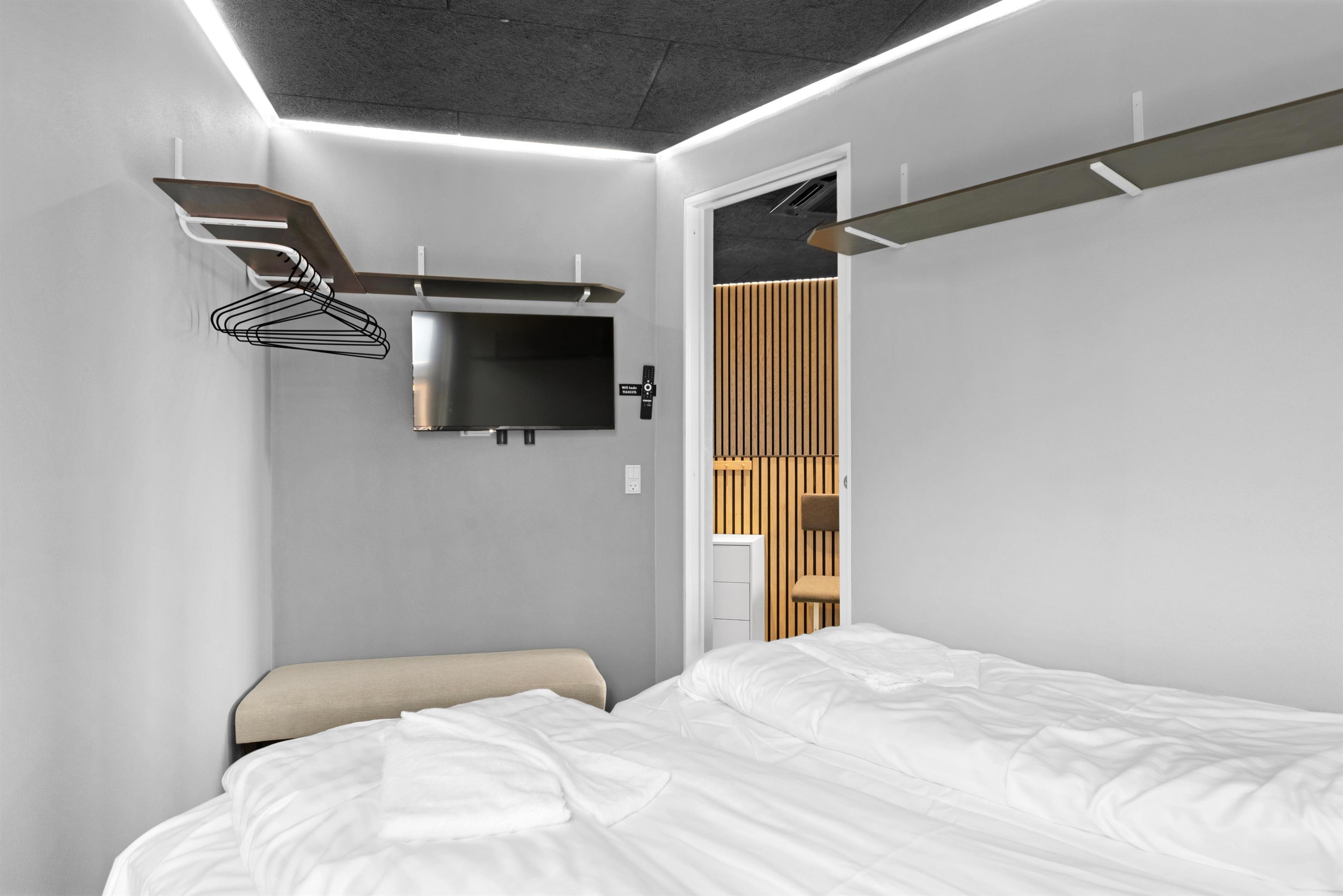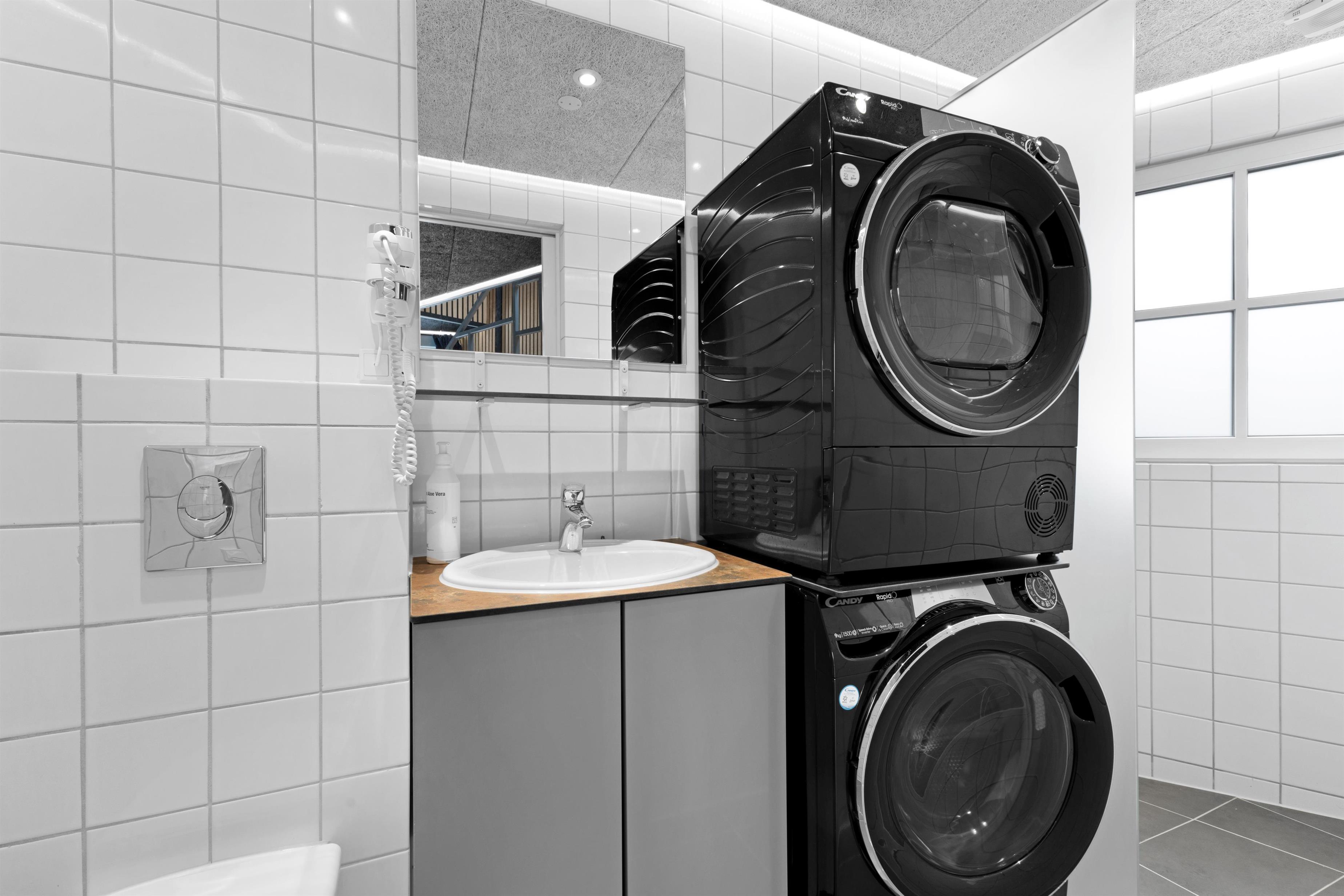 Die Hotelapartments bieten Platz für 6 Gäste mit vier Etagenbetten und einem Doppelbett – alle Schlafplätze befinden sich im ersten Stock. Wenn Sie weniger Personen sind, können Sie die Etagenbetten in die Wände einklappen, was den Raum besonders praktisch macht und ihm einen coolen Stil verleiht. Jeder Quadratmeter erfüllt eine bestimmte Funktion, und hier finden Sie alles, was Sie für eine Übernachtung in der Nähe von Blokhus benötigen, mitten in einer künstlerischen Erlebniswelt.