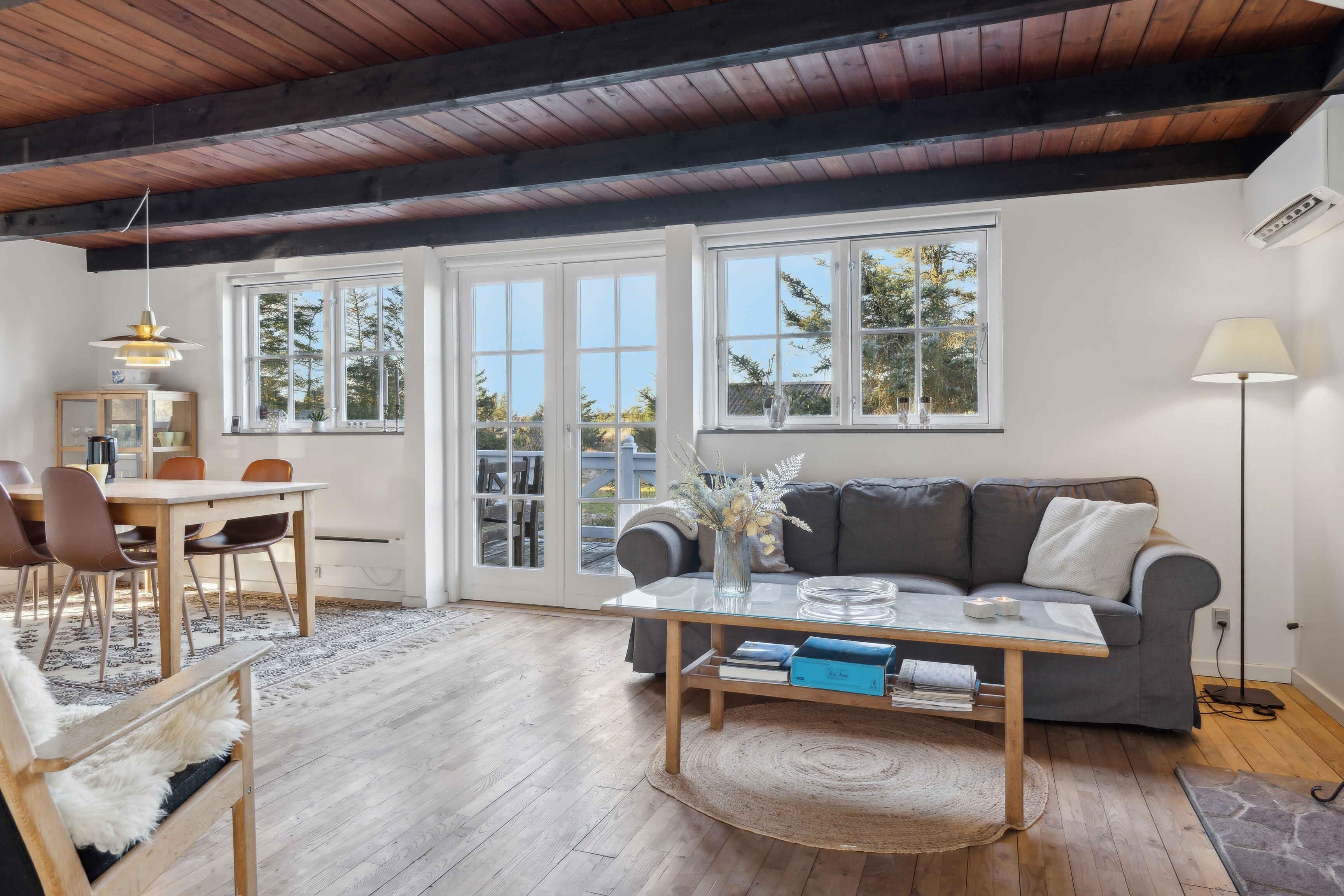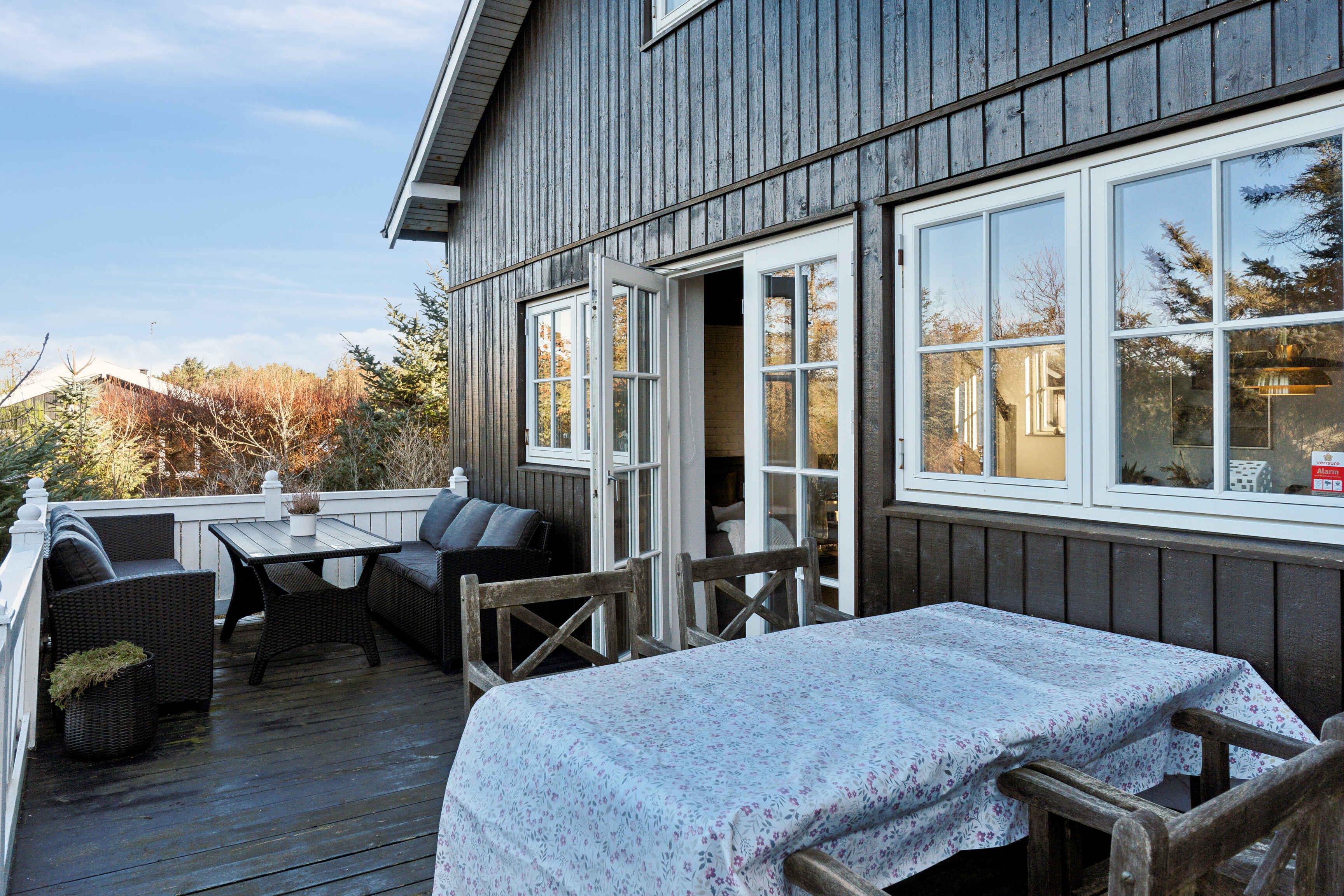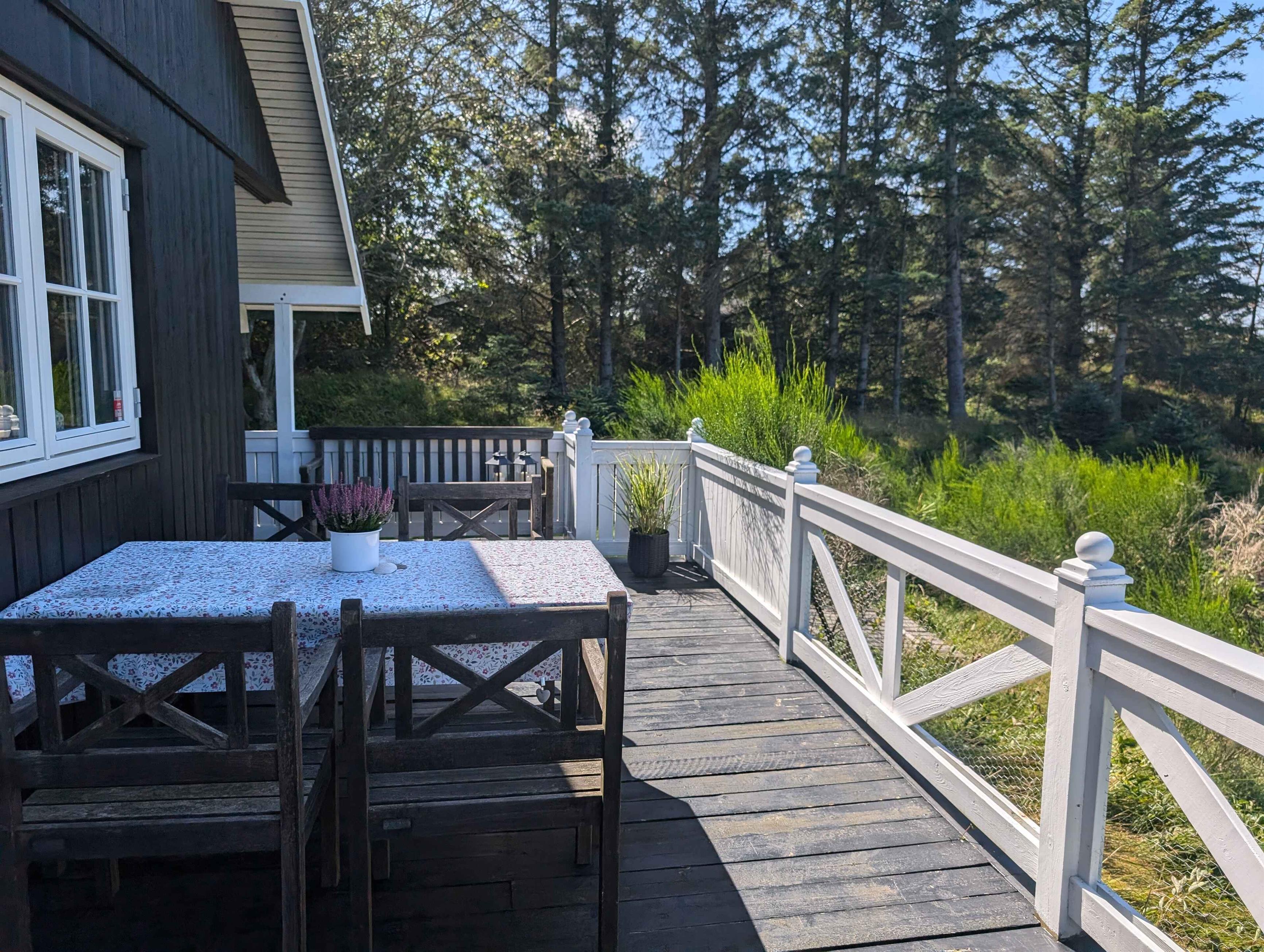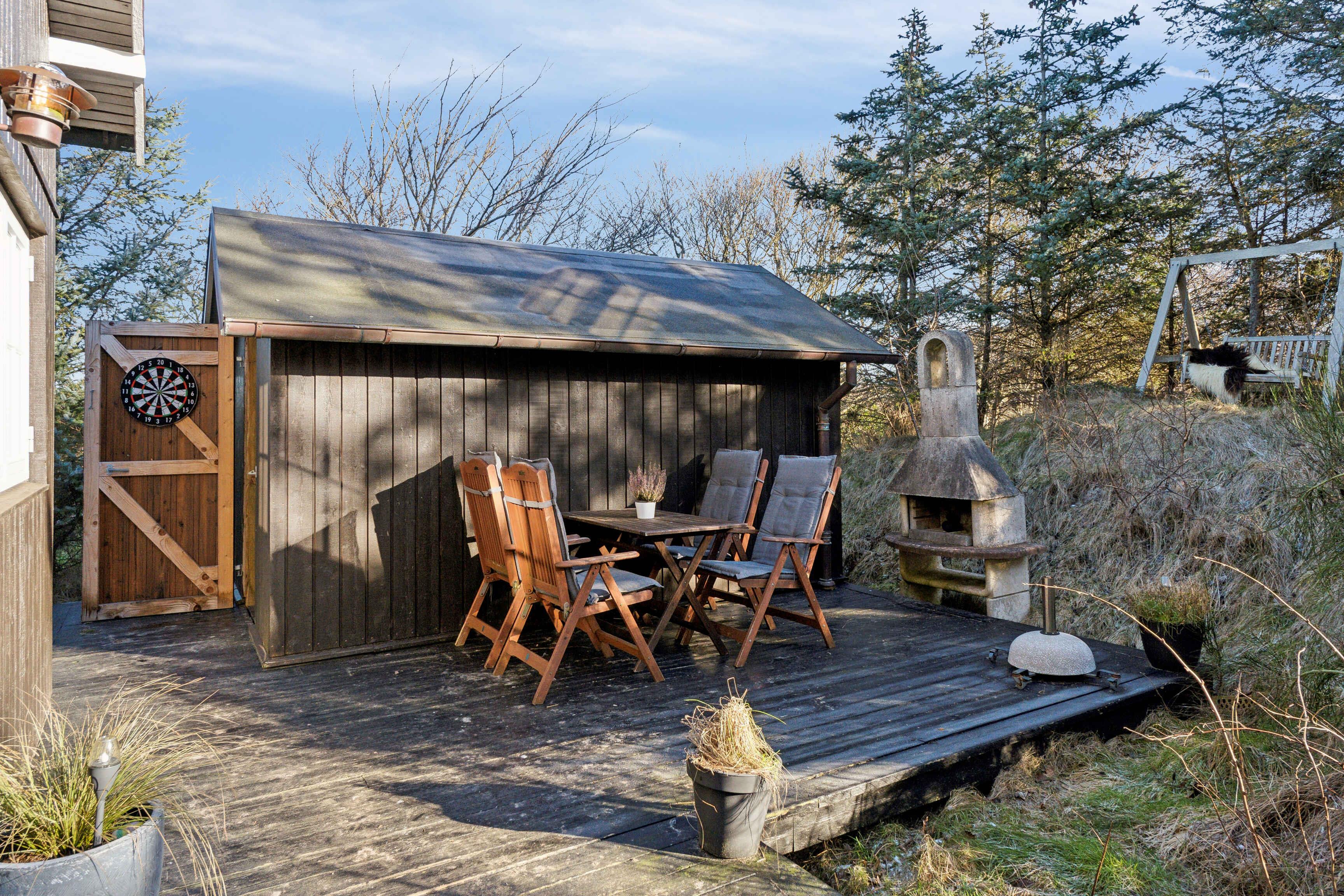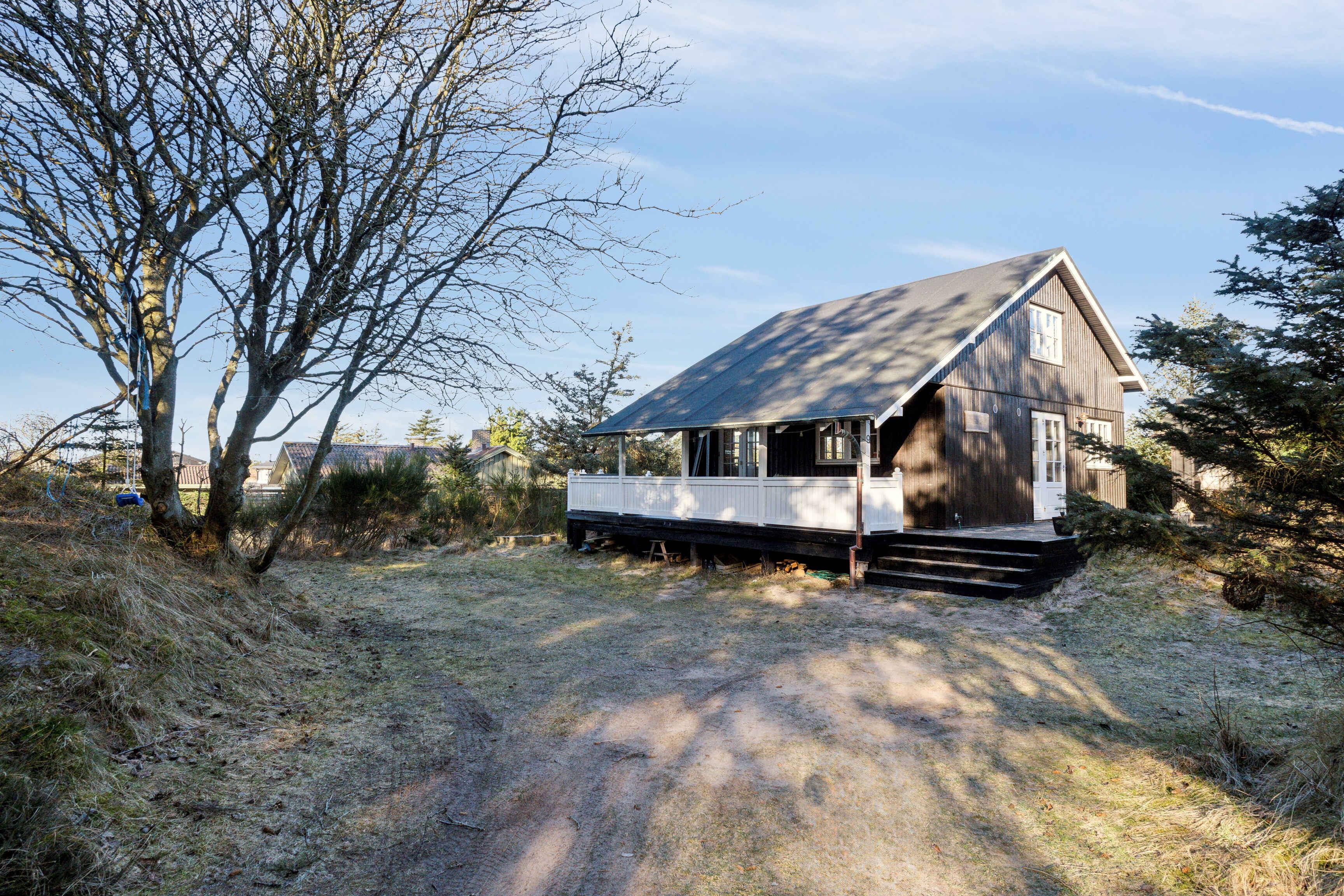 In einer malerischen Lage direkt am Wald in Blokhus befindet sich dieses charmante Ferienhaus, das zu echter Urlaubsstimmung einlädt. Das Haus liegt gut zurückgezogen und völlig ungestört von der Straße und den Nachbarn. Trotz dieser ruhigen Lage sind es nur etwa 10 Minuten zu Fuß bis ins pulsierende Zentrum von Blokhus mit Geschäften, Cafés, Einkaufsmöglichkeiten und natürlich dem schönsten Strand der Westküste, dem Blokhus Strand. Nur ein paar hundert Meter vom Haus entfernt liegt das Naturgebiet Gateway mit Mountainbike-Strecken, Lauf- und Trainingsrouten, einem großen Waldspielplatz, Picknickplätzen, Feuerstellen und mehr. Im Winter werden hier zudem Loipen für Langlaufskifahrer angelegt. Das Haus erstreckt sich über zwei Etagen und bietet Platz für 5 Personen, verteilt auf 3 gemütliche Schlafzimmer mit 2 Doppelbetten (180 x 200 cm) und 1 Einzelbett (90 x 200 cm). Eines der Schlafzimmer verfügt außerdem über einen kleinen Tischkicker sowie Spielzeug wie Barbies, Autos, Bücher, Stifte, Malbücher und anderes Spielzeug. Alle drei Schlafzimmer befinden sich im ersten Stock, wo es auch eine Toilette gibt. Im Erdgeschoss befinden sich ein Badezimmer mit Dusche, eine gut ausgestattete Küche mit Kühl-Gefrierkombination und Geschirrspüler, ein Essbereich sowie ein gemütliches Wohnzimmer mit Holzofen und moderner Wärmepumpe. Draußen können Sie eines der Outdoorspiele auf dem Rasen genießen oder sich auf einer der Terrassen entspannen, wo Sie den ganzen Tag Sonne haben und oft Rehe und Eichhörnchen auf dem Grundstück beobachten können. Bei schlechtem Wetter können Sie die überdachte Terrasse nutzen, auf der Sie das ganze Jahr über trocken und gemütlich sitzen können – selbst in der Dunkelheit ist es hier schön, sich mit einer Decke bei Kerzenlicht zu entspannen und die Aussicht zu genießen. Die nach Westen und Süden ausgerichtete Terrasse ist hundefreundlich eingezäunt und hat Zugang vom Wohnzimmer und Essbereich. Eine Tür kann geöffnet oder geschlossen werden, um den Zugang zum Grundstück zu regeln. Im Schuppen gibt es zwei ältere Fahrräder, die genutzt werden können, sowie einen Weber-Gasgrill, einen Holzkohlegrill und verschiedene Outdoorspiele. Achtung: Wird nicht für gewerbliche Nutzung vermietet.