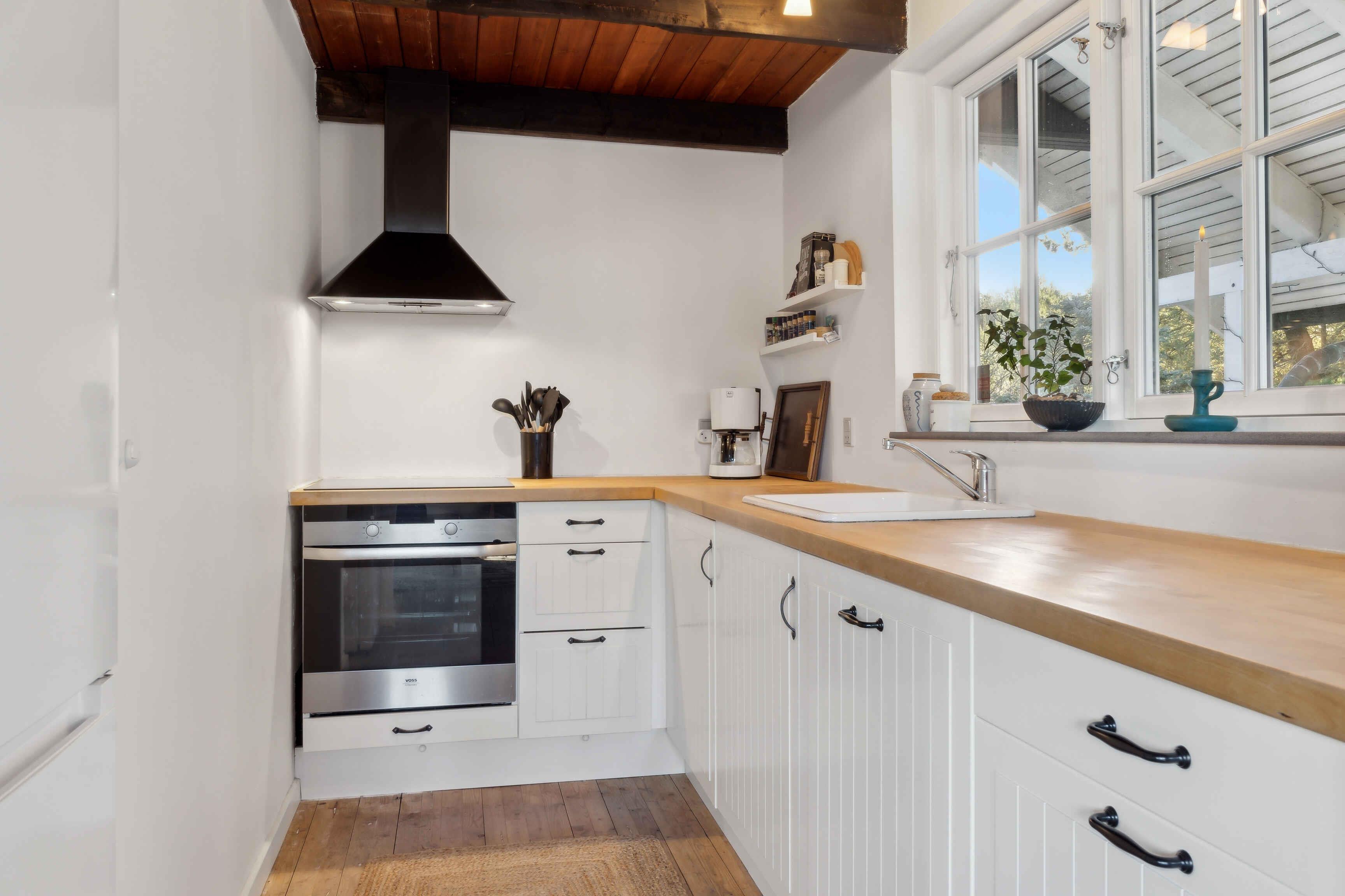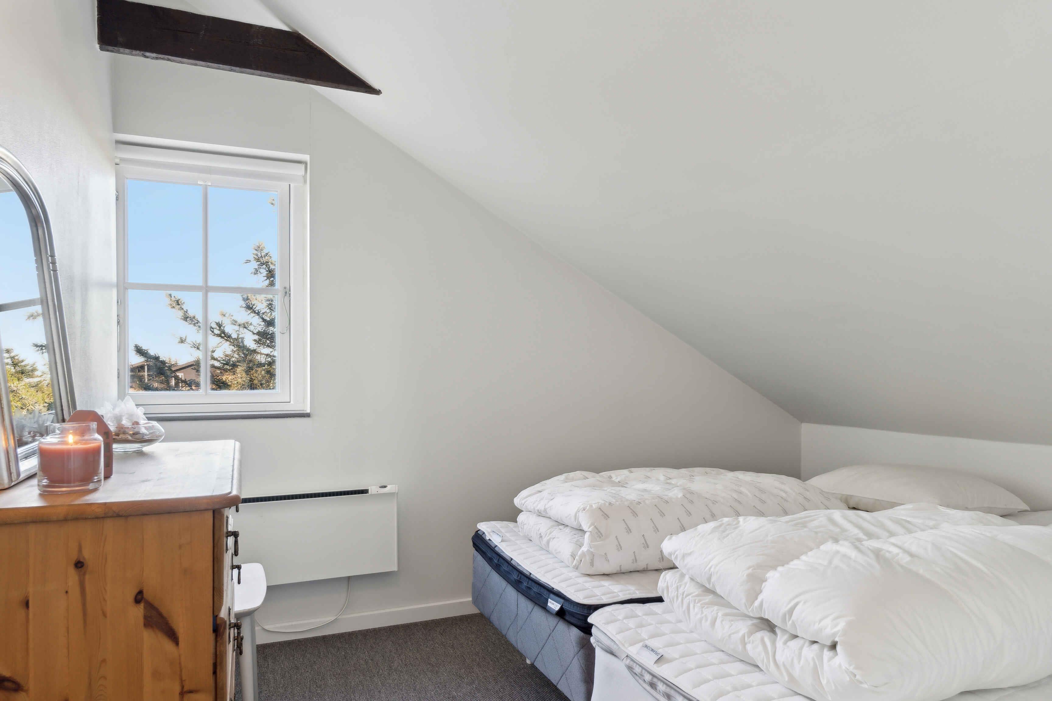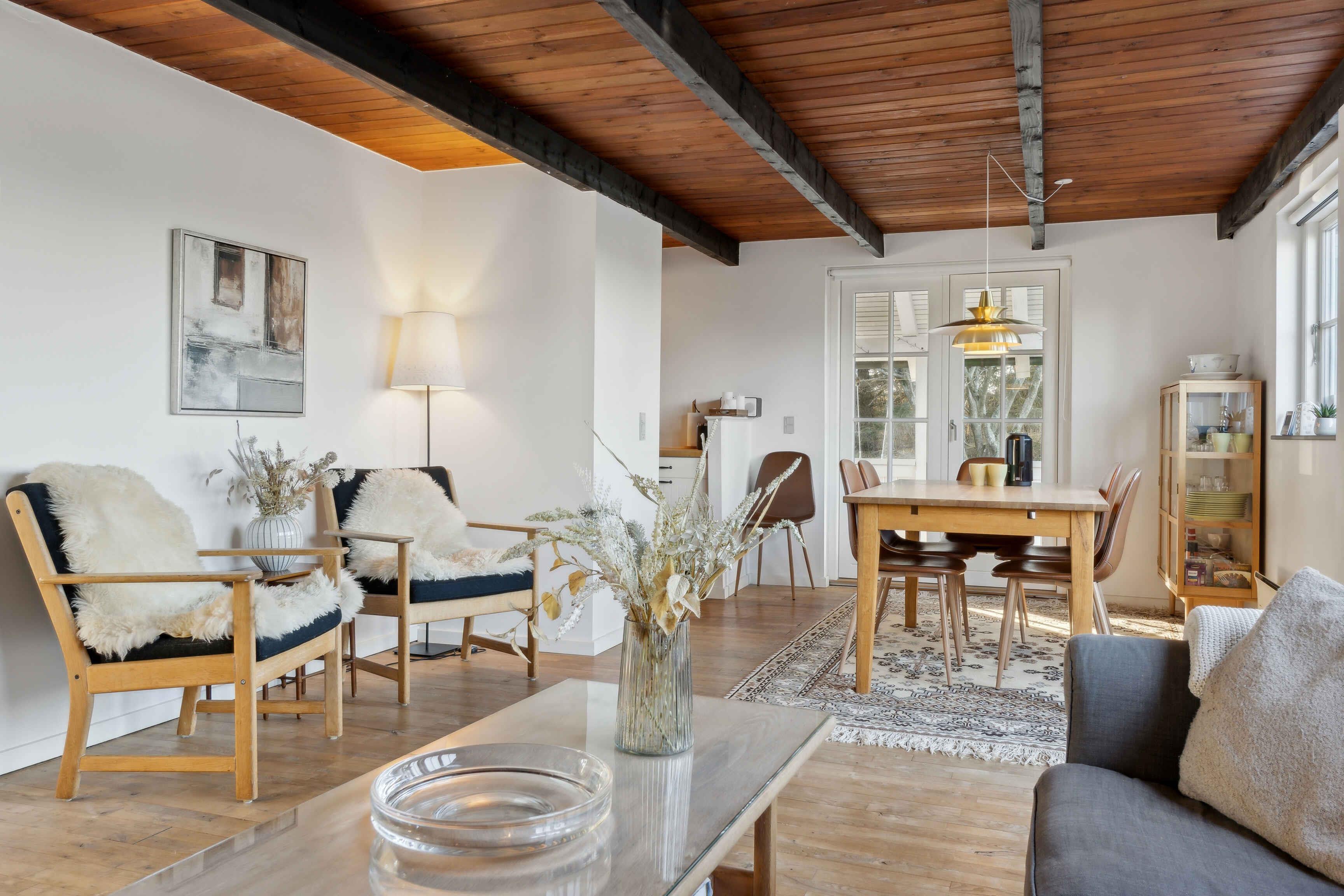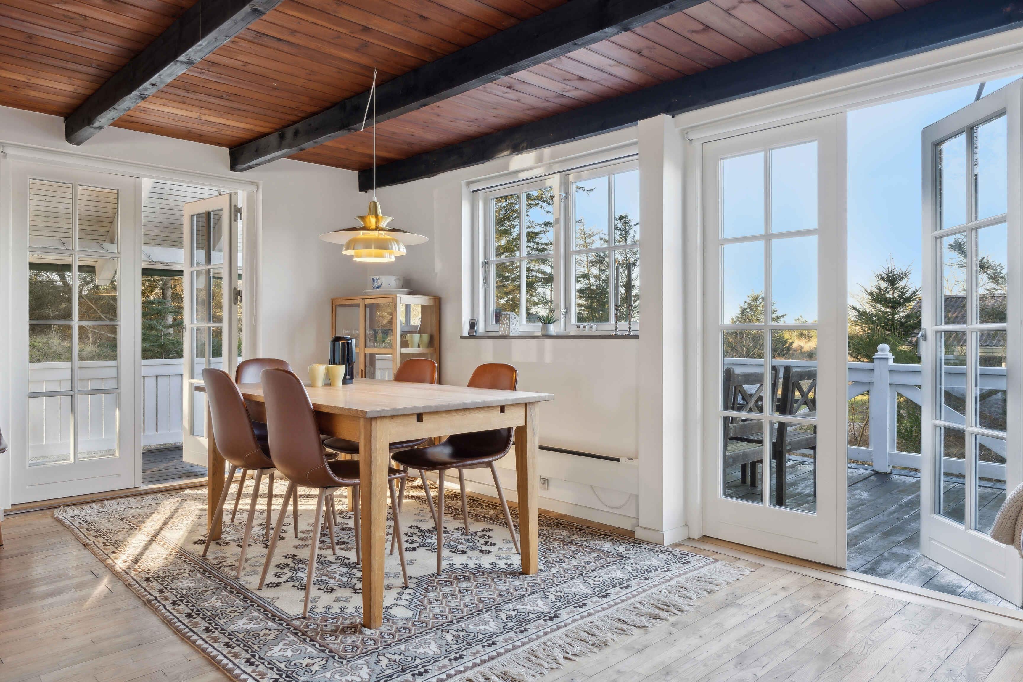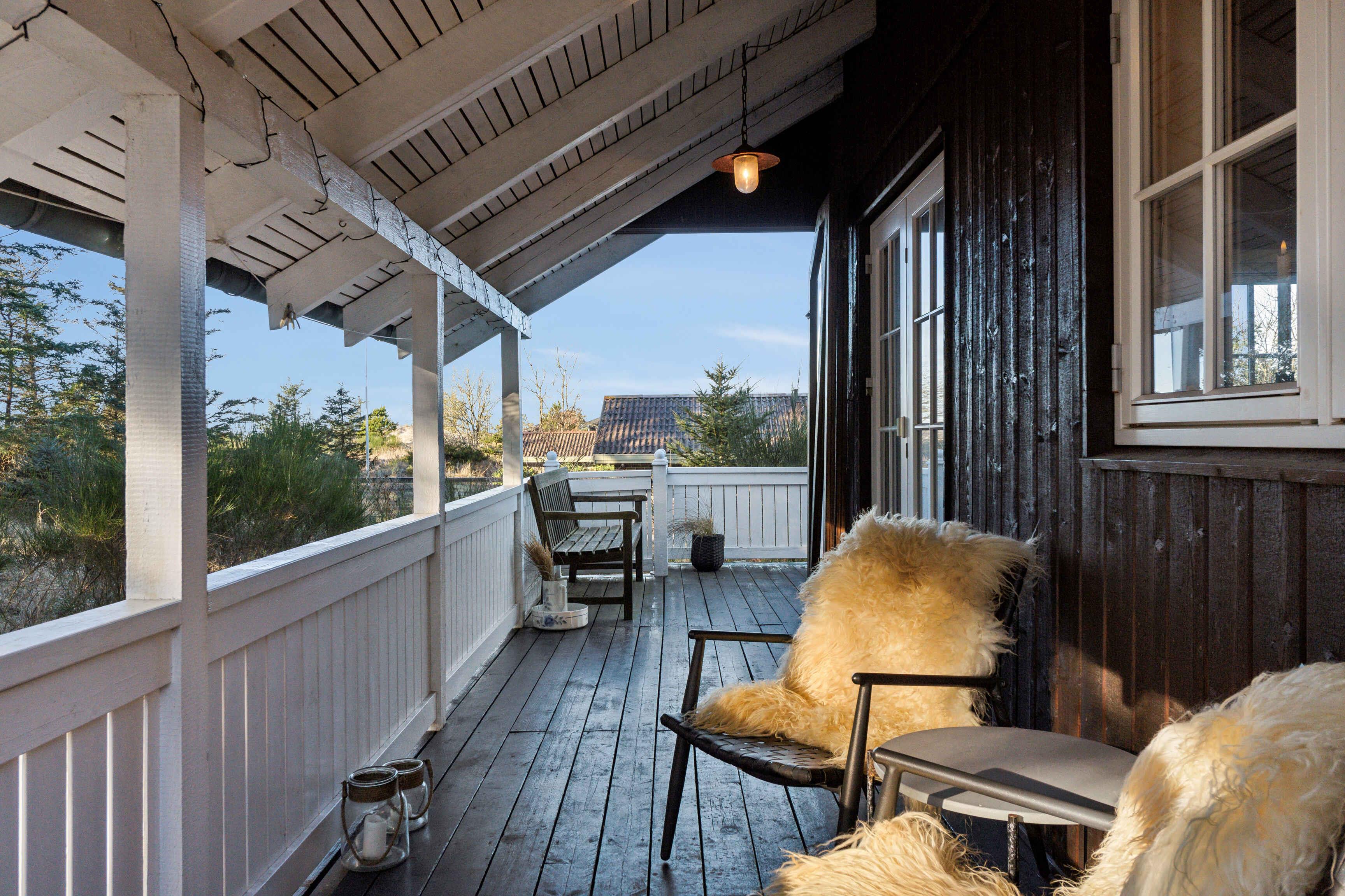 In einer malerischen Lage direkt am Wald in Blokhus befindet sich dieses charmante Ferienhaus, das zu echter Urlaubsstimmung einlädt. Das Haus liegt gut zurückgezogen und völlig ungestört von der Straße und den Nachbarn. Trotz dieser ruhigen Lage sind es nur etwa 10 Minuten zu Fuß bis ins pulsierende Zentrum von Blokhus mit Geschäften, Cafés, Einkaufsmöglichkeiten und natürlich dem schönsten Strand der Westküste, dem Blokhus Strand. Nur ein paar hundert Meter vom Haus entfernt liegt das Naturgebiet Gateway mit Mountainbike-Strecken, Lauf- und Trainingsrouten, einem großen Waldspielplatz, Picknickplätzen, Feuerstellen und mehr. Im Winter werden hier zudem Loipen für Langlaufskifahrer angelegt. Das Haus erstreckt sich über zwei Etagen und bietet Platz für 5 Personen, verteilt auf 3 gemütliche Schlafzimmer mit 2 Doppelbetten (180 x 200 cm) und 1 Einzelbett (90 x 200 cm). Eines der Schlafzimmer verfügt außerdem über einen kleinen Tischkicker sowie Spielzeug wie Barbies, Autos, Bücher, Stifte, Malbücher und anderes Spielzeug. Alle drei Schlafzimmer befinden sich im ersten Stock, wo es auch eine Toilette gibt. Im Erdgeschoss befinden sich ein Badezimmer mit Dusche, eine gut ausgestattete Küche mit Kühl-Gefrierkombination und Geschirrspüler, ein Essbereich sowie ein gemütliches Wohnzimmer mit Holzofen und moderner Wärmepumpe. Draußen können Sie eines der Outdoorspiele auf dem Rasen genießen oder sich auf einer der Terrassen entspannen, wo Sie den ganzen Tag Sonne haben und oft Rehe und Eichhörnchen auf dem Grundstück beobachten können. Bei schlechtem Wetter können Sie die überdachte Terrasse nutzen, auf der Sie das ganze Jahr über trocken und gemütlich sitzen können – selbst in der Dunkelheit ist es hier schön, sich mit einer Decke bei Kerzenlicht zu entspannen und die Aussicht zu genießen. Die nach Westen und Süden ausgerichtete Terrasse ist hundefreundlich eingezäunt und hat Zugang vom Wohnzimmer und Essbereich. Eine Tür kann geöffnet oder geschlossen werden, um den Zugang zum Grundstück zu regeln. Im Schuppen gibt es zwei ältere Fahrräder, die genutzt werden können, sowie einen Weber-Gasgrill, einen Holzkohlegrill und verschiedene Outdoorspiele. Achtung: Wird nicht für gewerbliche Nutzung vermietet.