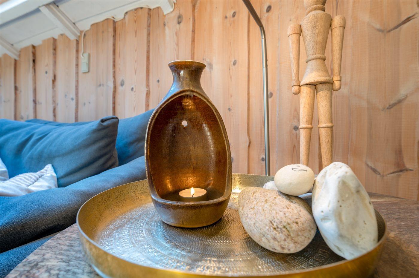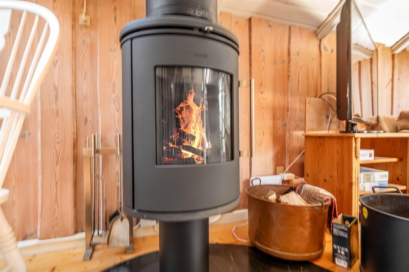 Draußen liegt das Haus auf einem schönen Naturgrundstück mit mehreren gemütlichen Wegen auf dem teilweise bewachsenen Grundstück. Hier gibt es gute Terrassen und eine gemütliche Feuerstelle mitten in der Natur.