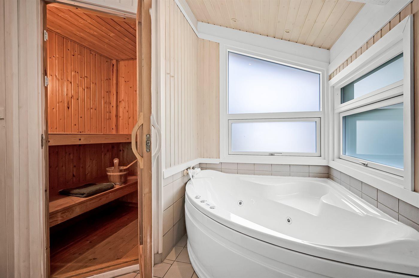 Badezimmer verfügt sowohl über eine Badewanne als auch Zugang zur Sauna, ideal zur Entspannung nach einem Strandtag.