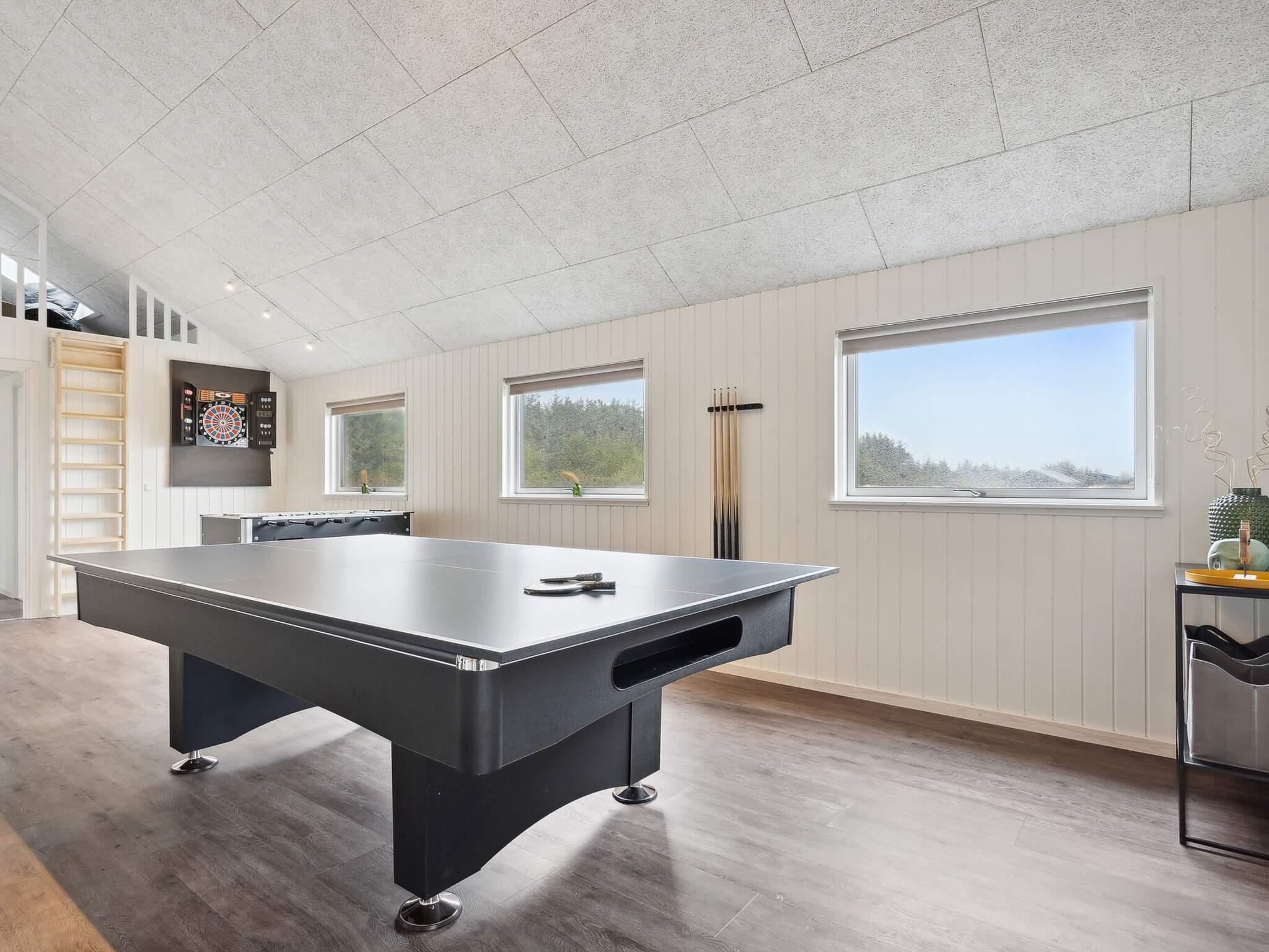 Vom Wohnzimmer führen Doppeltüren direkt in den Aktivitätsraum, der Unterhaltung für Groß und Klein bietet. Hier können Sie sich bei Tischtennis, Billard, Darts oder Tischfußball messen oder in der Sofaecke mit einem Getränk von der Bar entspannen. Wenn Sie sich austoben oder die Lust auf Wasser packt, erwartet Sie ganzjährig der Poolbereich mit Rutsche und wohltuender Badewanne.