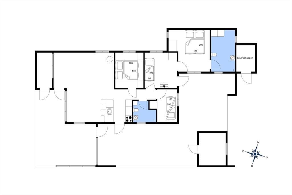 Im großen Wohnbereich des Hauses, in dem Stube und Küche kombiniert sind, sind in drei Himmelsrichtungen Fenster eingebaut, sodass du den ganzen Tag hindurch einen guten Lichteinfall hast. Das bedeutet auch, dass du dich an der schönen Umgebung erfreuen kannst, obwohl du es dir drinnen in der Nähe des Brennofens gemütlich machst oder im offenen Küchenbereich das Essen zubereitest. In den drei Schlafzimmern kannst du die Aussicht zu den Kiefern und dem blauen Himmel genießen – und ebenfalls im Durchgangszimmer, wo ein zusätzliches Schlafsofa steht.