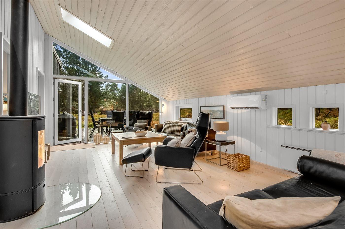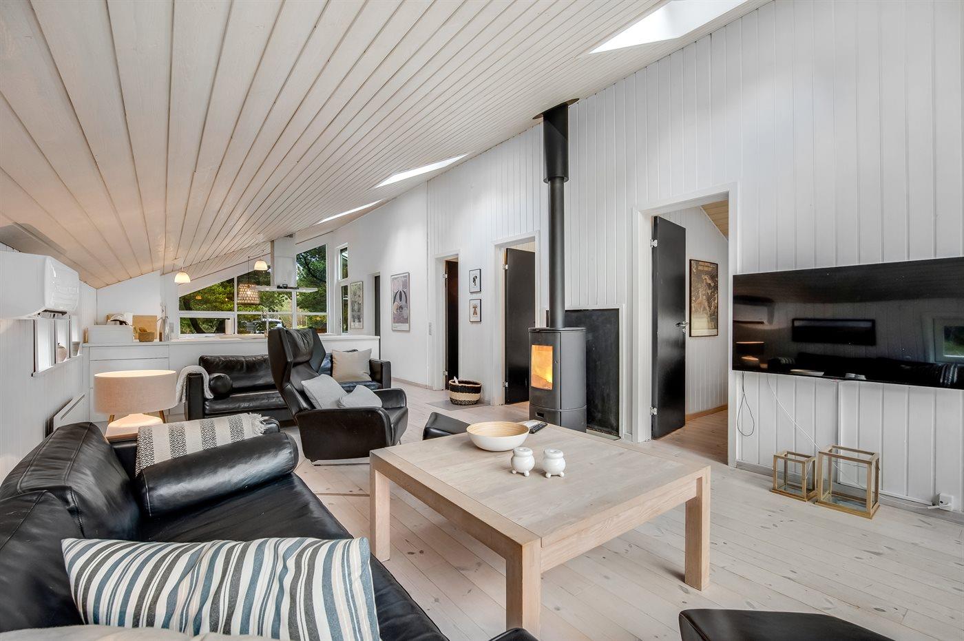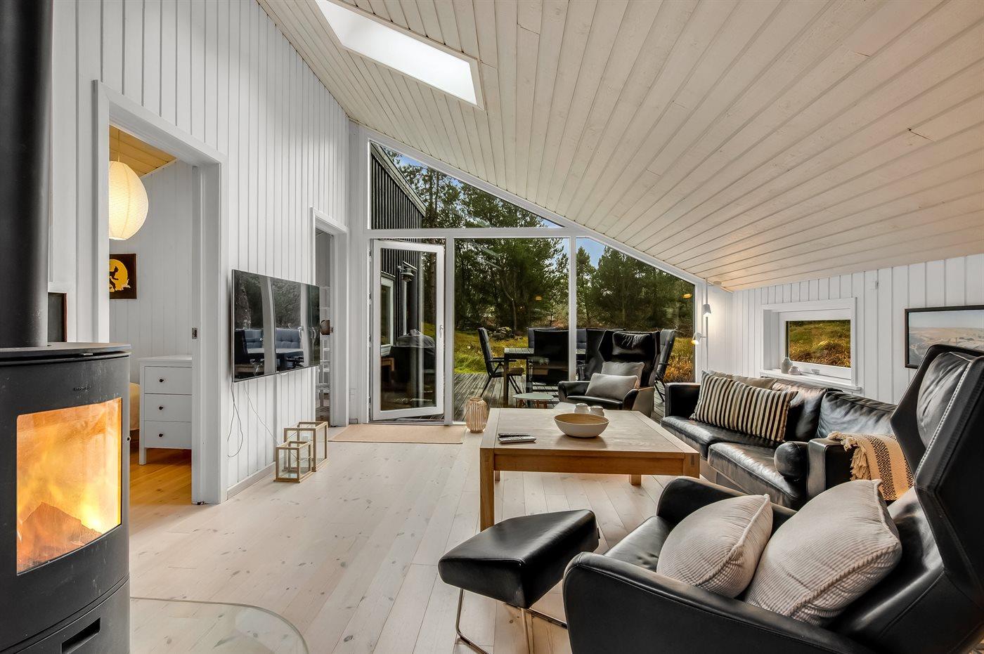 Das Ferienhaus, das hell und einladend hervor tritt, ist mit bequemen Möbeln ausgestattet, verfügt über vier Schlafzimmer, einen großen Küchen-Essbereich, ein Badezimmer mit Whirlpool und Sauna sowie ein gemütliches Wohnzimmer mit Kaminofen. Vom Wohnzimmer aus gelangt man auf eine große, nach Süden hin ausgerichtete Terrasse, auf der man Stunden im Freien genießen, sich entspannen und grillen kann.