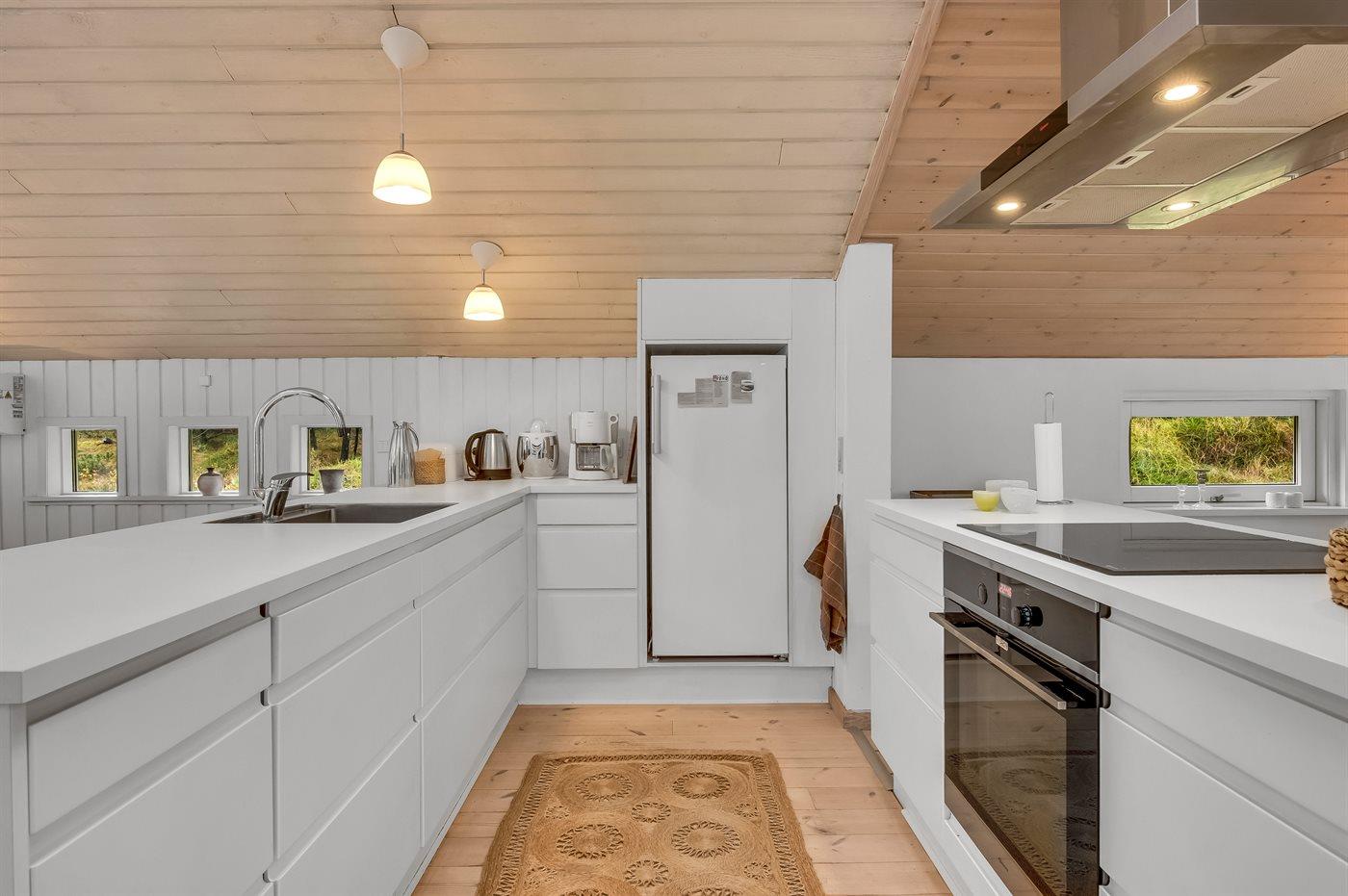 Die Küche ist mit Kühlschrank ausgestattet. Außerdem gibt es 4 Induktions-Kochzonen, Umluftofen sowie Geschirrspüler.
