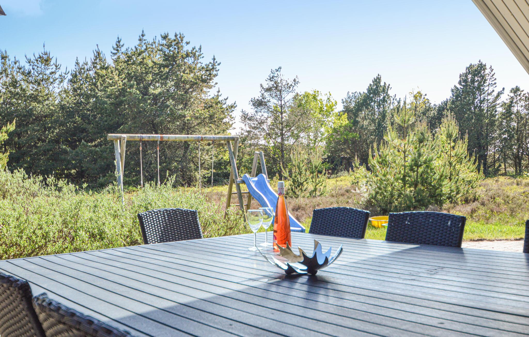 Rund um das Haus gibt es mehrere große und ungestörte Terrassen mit schönen Gartenmöbeln. Die Kinder können auf der Schaukel und der Rutsche spielen, die von der Terrasse aus gesehen werden können. Auf dem Grundstück gibt es Platz für 3 Autos zum Parken - all dies macht das Ferienhaus gut geeignet für Ferien mit mehreren Familien oder Generationen, die einen erholsamen Urlaub zusammen verbringen möchten.