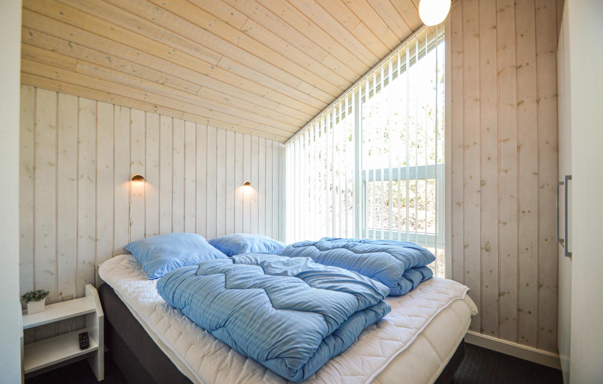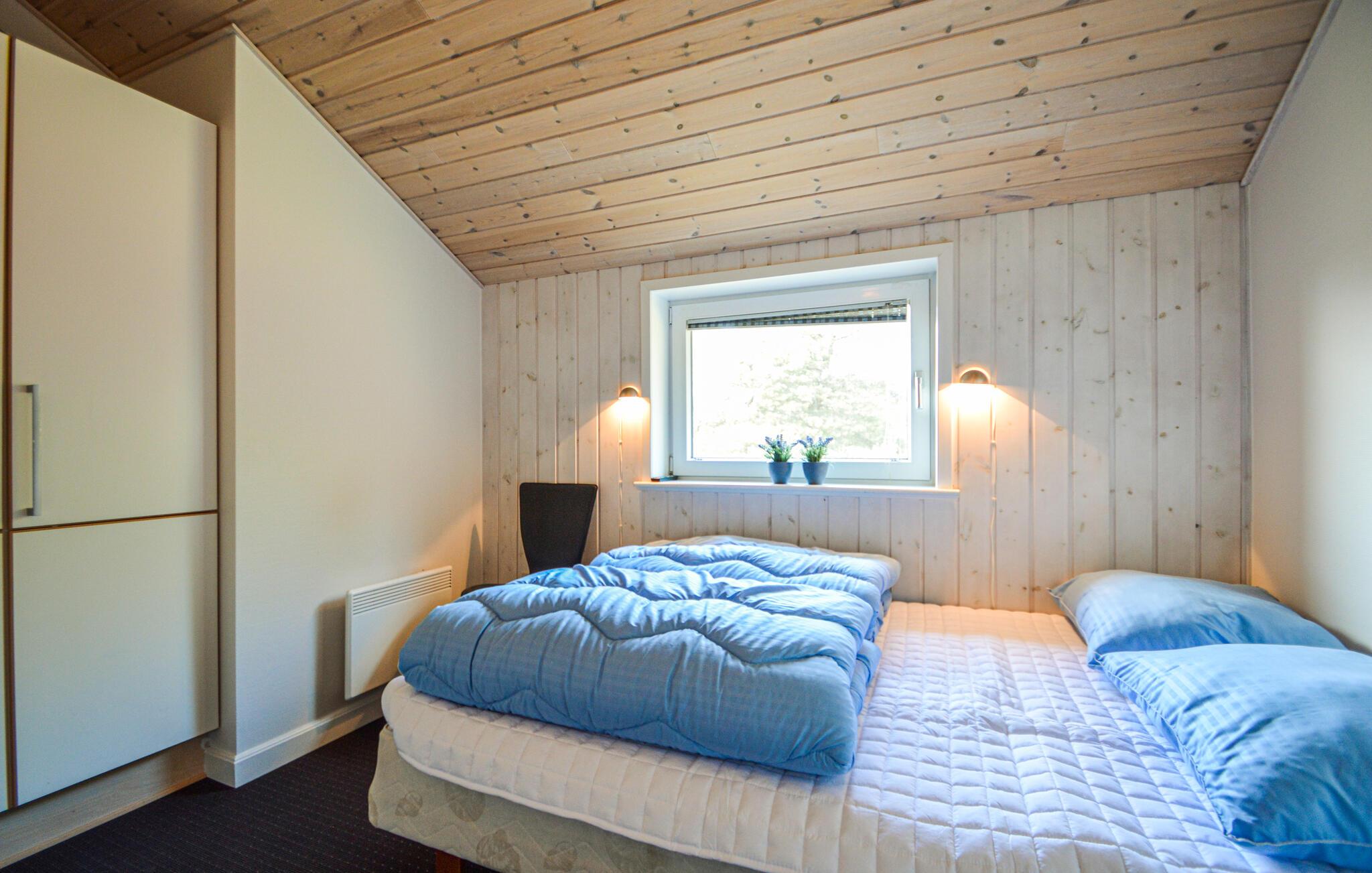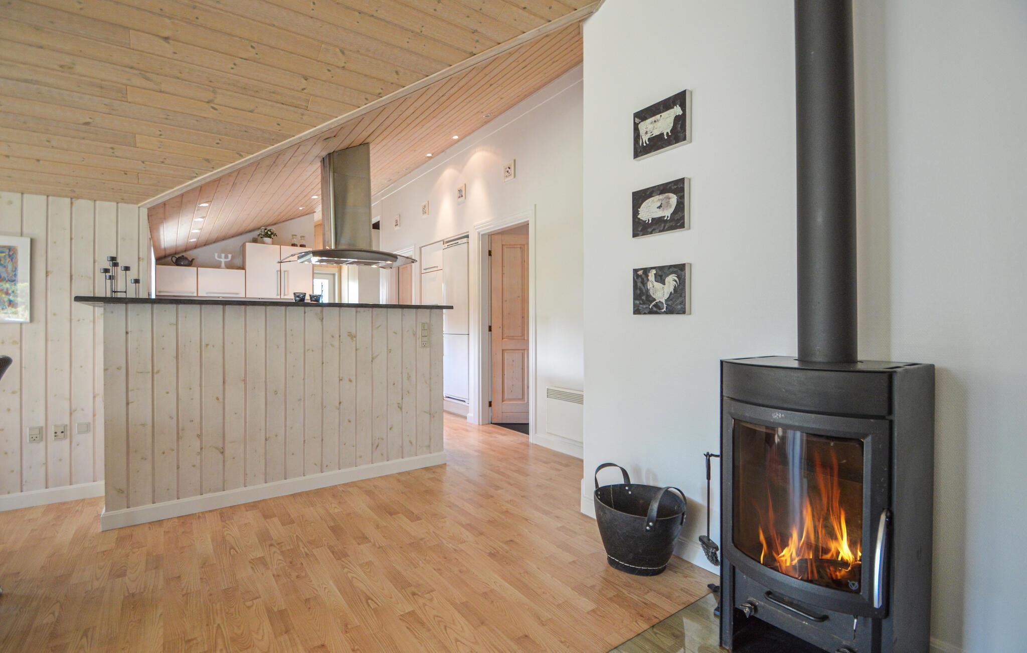 Wirklich schönes Ferienhaus auf einem fantastischen Naturgrundstück in der wunderschönen Bolilmark Ferienhausgegend. Hier ist Platz für 8 Personen in 4 schönen Schlafzimmern mit viel Stauraum. In einem der 2 Badezimmer können Sie im großen 4-Personen-Whirlpool, in der Sauna oder in der Dusche/Dampfkabine wunderbar entspannen. Im zweiten schönen Badezimmer mit Dusche finden Sie die Waschmaschine und den Trockner, sodass Sie nicht mit einem Koffer voller schmutziger Wäsche nach Hause reisen müssen. Die Küche ist mit dem Ess- und Wohnzimmer verbunden und bietet Platz für alle am Esstisch, außerdem ein bequemes Ecksofa und einen wunderschönen Holzofen, der an kühlen Tagen eine gute Atmosphäre schafft.