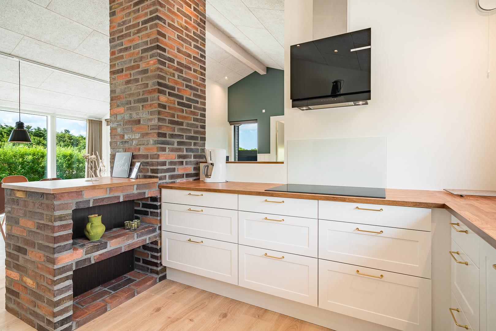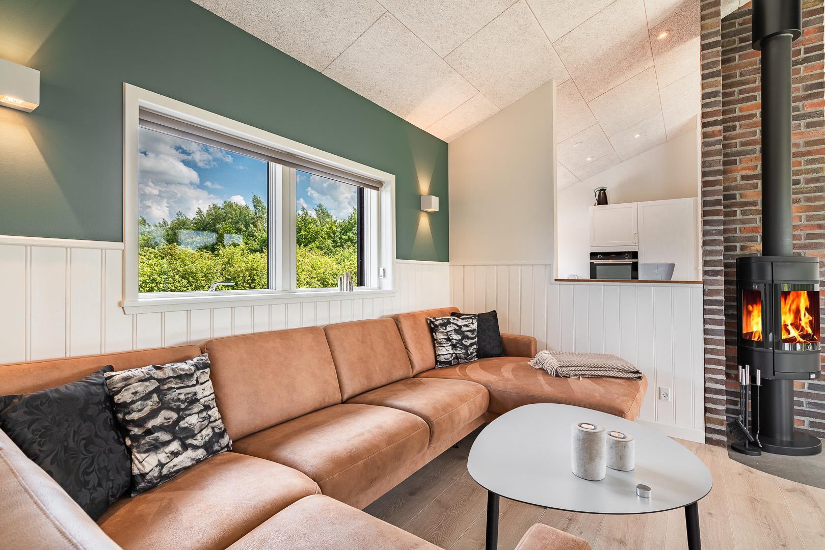 Im hellen, modern eingerichteten Wohnbereich erwartet euch eine gemütliche Atmosphäre mit viel Tageslicht, bequemen Sitzmöbel und einem Kamin, der besonders an kühleren Tagen für wohlige Wärme sorgt. Eine Wärmepumpe ergänzt das angenehme Raumklima effizient und umweltfreundlich. Direkt angrenzend befindet sich die offene Küche, welche mit allem ausgestattet ist, was das Selbstversorgerherz benötigt, inklusive einer Spülmaschine für höchsten Komfort im Alltag. Am großen Esstisch kommen alle zusammen – zum Essen, Spielen oder einfach zum Beisammensein.