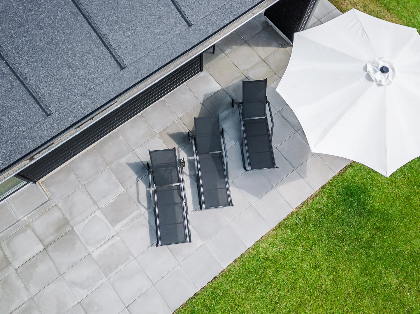 Auf der großen, teilweise überdachten Terrasse könnt ihr den Tag mit einem gemütlichen Frühstück im Freien beginnen oder abends den Sonnenuntergang genießen.