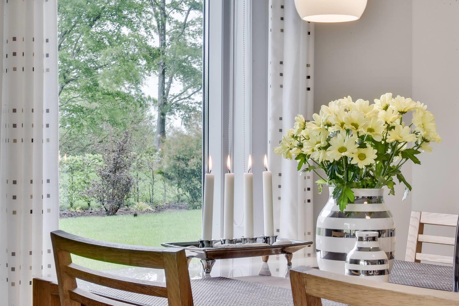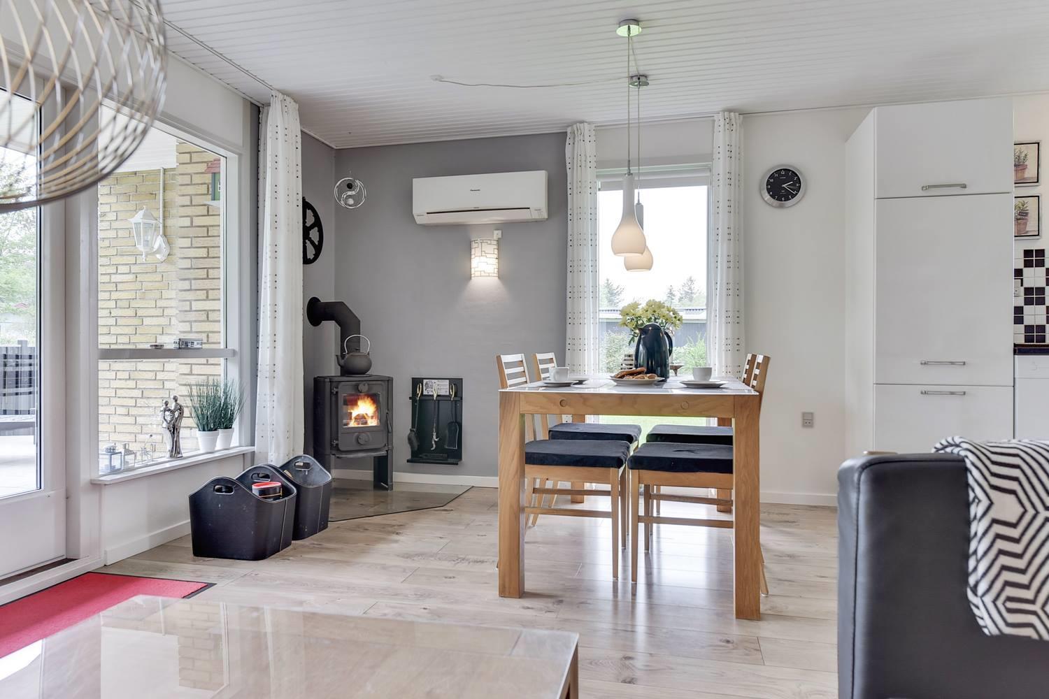 Der offene Wohn- und Essbereich ist das Herz des Ferienhauses. Hier sitzt du auf dem Sofa vor dem Kamin, genießt die Wärme und lässt den Tag entspannt ausklingen. Große Fenster sorgen für viel Tageslicht und schaffen ein angenehmes Raumgefühl.