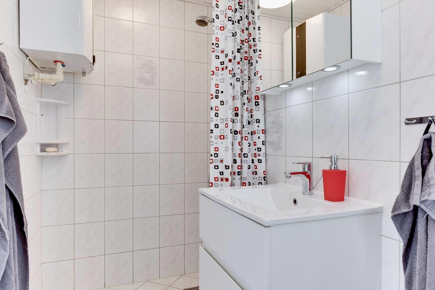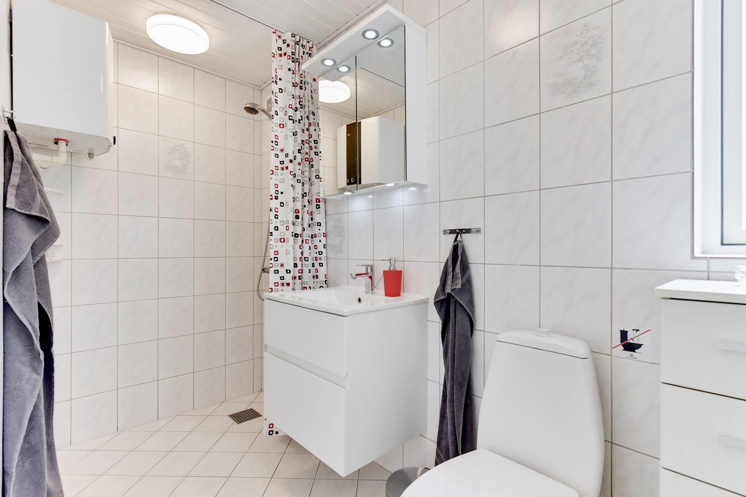 Eine Wärmepumpe und eine Fußbodenheizung im Badezimmer sorgen für angenehme Temperaturen zu jeder Jahreszeit – und ein kleiner Safe bietet zusätzliche Sicherheit für deine Wertsachen.