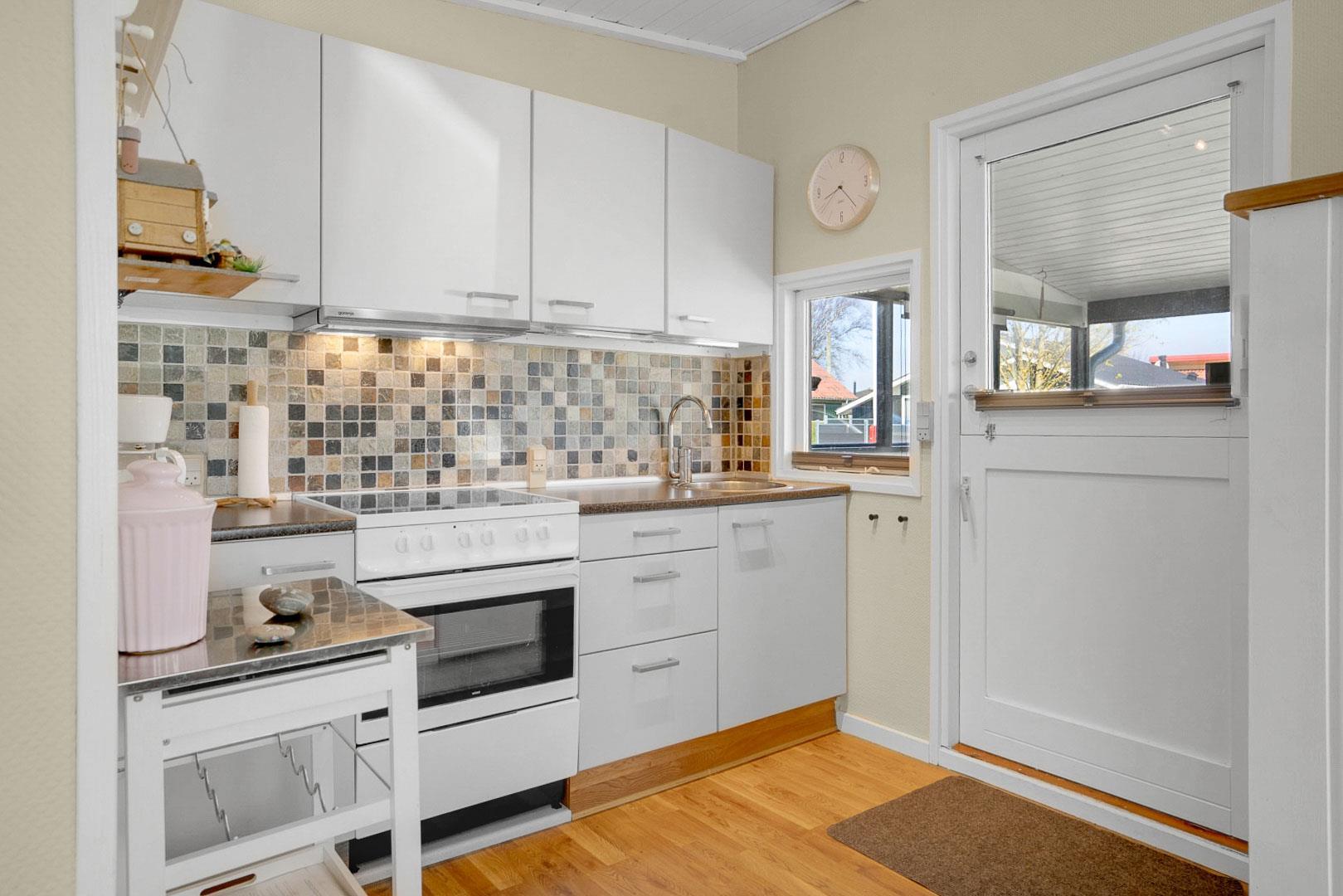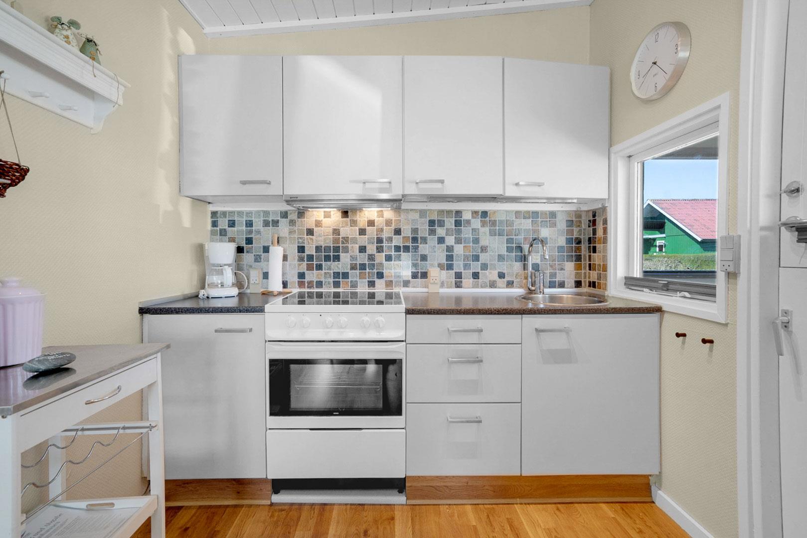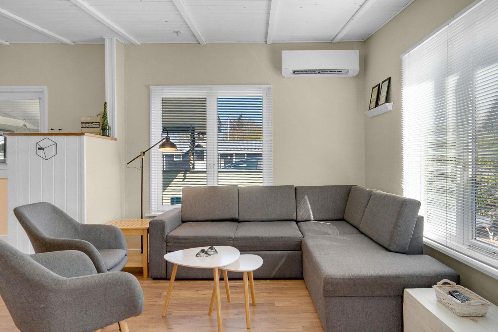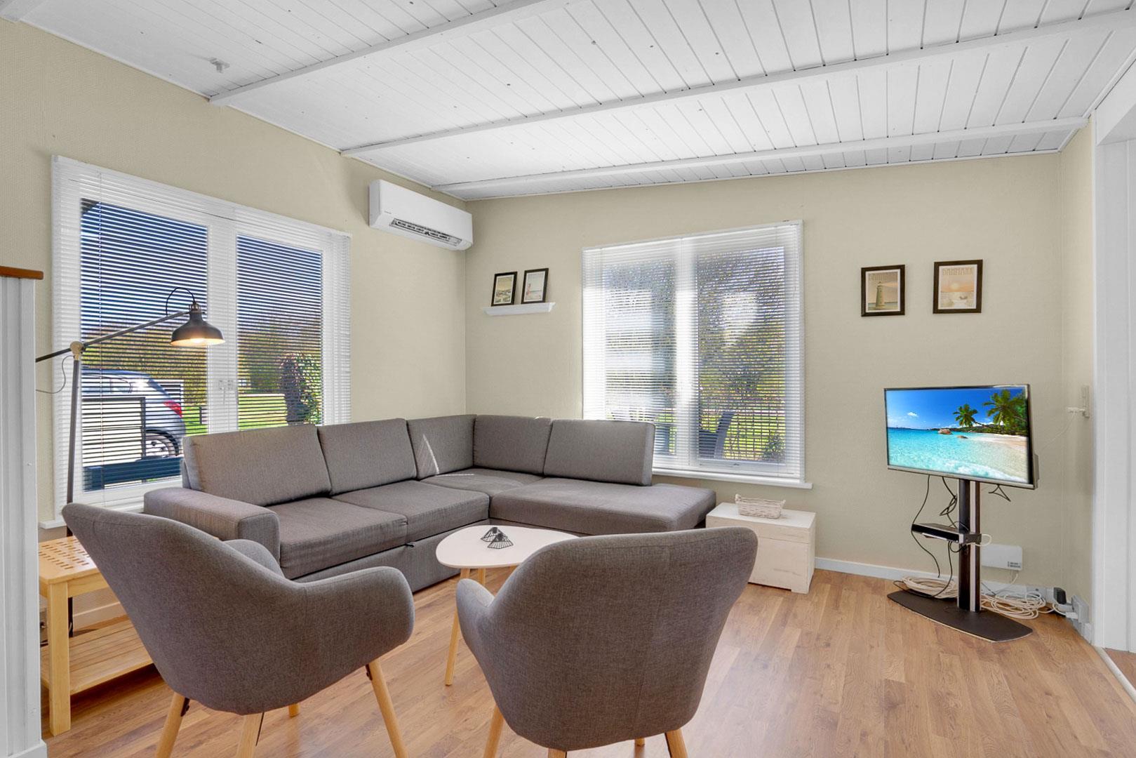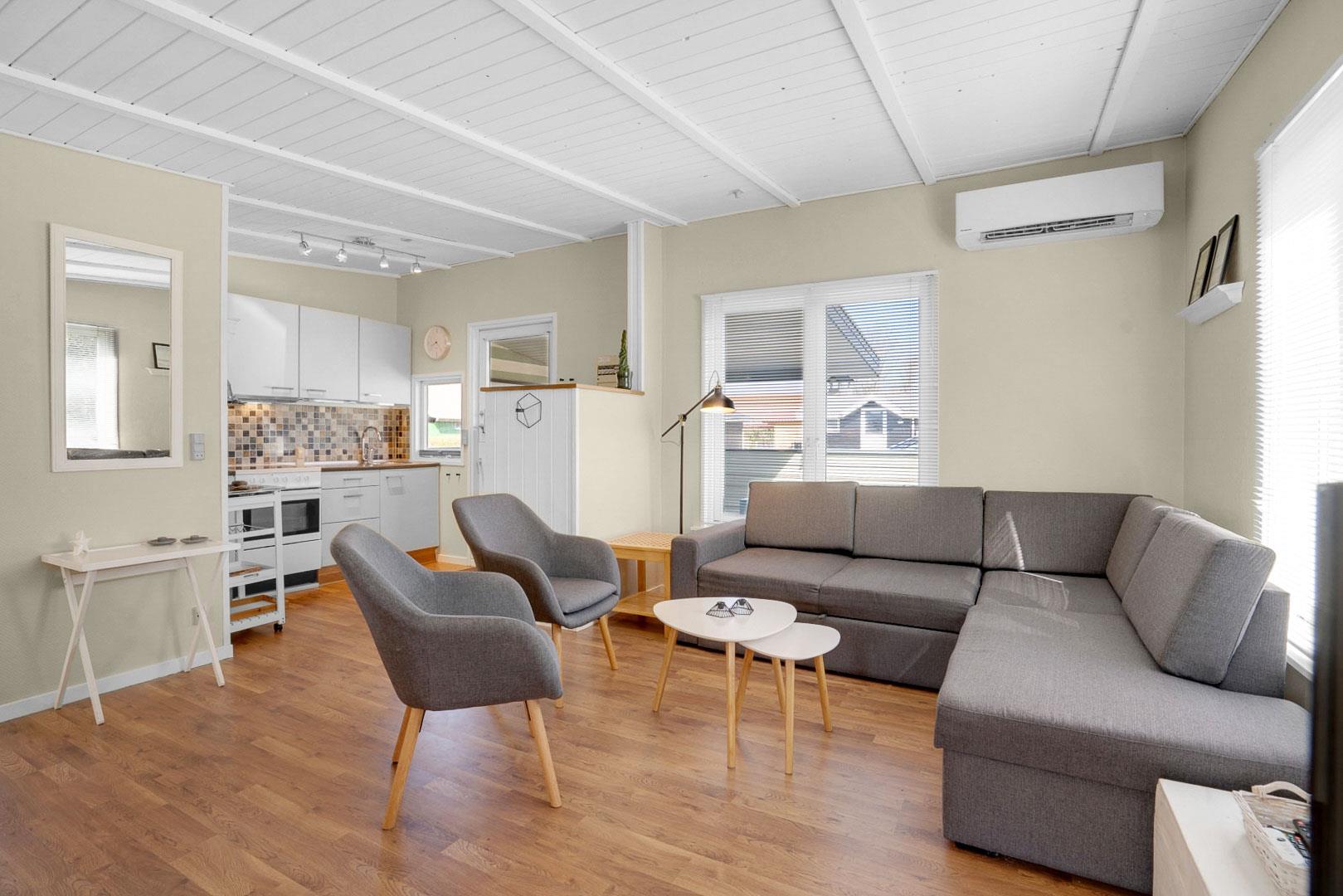 Das Ferienhaus ist modern und freundlich eingerichtet. Der Wohnbereich mit bequemer Sitzecke, Fernseher und Wärmepumpe sorgt das ganze Jahr über für angenehme Temperaturen – ob an kühlen Frühlingstagen oder warmen Sommertagen. Die offene Küche ist gut ausgestattet und lädt dazu ein, gemeinsam zu kochen und zu genießen.