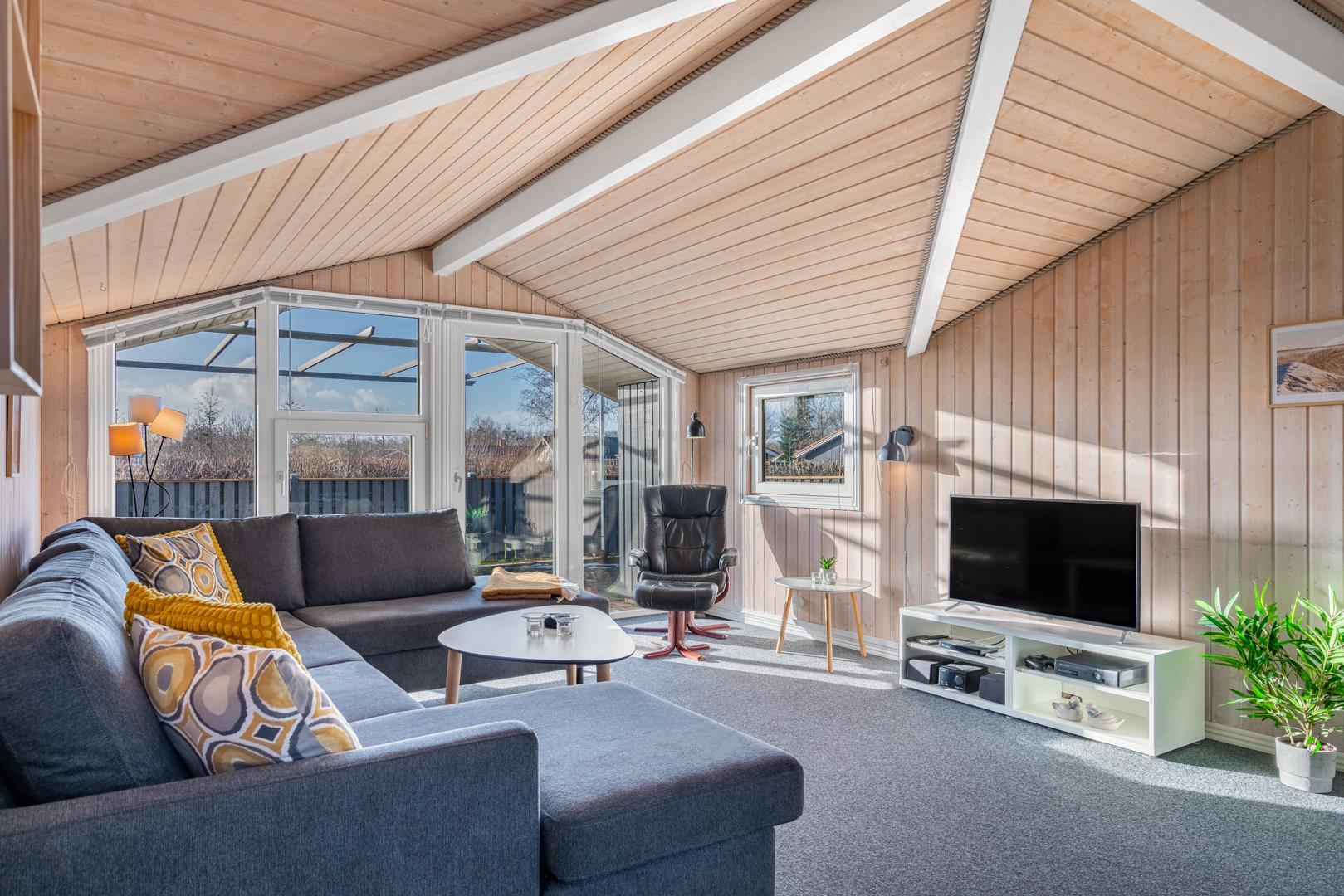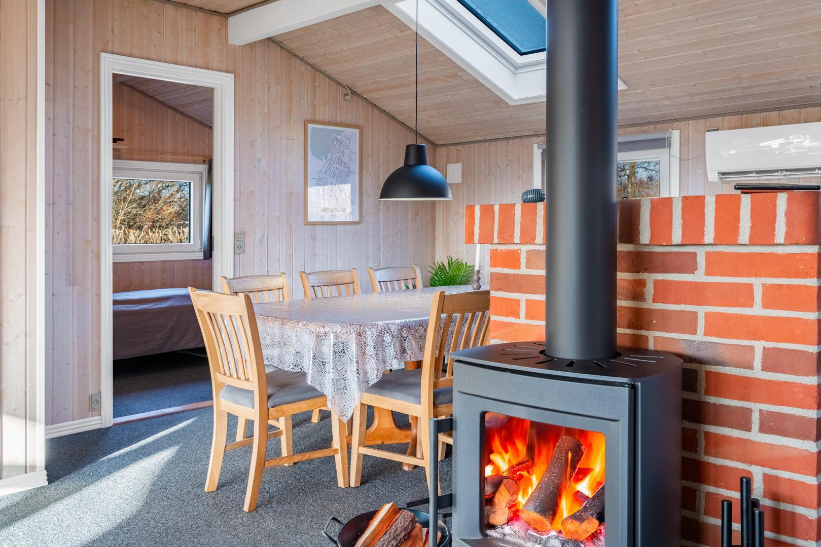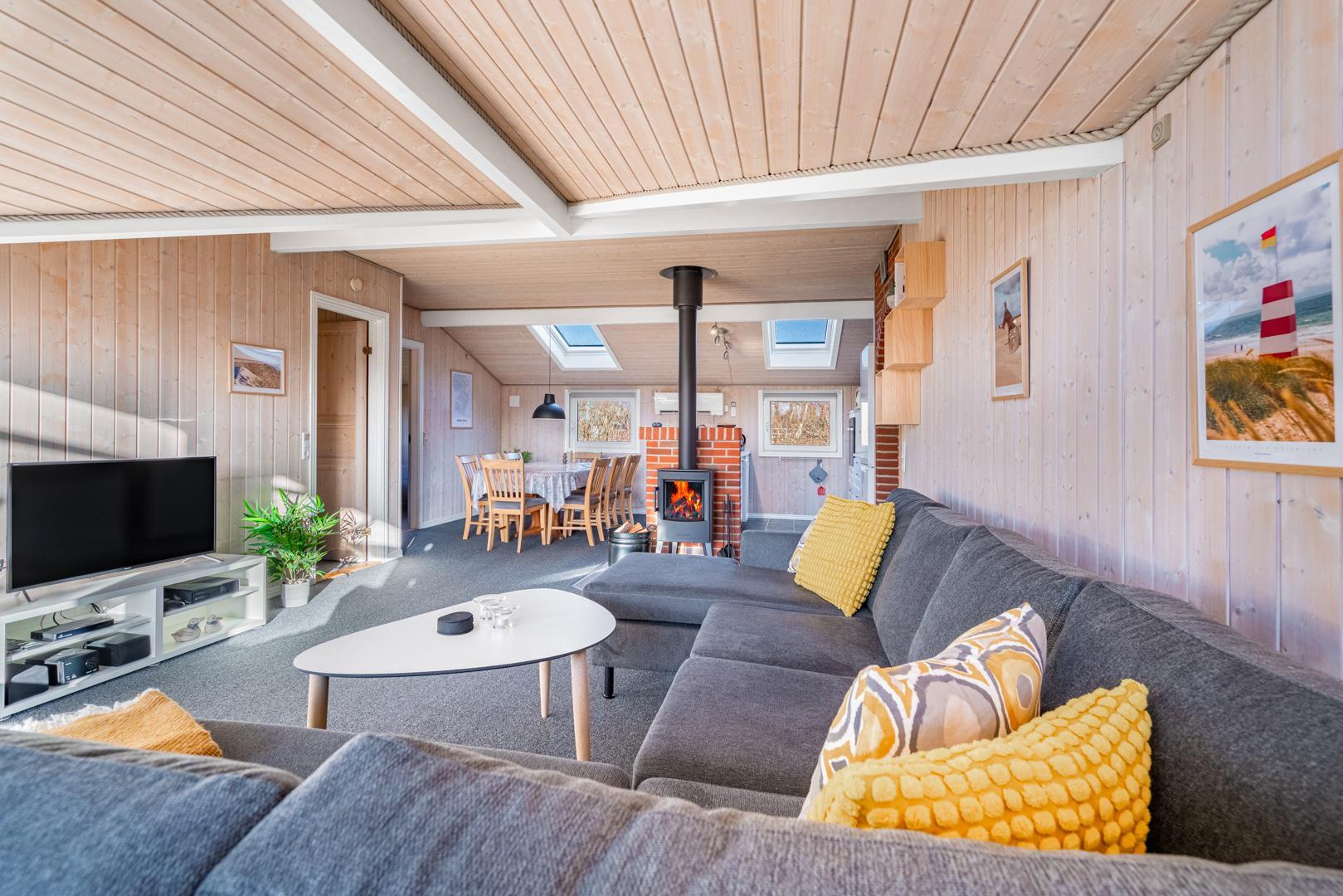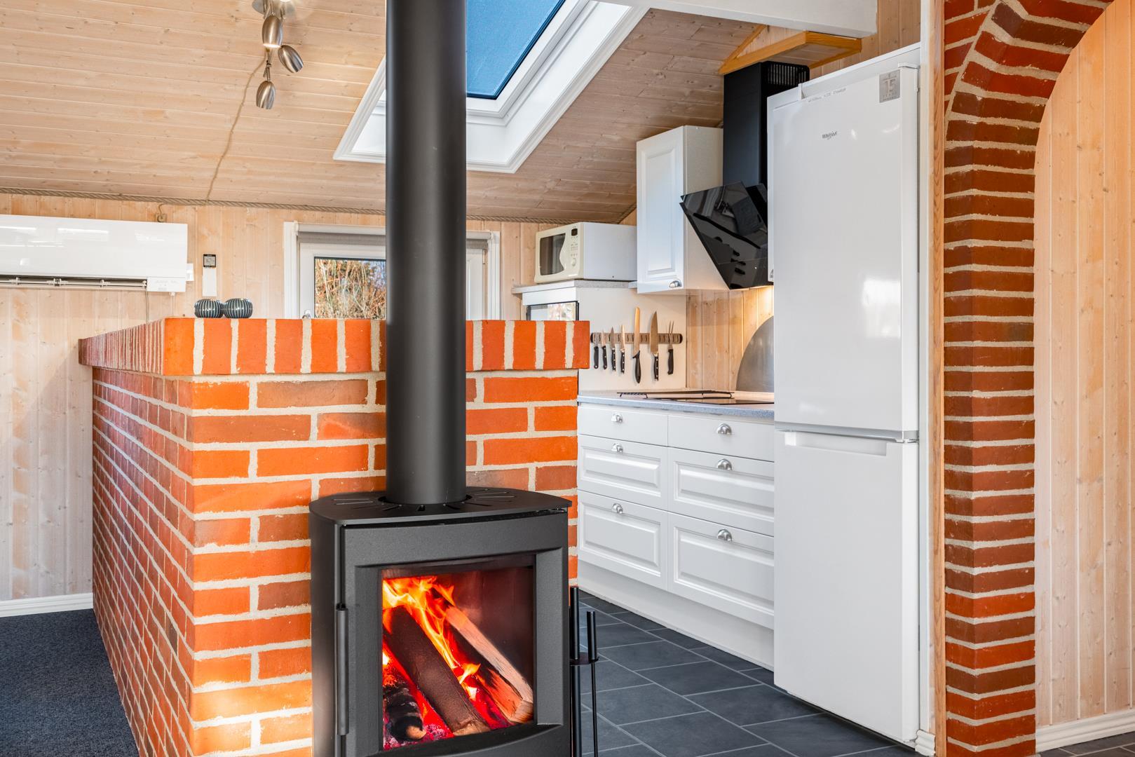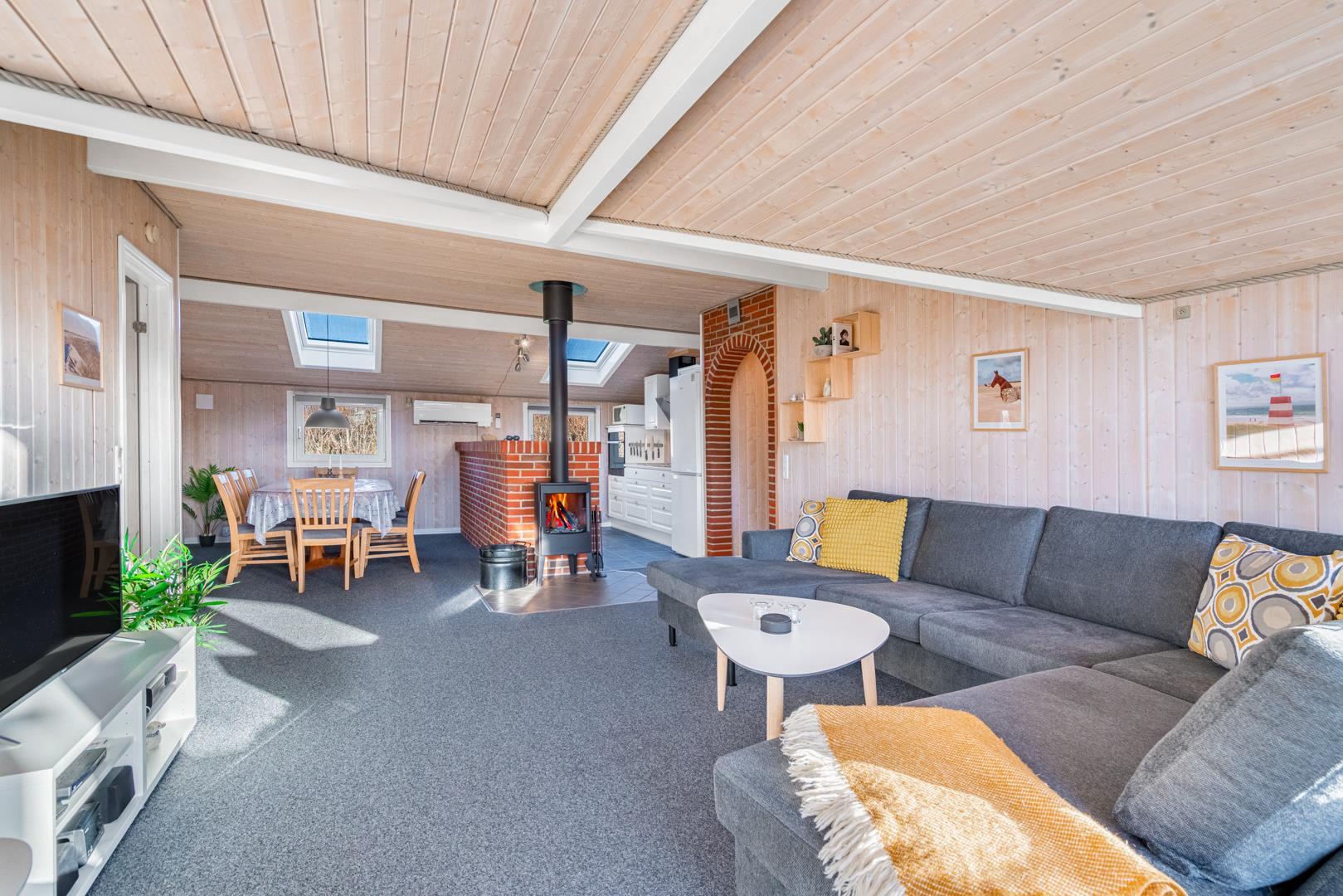 In eurem hellen Wohnzimmer sorgt der Kamin für eine besonders hyggelige Stimmung – ideal nach einem Tag am Strand oder am Fjord. Die Wärmepumpe und die Fußbodenheizung im Badezimmer sorgen ganzjährig für ein angenehmes Raumklima.