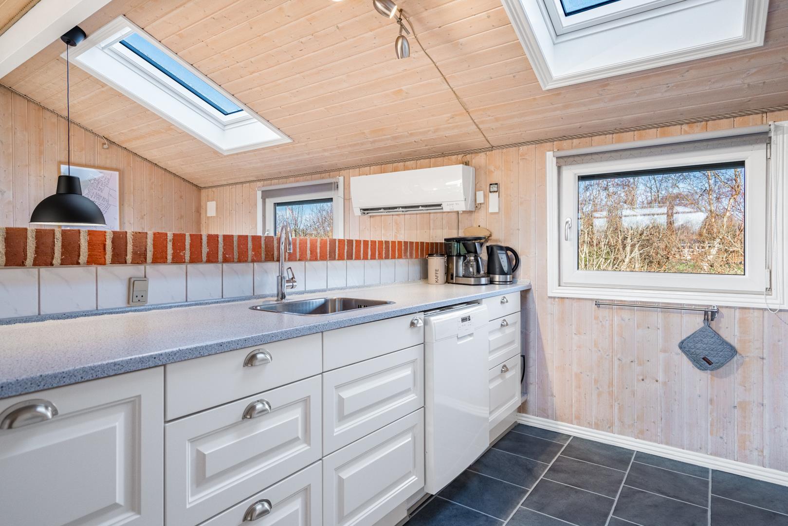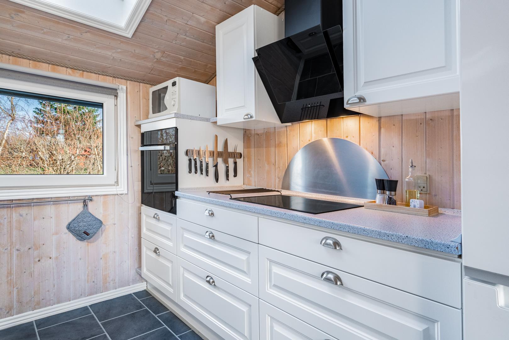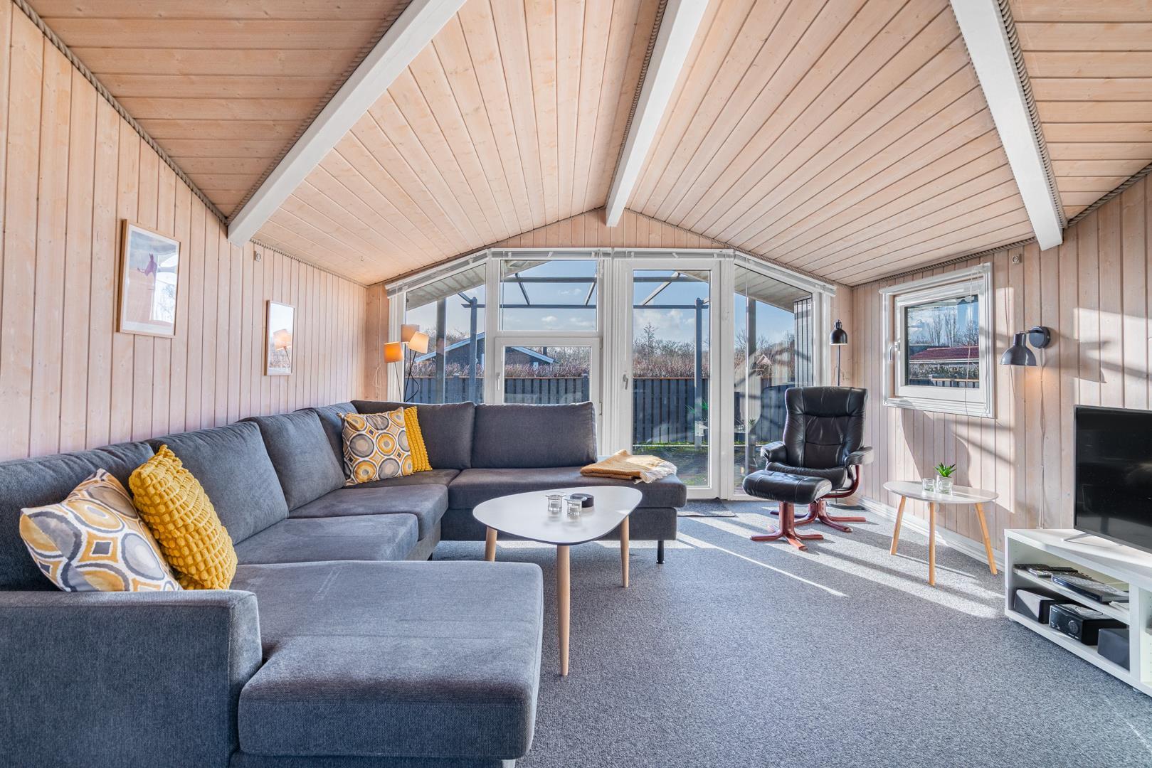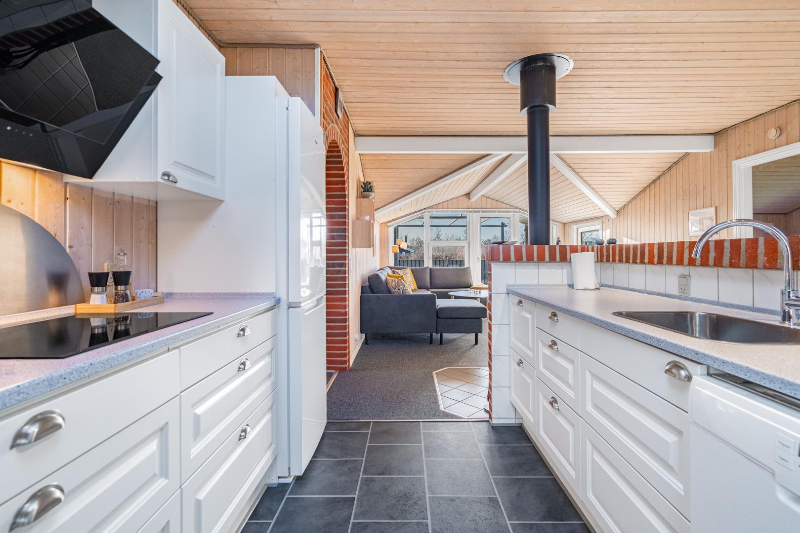 In eurem hellen Wohnzimmer sorgt der Kamin für eine besonders hyggelige Stimmung – ideal nach einem Tag am Strand oder am Fjord. Die Wärmepumpe und die Fußbodenheizung im Badezimmer sorgen ganzjährig für ein angenehmes Raumklima.