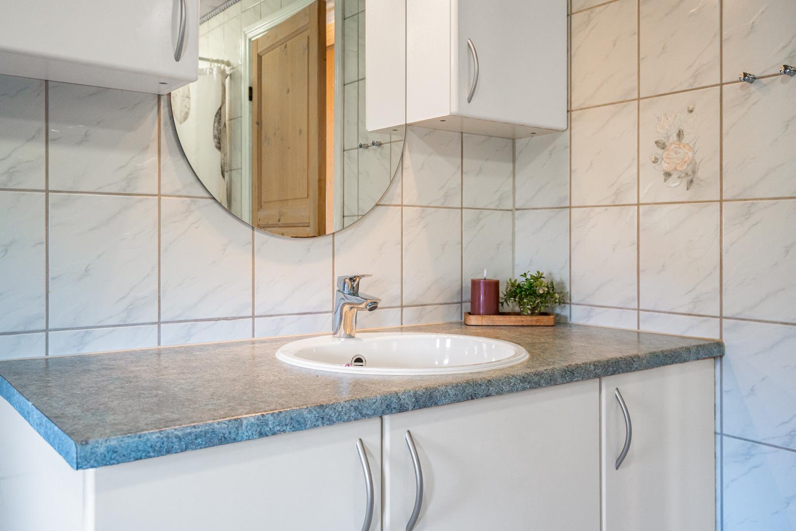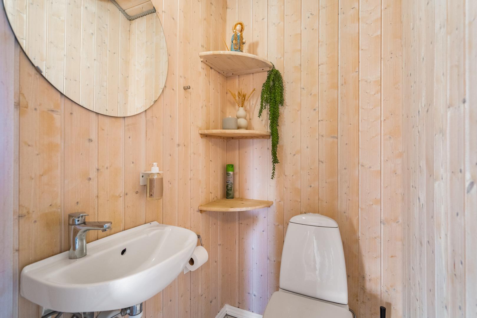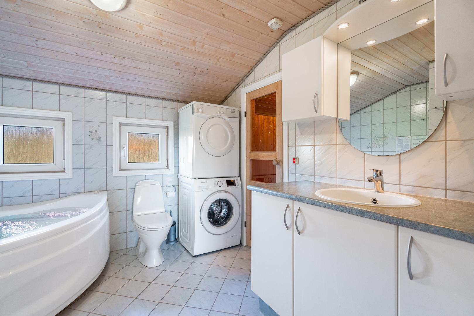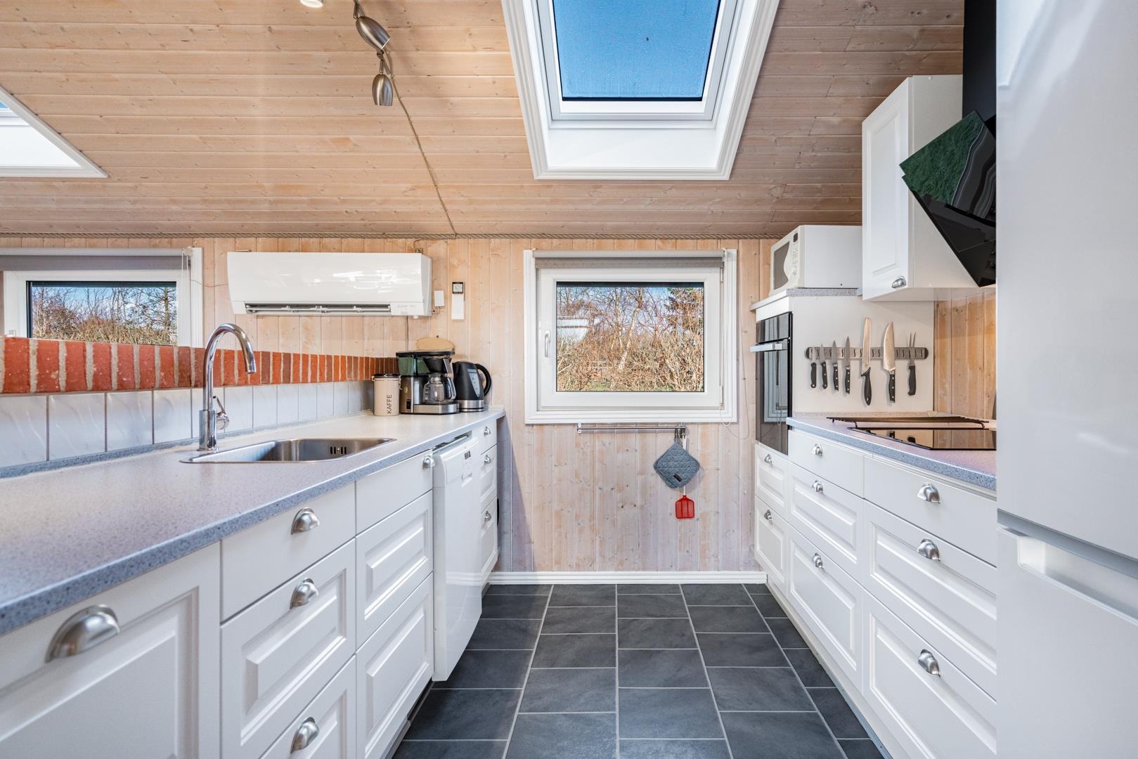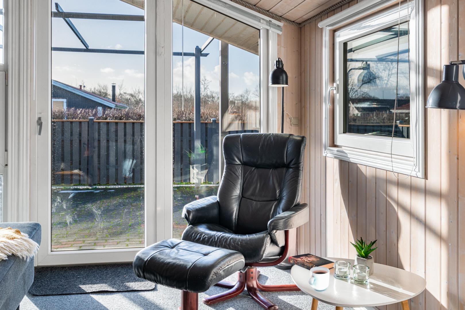 In eurem hellen Wohnzimmer sorgt der Kamin für eine besonders hyggelige Stimmung – ideal nach einem Tag am Strand oder am Fjord. Die Wärmepumpe und die Fußbodenheizung im Badezimmer sorgen ganzjährig für ein angenehmes Raumklima.