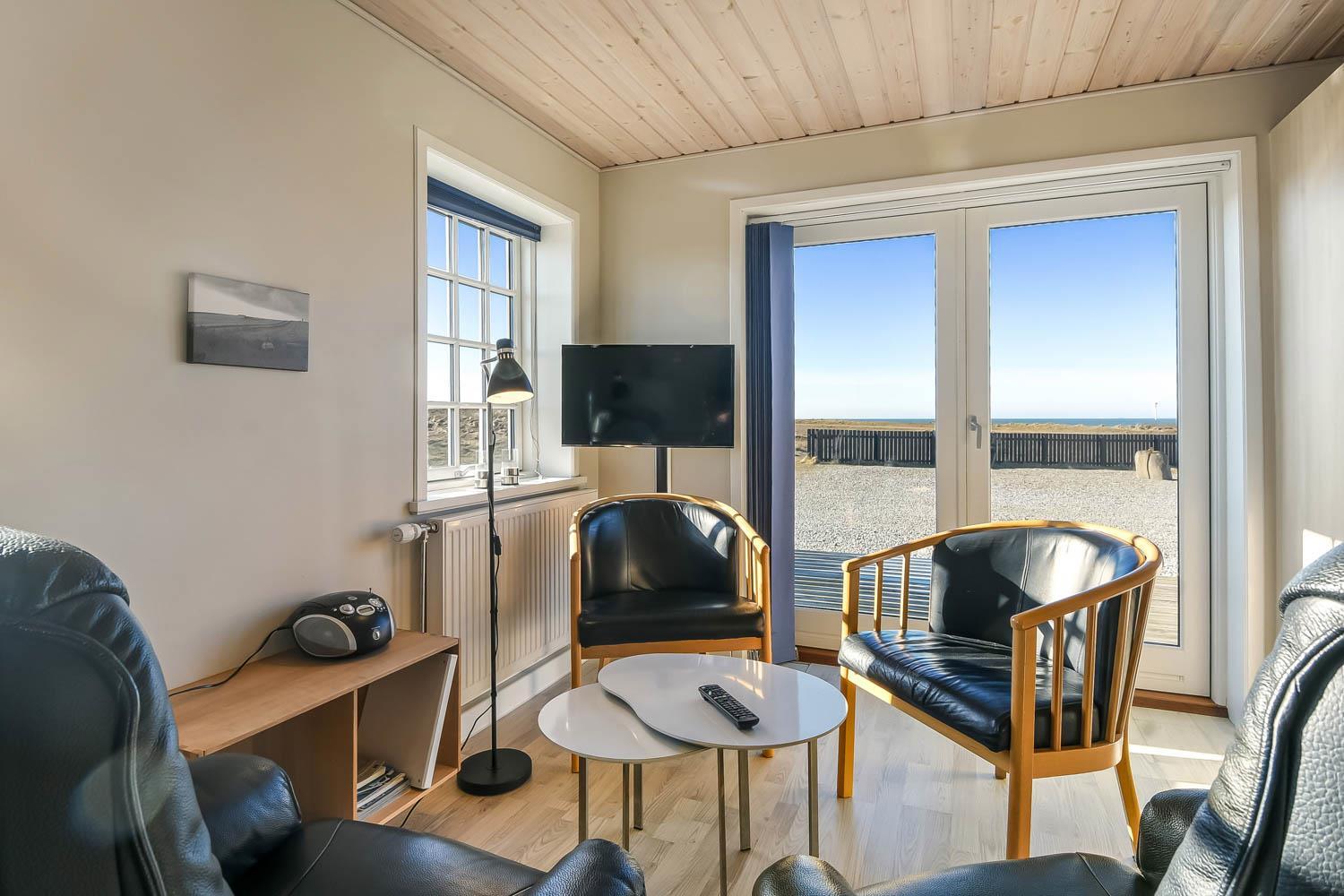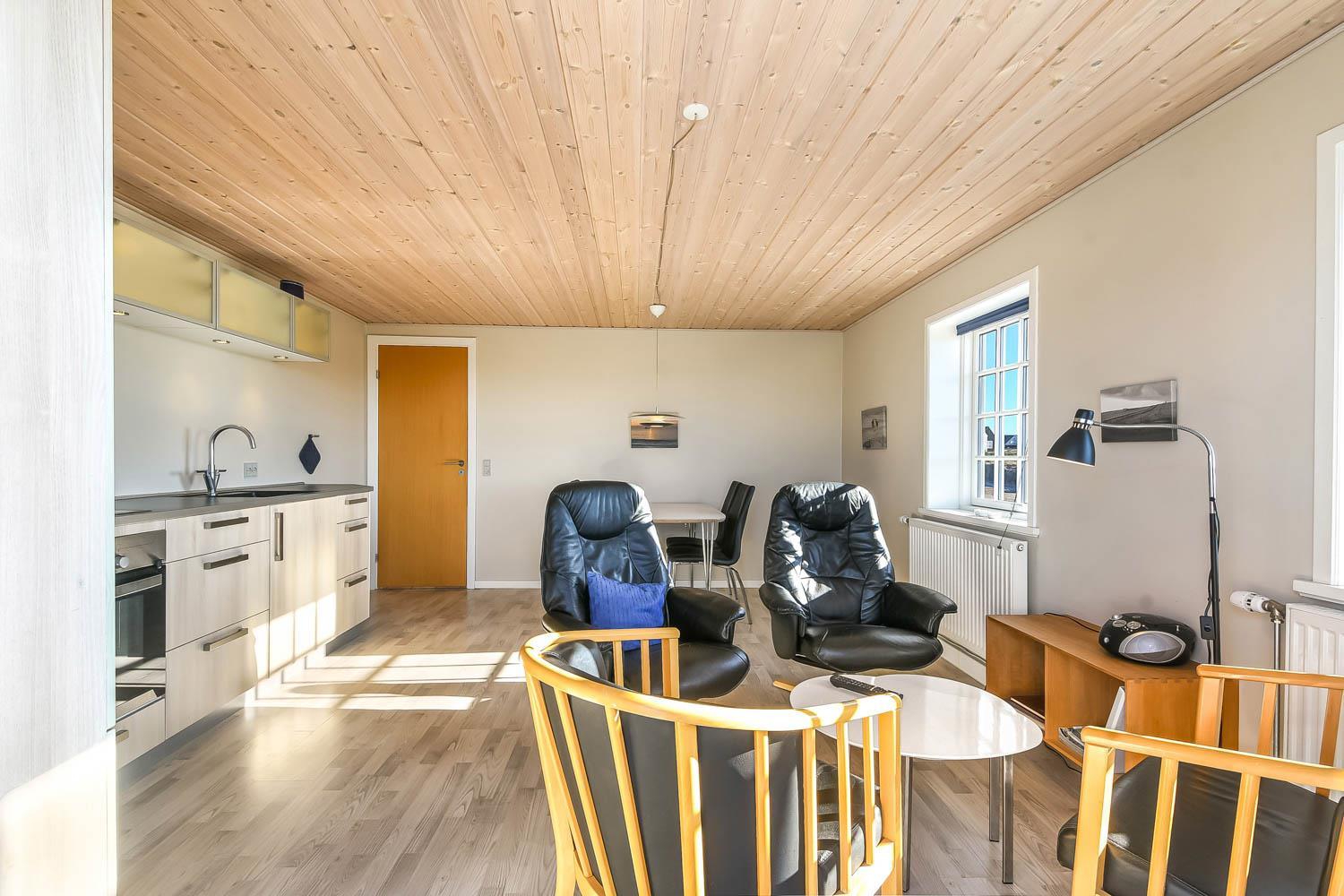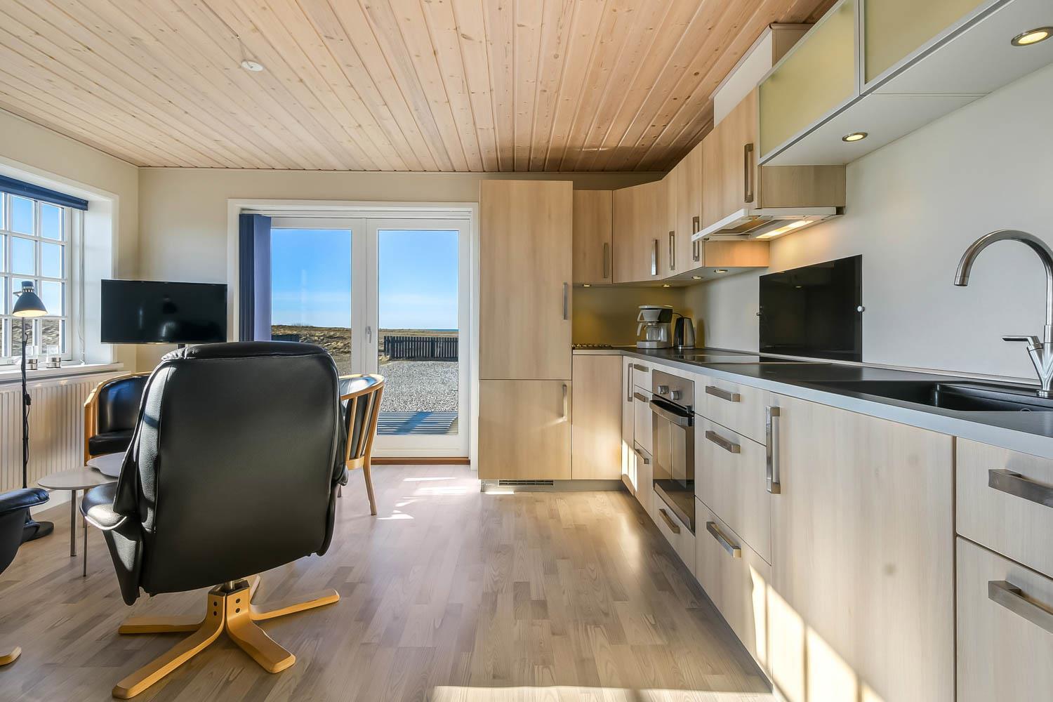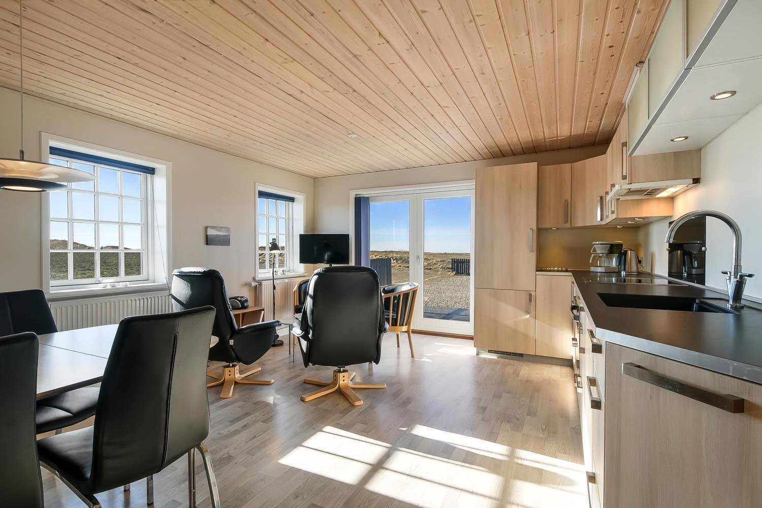 Offene Küche mit Wohn- und Essbereich, sehr gut ausgestattet u. a. mit Elektroherd und Kühlschrank mit Gefrierfach. Das Wohnzimmer ist mit hochwertigen Ledermöbeln eingerichtet und hat Panoramafenster, Flachbildschirm-TV mit dänischem (DR1) und deutschem Programm (Satellitenempfang) sowie CD-Player. Die großen Fensterpartien sorgen für einen guten Lichteinfall im Raum. Vom Wohnzimmer haben Sie eine schöne Aussicht auf die Umgebung und die Nordsee. 2 Schlafzimmer mit Doppelbetten (DB): 1 DB + 1 DB. 2 Badezimmer jeweils mit Toilette, Waschbecken, eines davon mit Dusche. Waschmaschine und Wäschetrockner sind im Gemeinschaftshaus. Nichtraucherhaus. 1 Haustier ist erlaubt. Wenn Sie ein Elektroauto oder einen Plug-in-Hybrid haben, verfügt das Haus über eine CEE-Ladesteckdose, Die Abrechnung erfolgt direkt mit dem Eigentümer.
