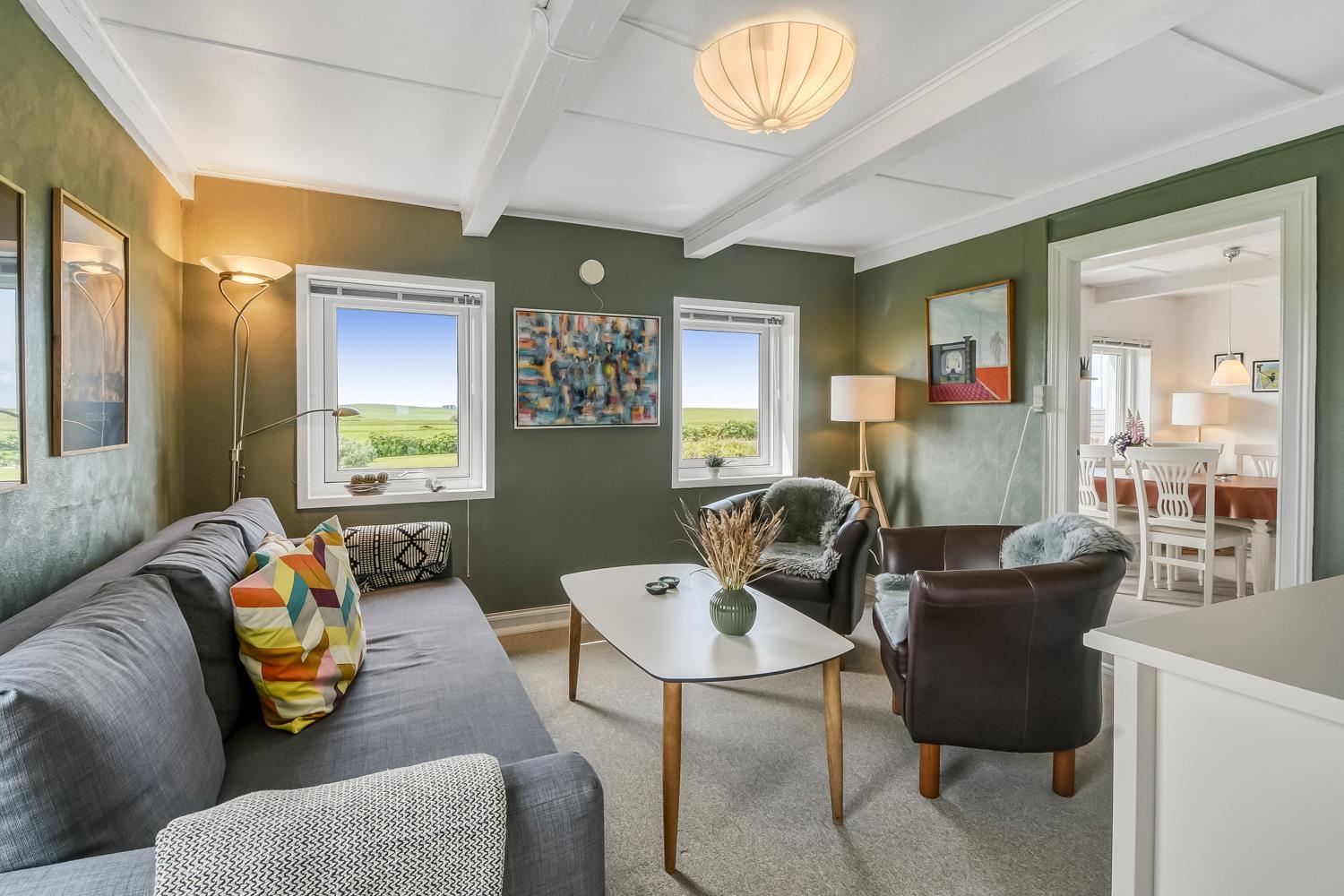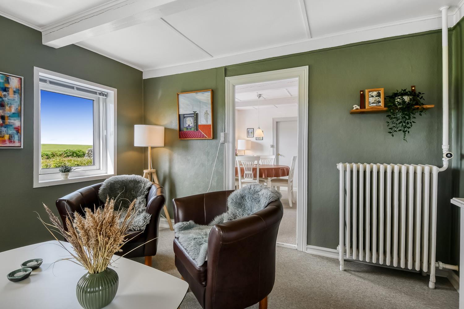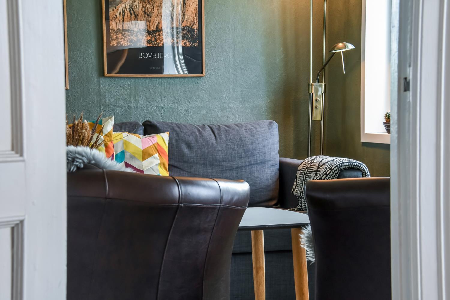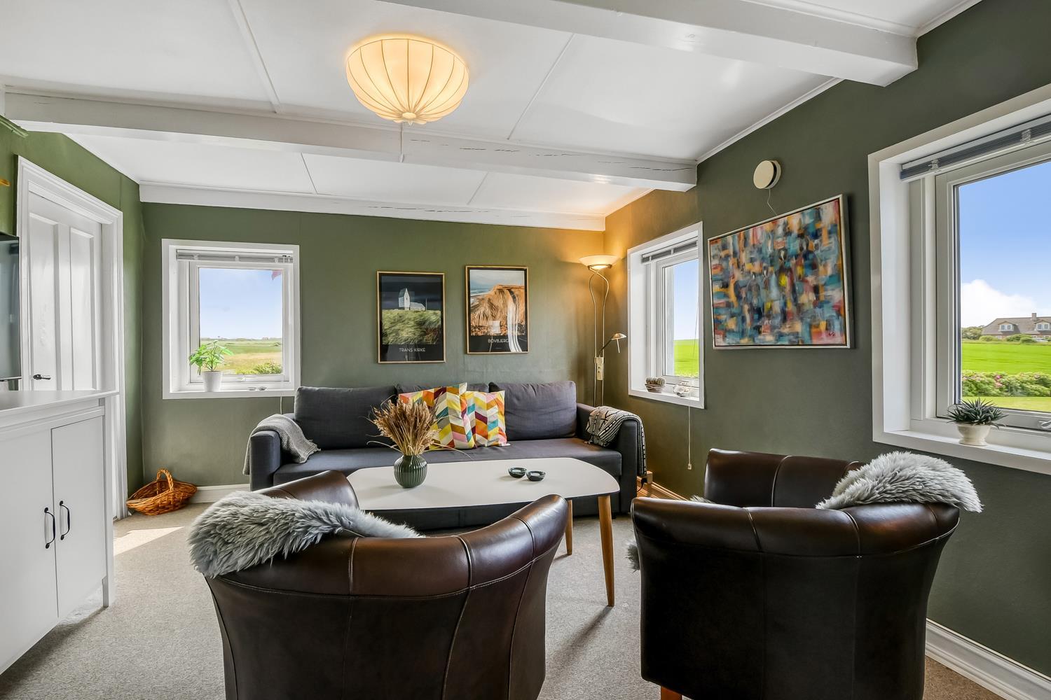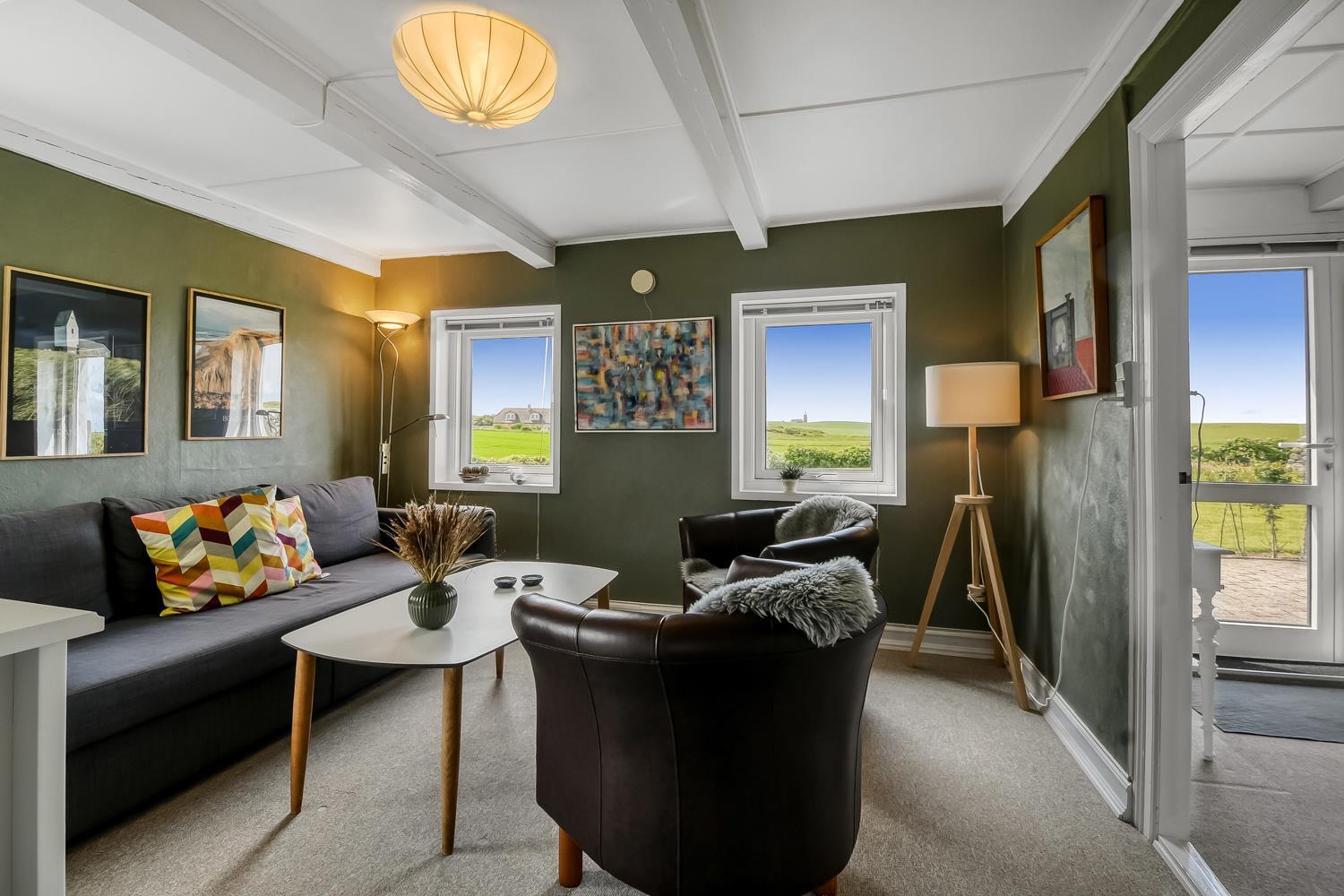 Das behagliche Wohnzimmer ist mit Leder- und Polstermöbeln eingerichtet und bietet einen Fernseher mit dänischen und deutschen Programmen sowie superschnelles Glasfaserinternet – perfekt für Entspannung und Unterhaltung.