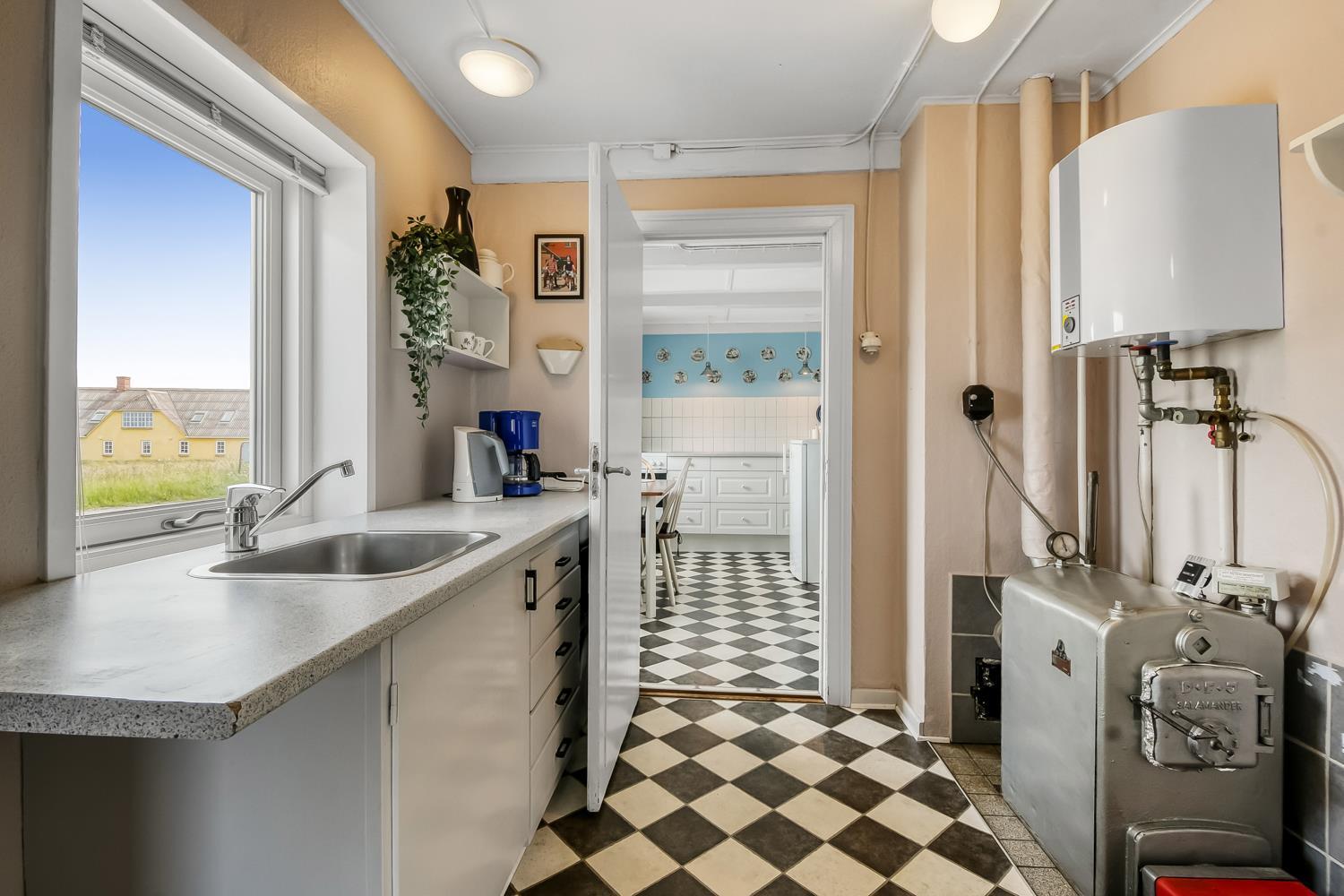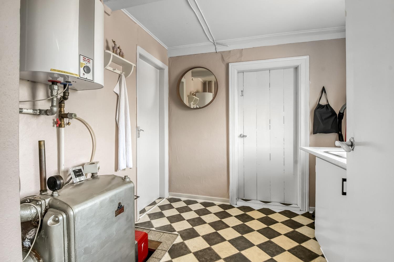 Angrenzend an die Küche befindet sich ein praktischer Hauswirtschaftsraum mit zusätzlicher Arbeitsfläche und Waschbecken. Hier stehen auch die Heizanlage und der Warmwasserboiler.
