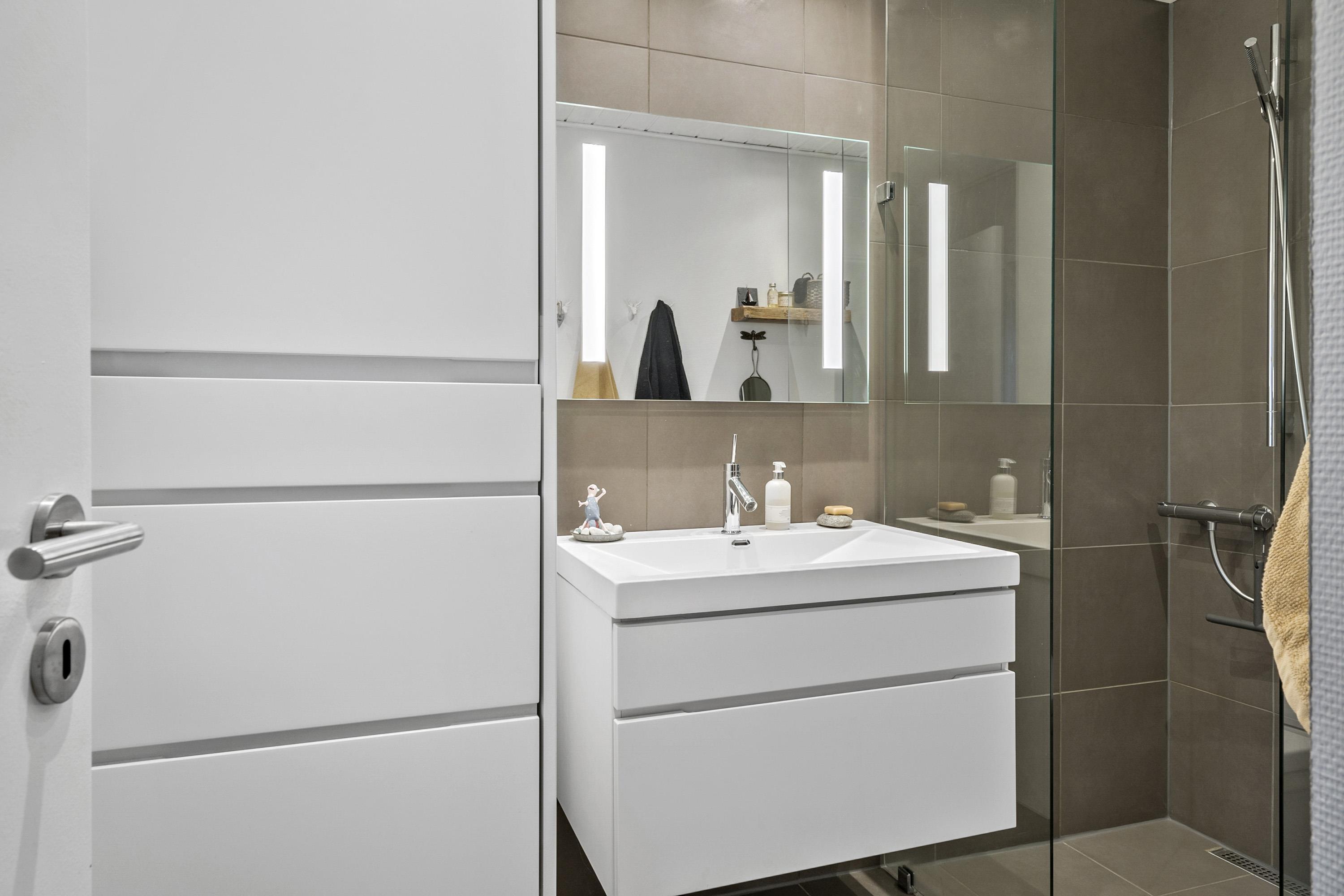 Die neue Küchenzeile ist mit Keramikkochfeldern, einer Dunstabzugshaube, einem Einbaubackofen, einem Kühlschrank mit separatem Gefrierfach (ca. 20L) sowie einer Spülmaschine ausgestattet. Das Badezimmer wurde neu renoviert und verfügt über eine Dusche, ein WC, ein Waschbecken und einen gefliesten Boden.
