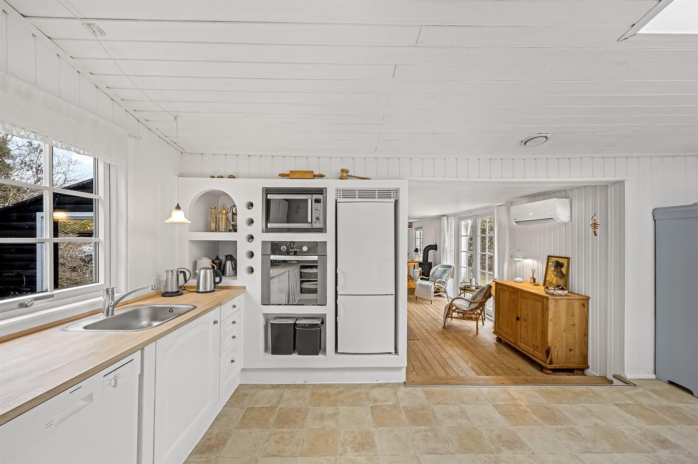 Die Küche ist mit Kühlschrank ausgestattet. Außerdem gibt es 4 Induktions-Kochzonen, Umluftofen, Mikrowelle sowie Geschirrspüler. Fußbodenheizung in der Küche.