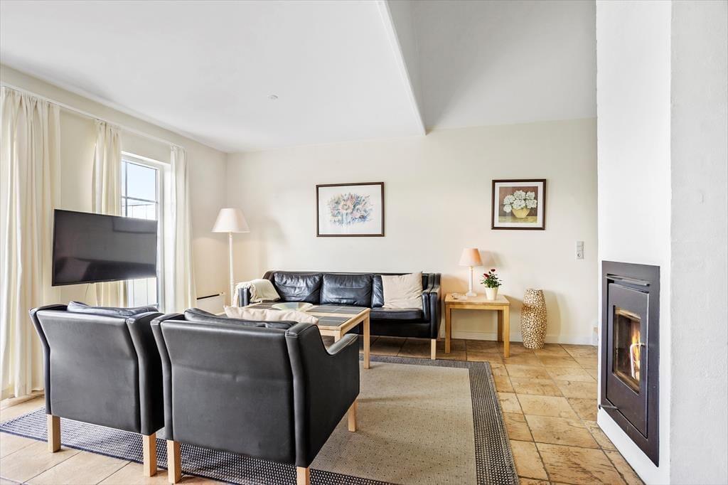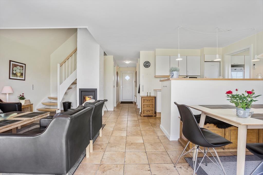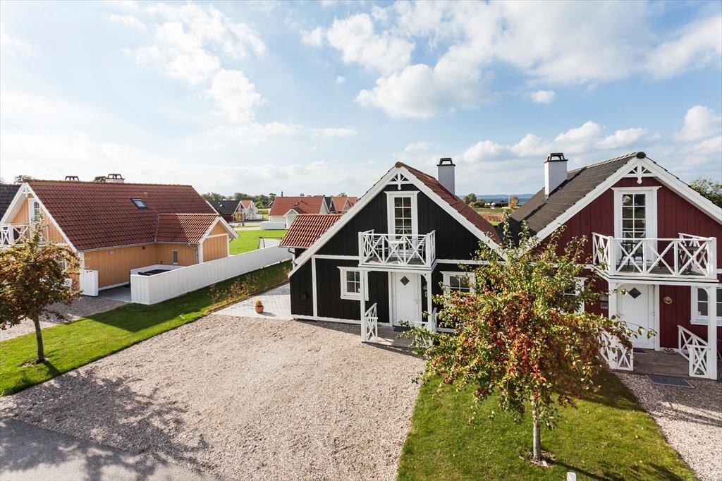Schönes, zweistöckiges Reihenhaus mit Whirlpool und Sauna am Rande der Ferienhaussiedlung Bro Strand gelegen. Das moderne Holzhaus ist geschmackvoll im skandinavischen Stil eingerichtet und verfügt über ein gemütliches Wohnzimmer mit eingemauertem Kaminofen, moderne, zum Wohnzimmer hin offene Küche, 1 Schlafraum, Badezimmer mit Whirlpool und Sauna sowie Hauswirtschaftsraum mit Waschmaschine. Im 1. Stock befinden sich 2 weitere Schlafräume sowie ein Gäste-WC. Meerblick vom 1. Stock aus. Vom Wohnzimmer aus kann man die Terrasse und die gemeinschaftlich genutzte Freifläche betreten.