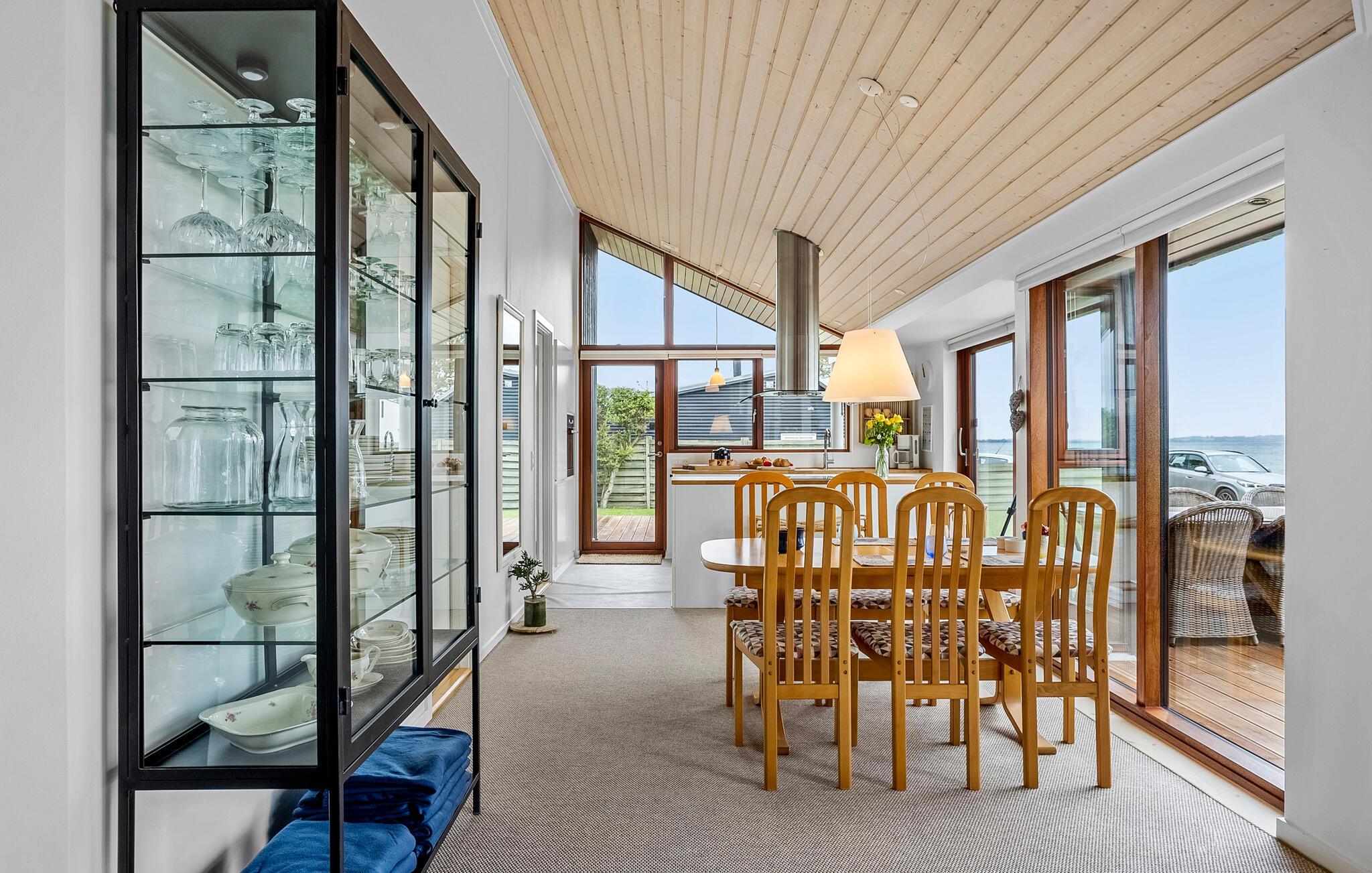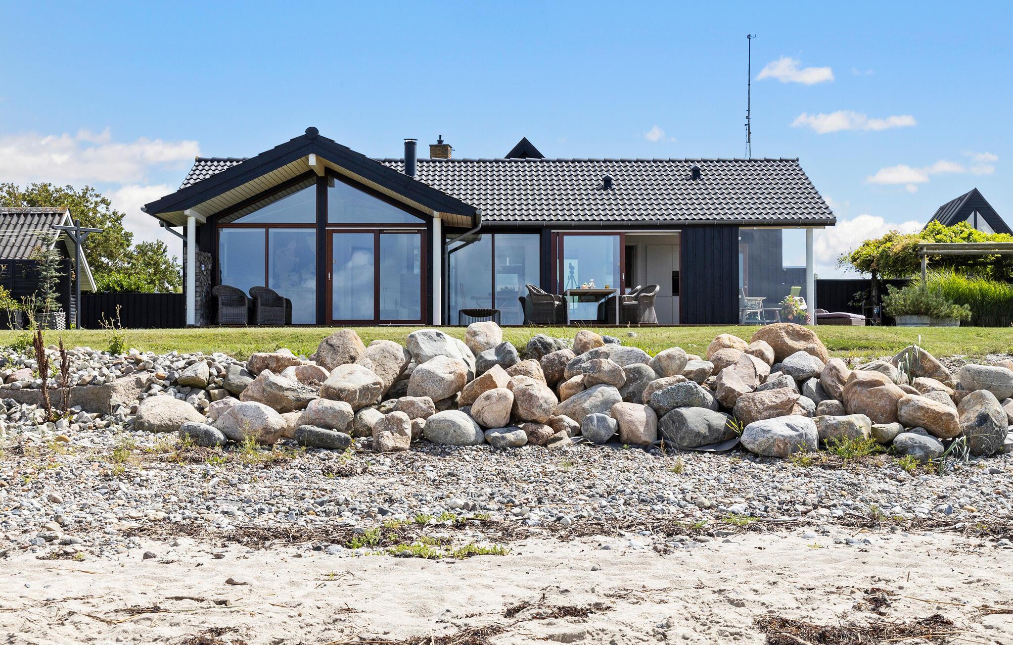 Modernes Ferienhaus am Strand in Brenderup Fyn mit Panorama-Meerblick und gemütlichem Kaminofen.