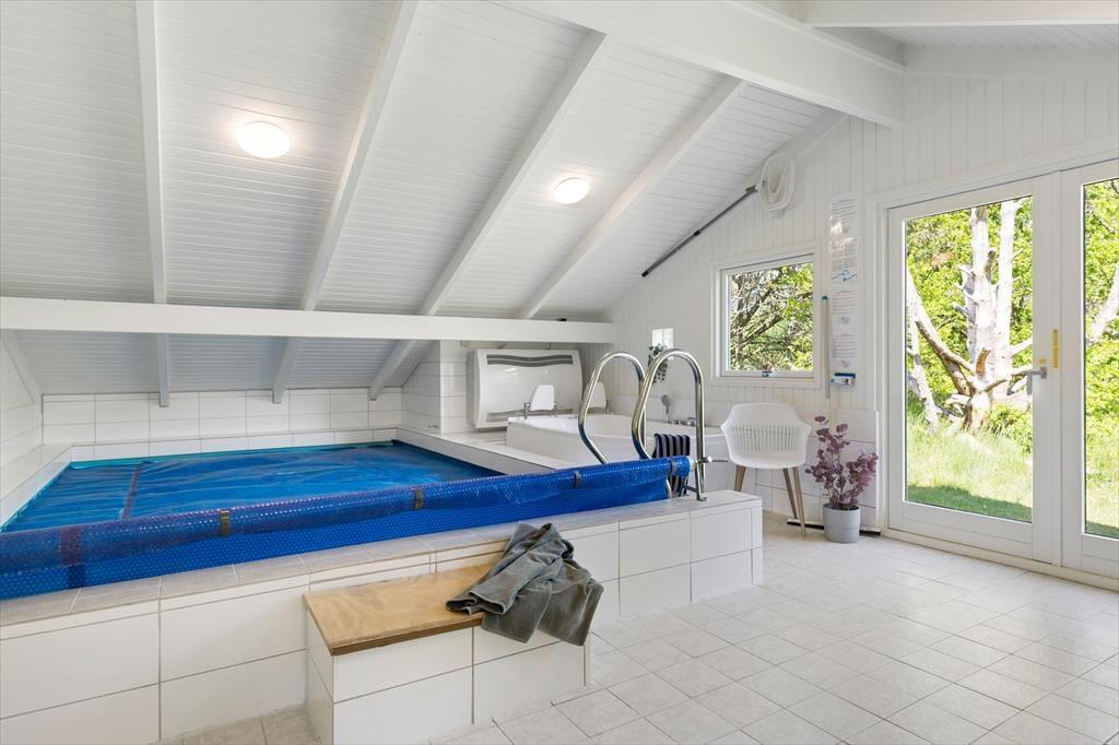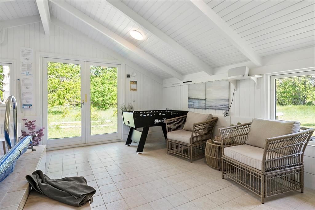 Das Ferienhaus ist hell, einladend und im charmanten nordischen Stil eingerichtet, der eine gemütliche Atmosphäre schafft. Das Herzstück des Hauses ist das großzügige Wohnzimmer, in dem große Fensterpartien die Natur ganz nah heranholen. Hier können Sie es sich auf dem Sofa gemütlich machen, mit der Familie Gesellschaftsspiele spielen oder ein gemeinsames Abendessen am Esstisch genießen. Falls das Wetter einmal nicht mitspielt, können Sie sich vor dem Kamin aufwärmen oder in den hauseigenen Innenpool springen, der ganzjähriges Badevergnügen garantiert. Nach einem langen Tag in der Natur können Sie sich in der Whirlwanne entspannen oder sich in der Sauna aufwärmen – der perfekte Abschluss für einen erholsamen Urlaub.