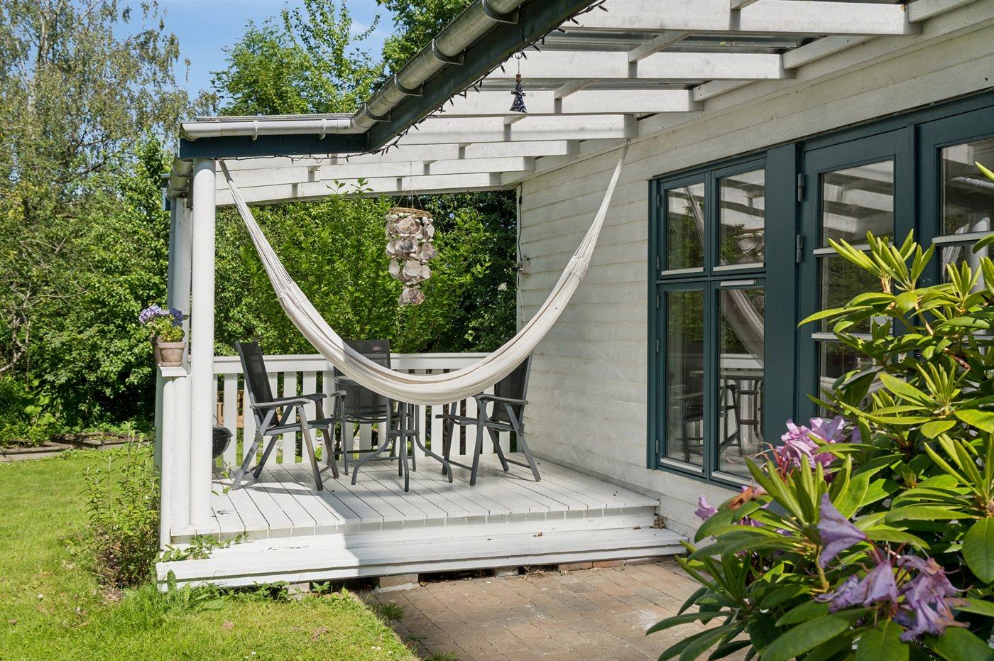 Das Haus ist hell und luftig mit viel Tageslicht und einer herrlichen sommerlichen Einrichtung. Das Wohnzimmer und der Essbereich sind offen gestaltet, und die Küche grenzt direkt daran an. Von hier aus gelangt man auf die Terrasse und in den Garten, wo mehrere gemütliche Ecken zum Verweilen einladen und man sowohl die Sonne genießen als auch Schatten finden kann. Es gibt außerdem eine Außensauna.