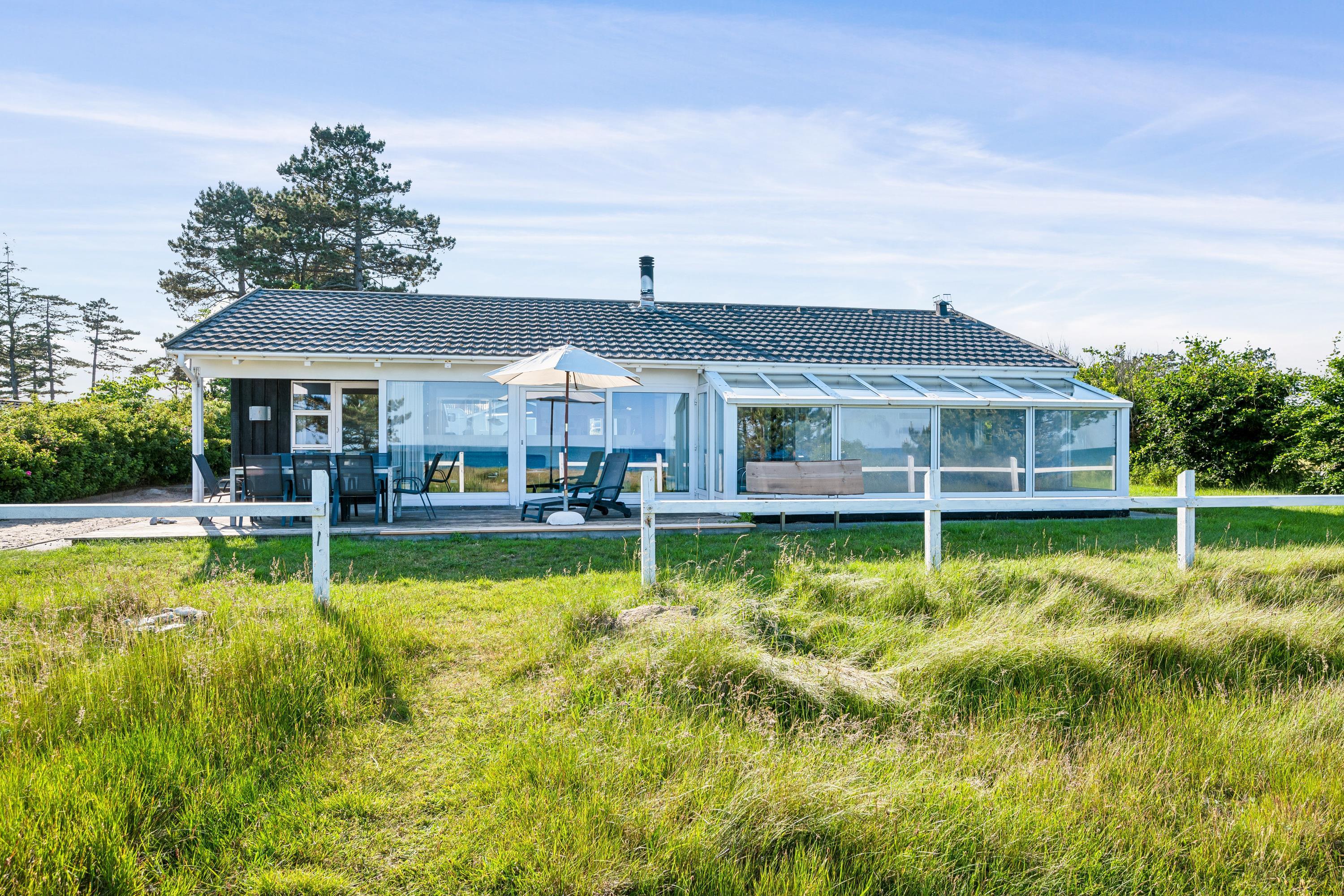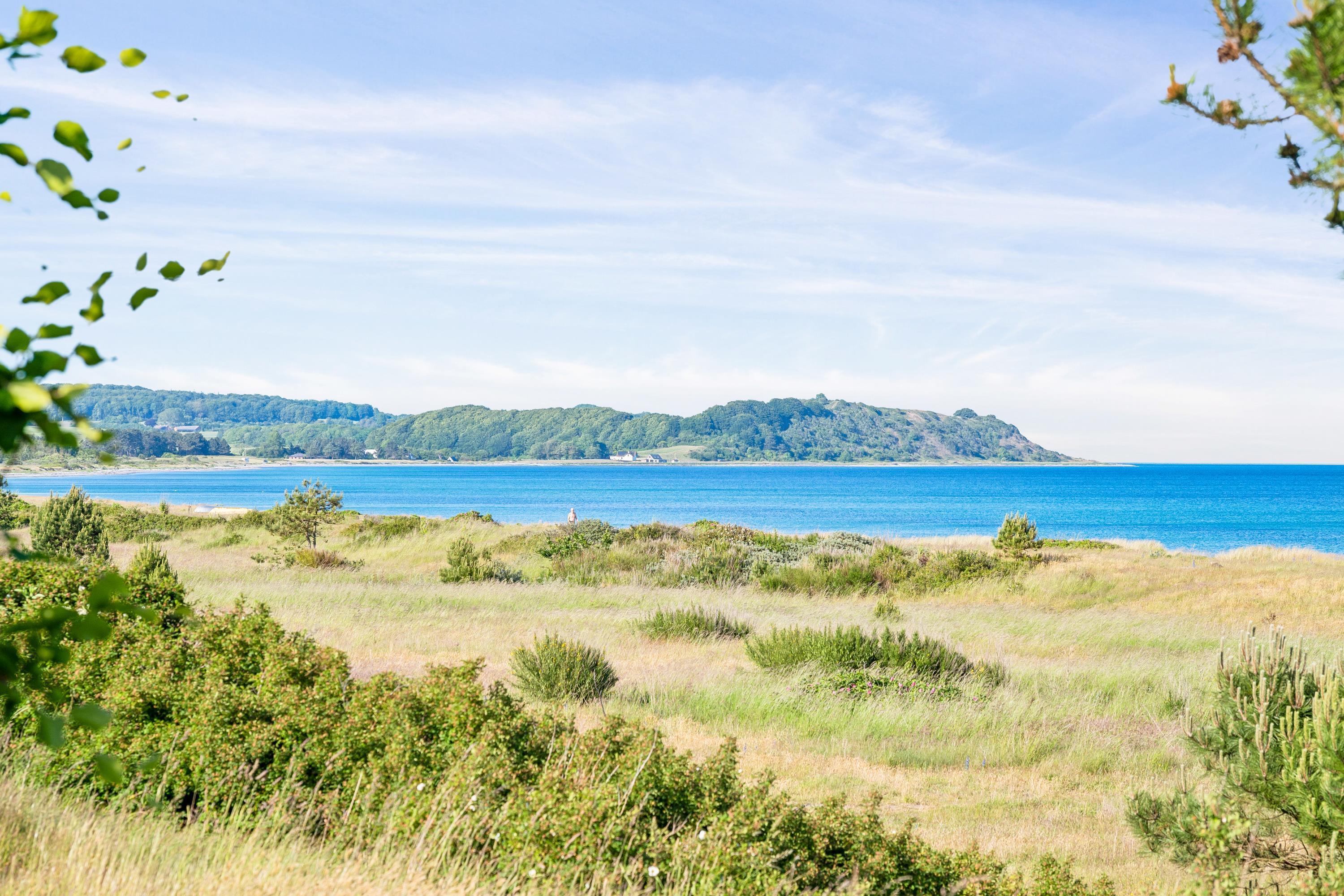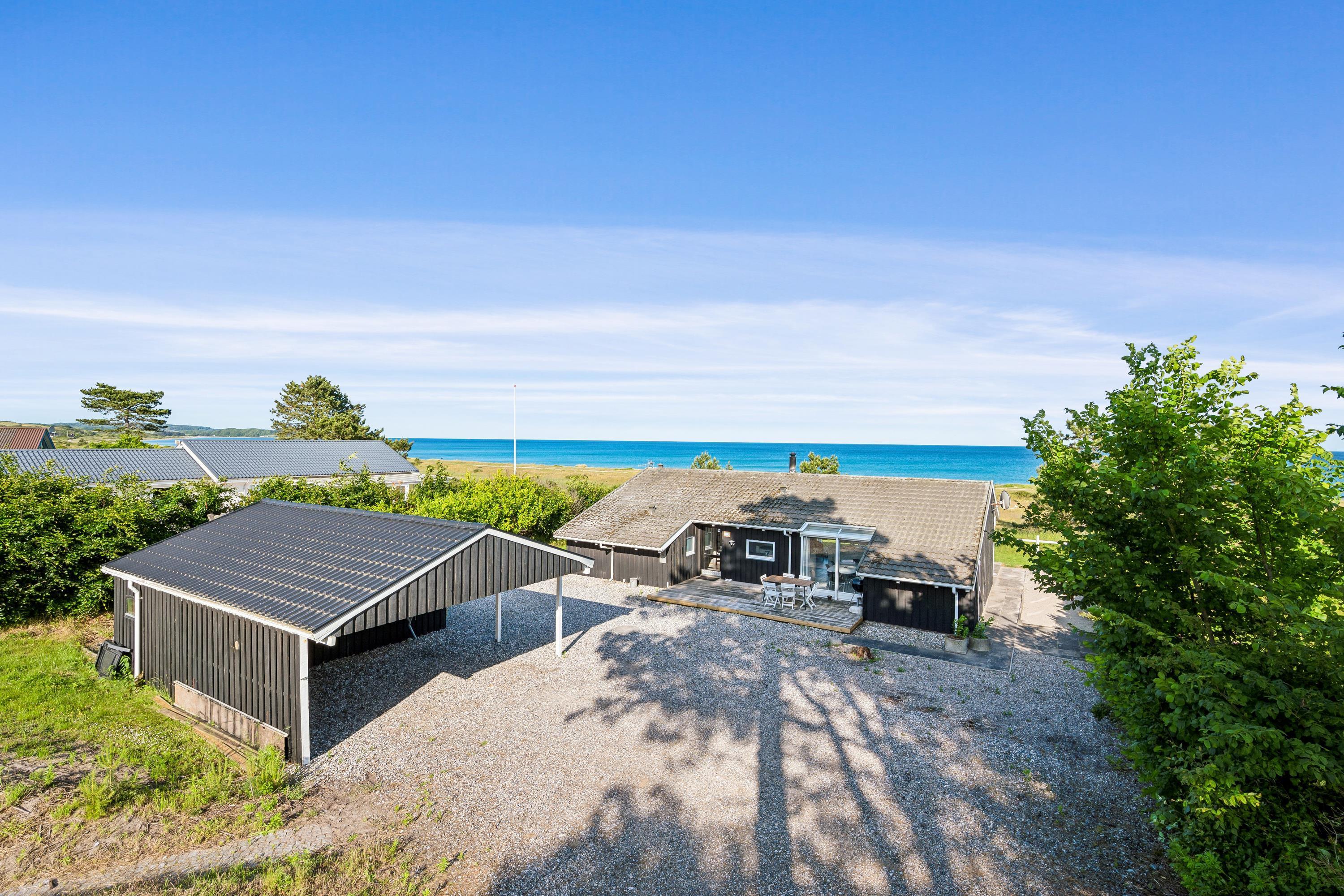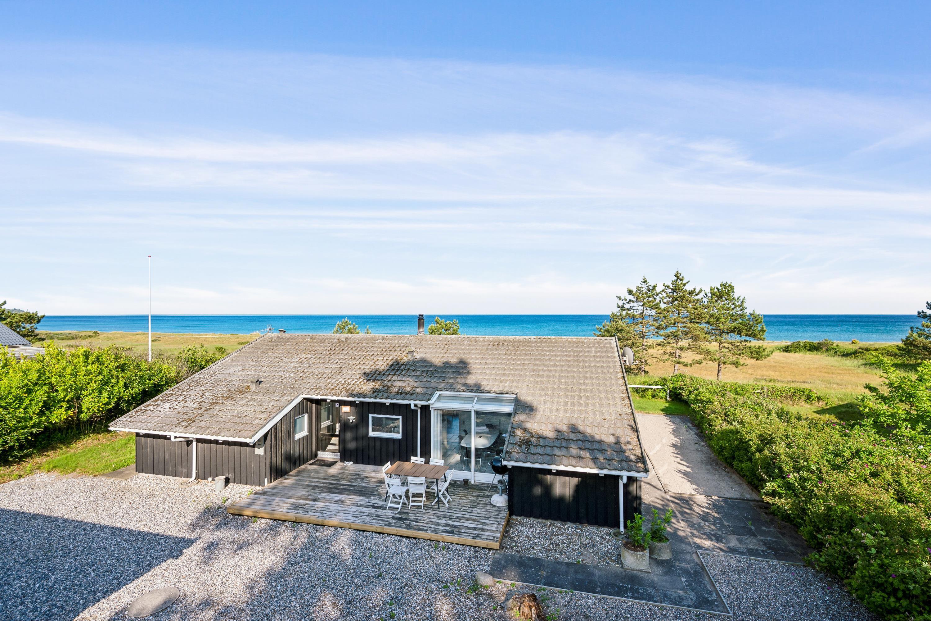 Erleben Sie ein herrliches Poolhaus am Dråby Strand mit Panoramablick auf Kattegat und Jernhatten, ideal für Erholung und Familien.
