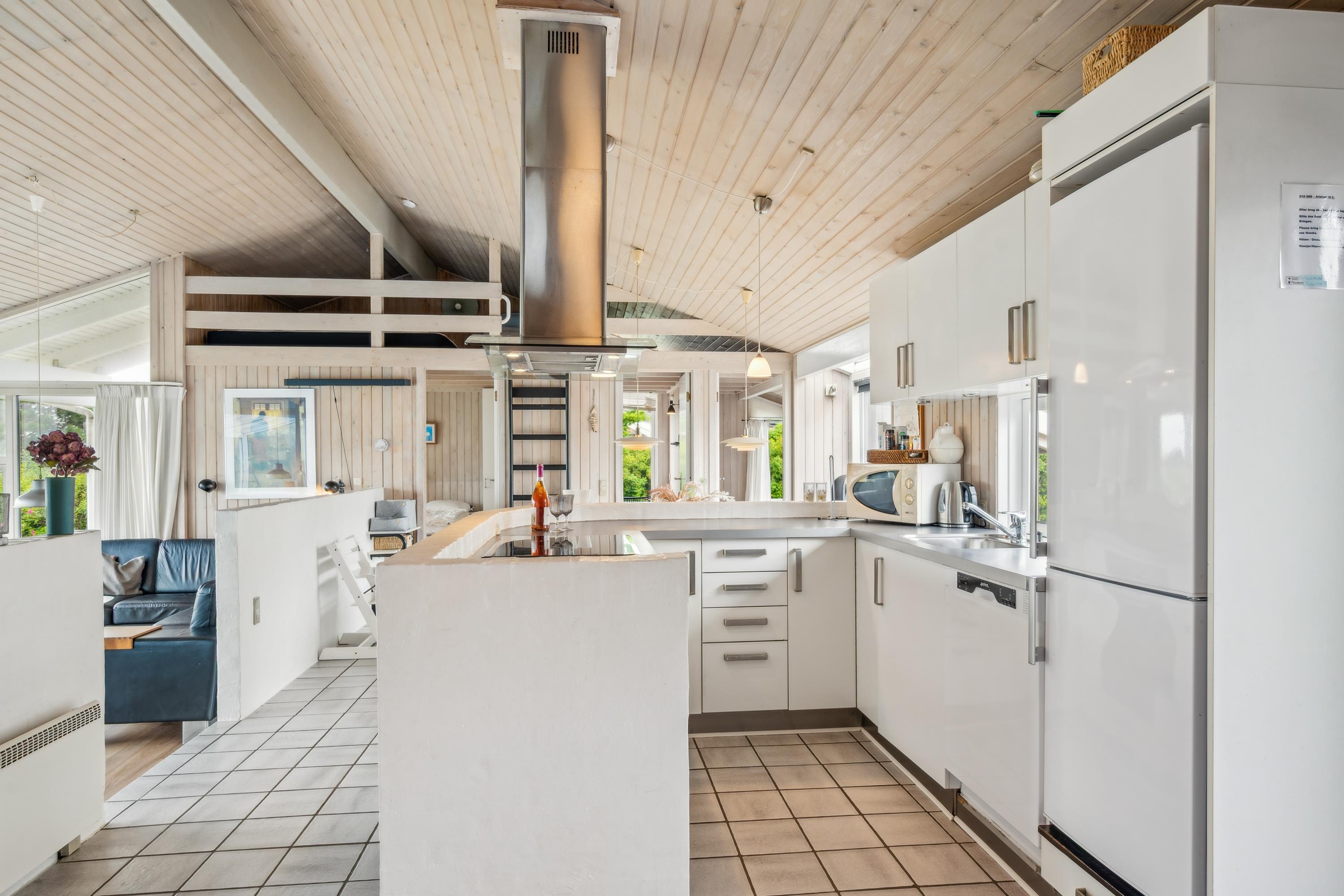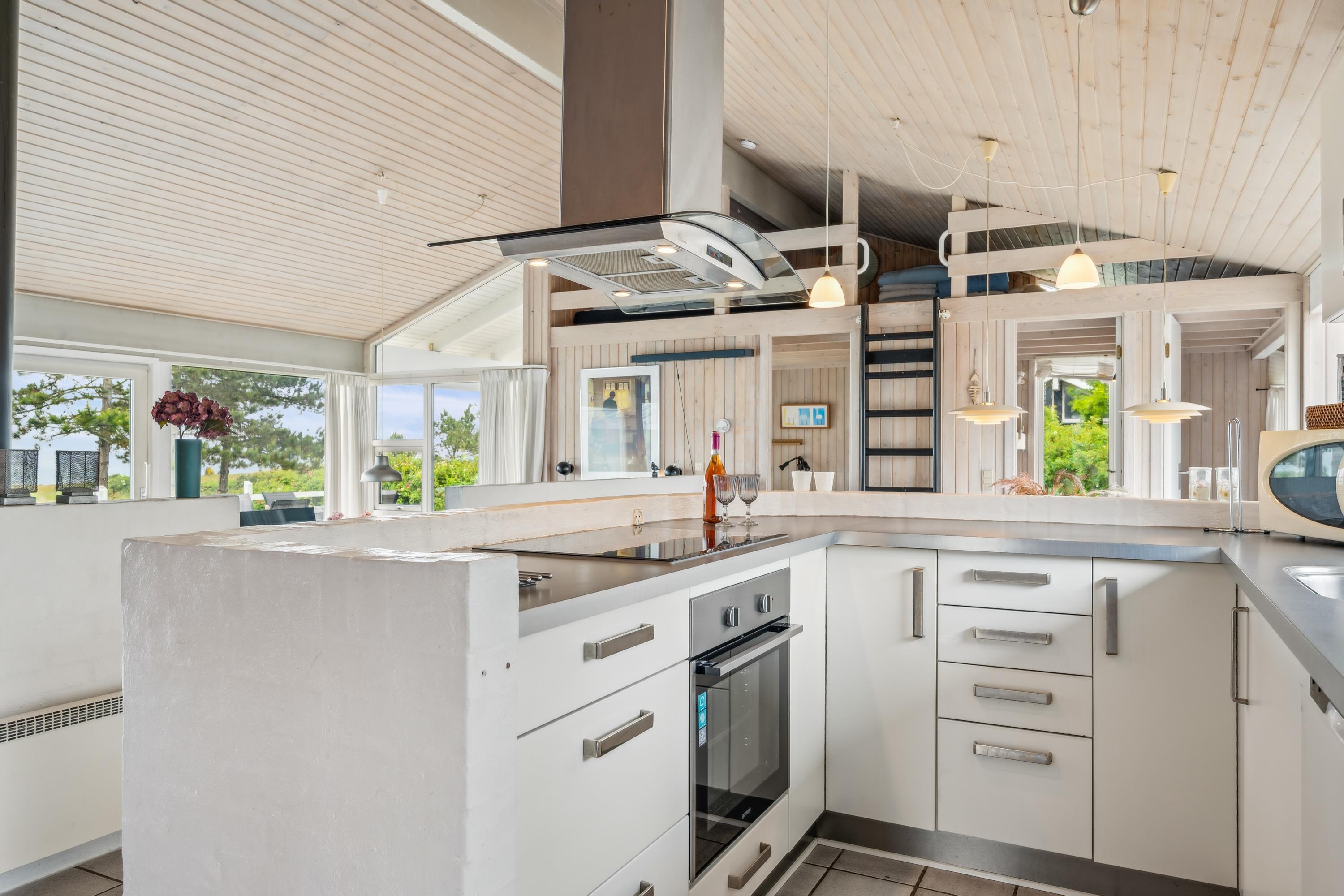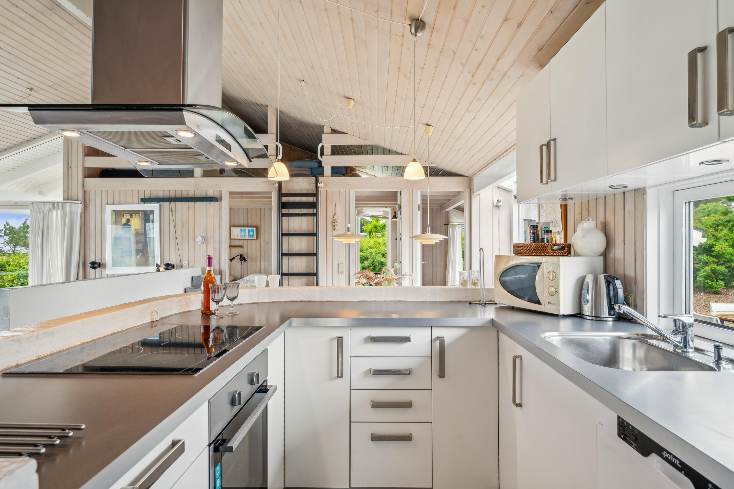 Auf einem großen Naturgrundstück am Dråby Strand finde Sie dieses schöne Poolhaus in 1. Reihe am Wasser mit Panoramablick auf das Kattegat und Jernhatten mit mehreren Terrassen (Ost und West) mit Gartenmöbeln, Grill und Feuerplatz. Gemütliches Wohnzimmer mit Holzofen, TV mit SAT-Anlage, Stereoanlage mit CD und DVD. Helle, moderne Küche mit Ceranfeld, Kühlschrank mit kleinem Gefrierfach, Stereoanlage mit CD und DVD. 2 Badezimmer mit Dusche und Fußbodenheizung. Außerdem Sauna, Waschmaschine und Trockner. Zentral im Haus finden Sie einen großen Poolraum (4,8 x 3,5 x 1,5 M – 15 Qm). Die Schlafplätze verteilen sich auf 4 Schlafzimmer: 3 mit Doppelbett, 1 mit Etagenbett sowie großes Obergeschoss mit 2 Schlafplätzen, die zum Wohnzimmer offen ist. Außenfischreinigungsplatz sowie extra Gefrierfach im Schuppen. Für die kleinen Feriengäste finden Sie Kinderbett, Kinderhochstuhl, Sandkasten und Schaukel. Außerdem Petanguebahn.