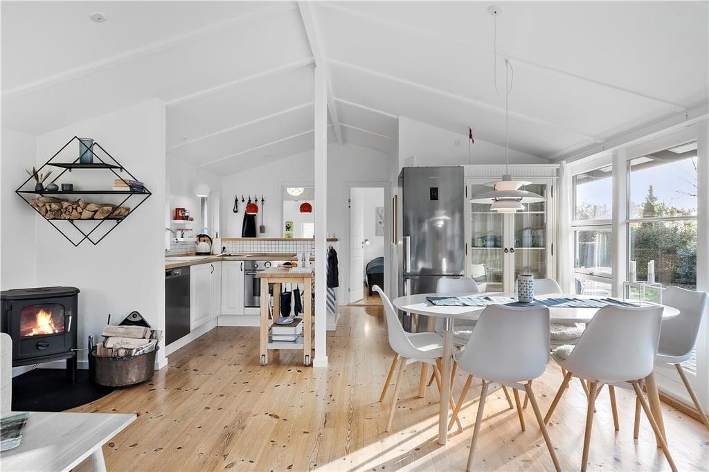Treten Sie ein in dieses helle und charmante Ferienhaus, wo eine gemütliche Atmosphäre von Ruhe und Entspannung auf Sie wartet. Die offene Küche und das Wohnzimmer verschmelzen zu einem einladenden Raum, in dem die Familie bei selbstgekochten Mahlzeiten zusammenkommen kann. Am Abend sorgt der knisternde Kamin für wohlige Wärme, während Sie ein Buch lesen oder ein geselliges Brettspiel genießen.