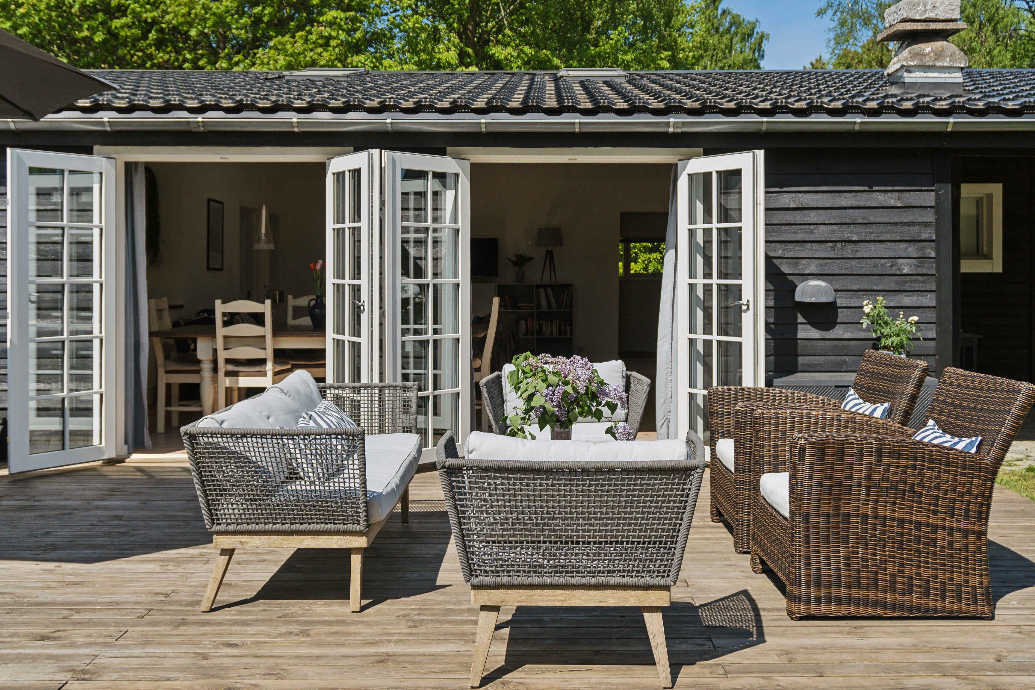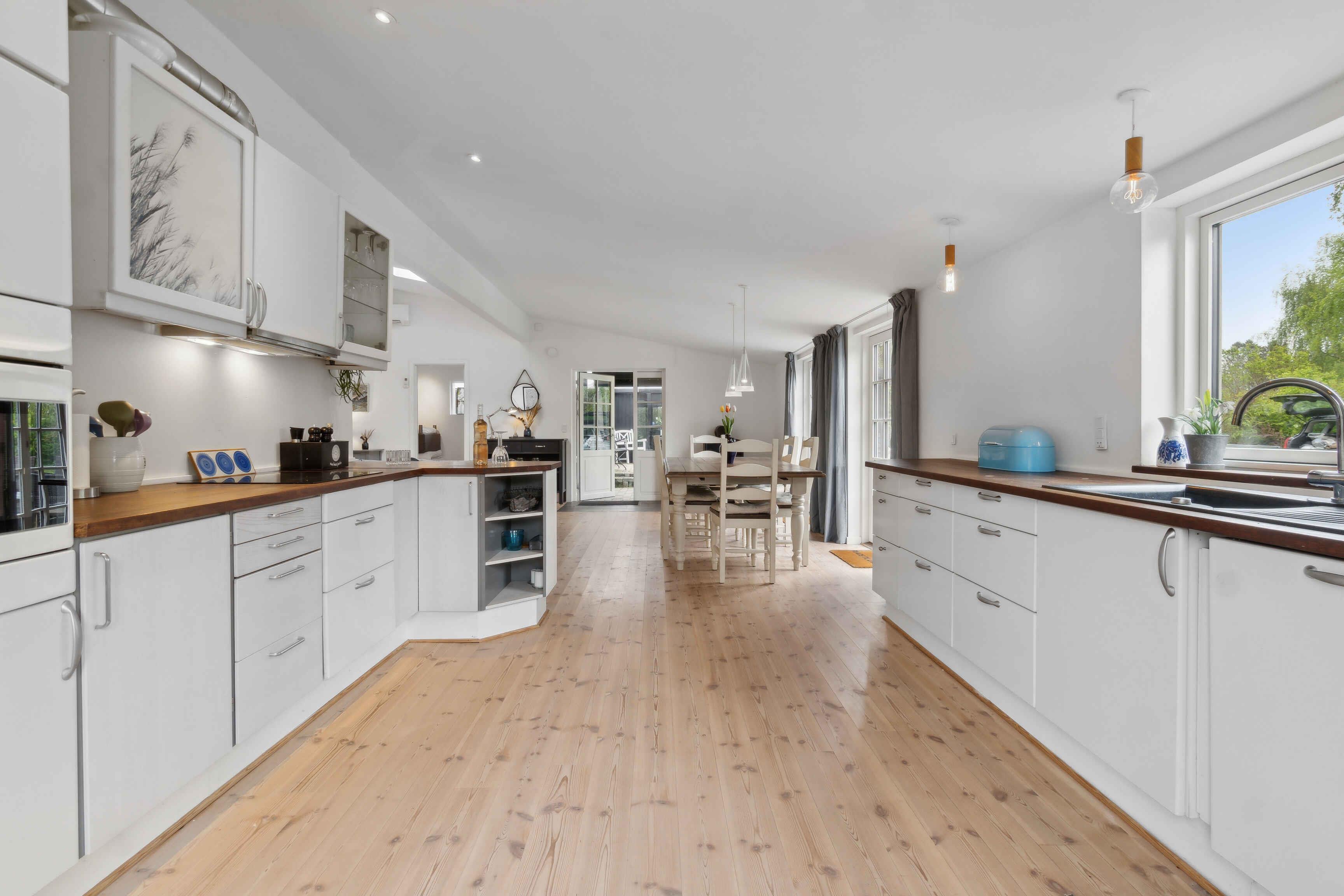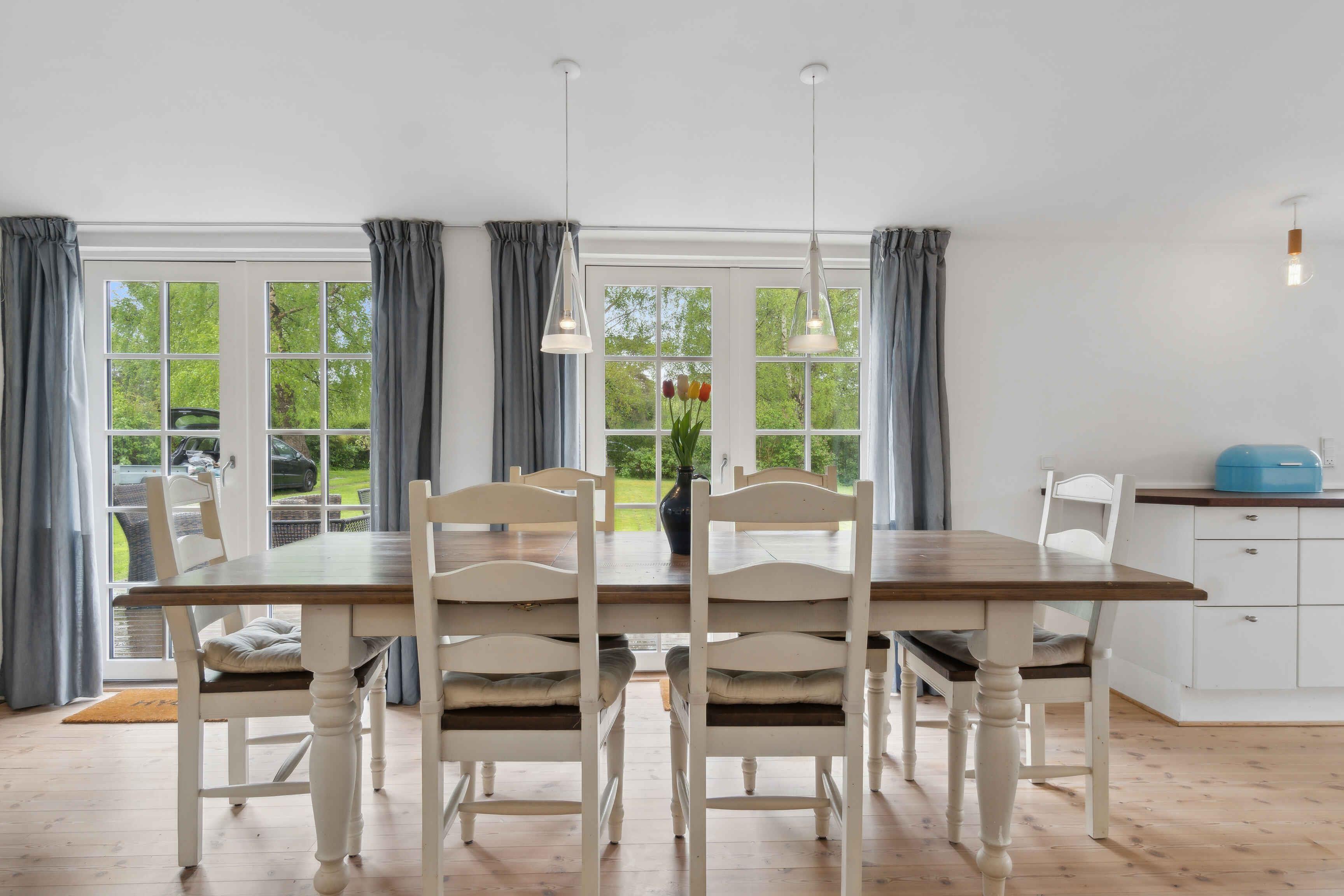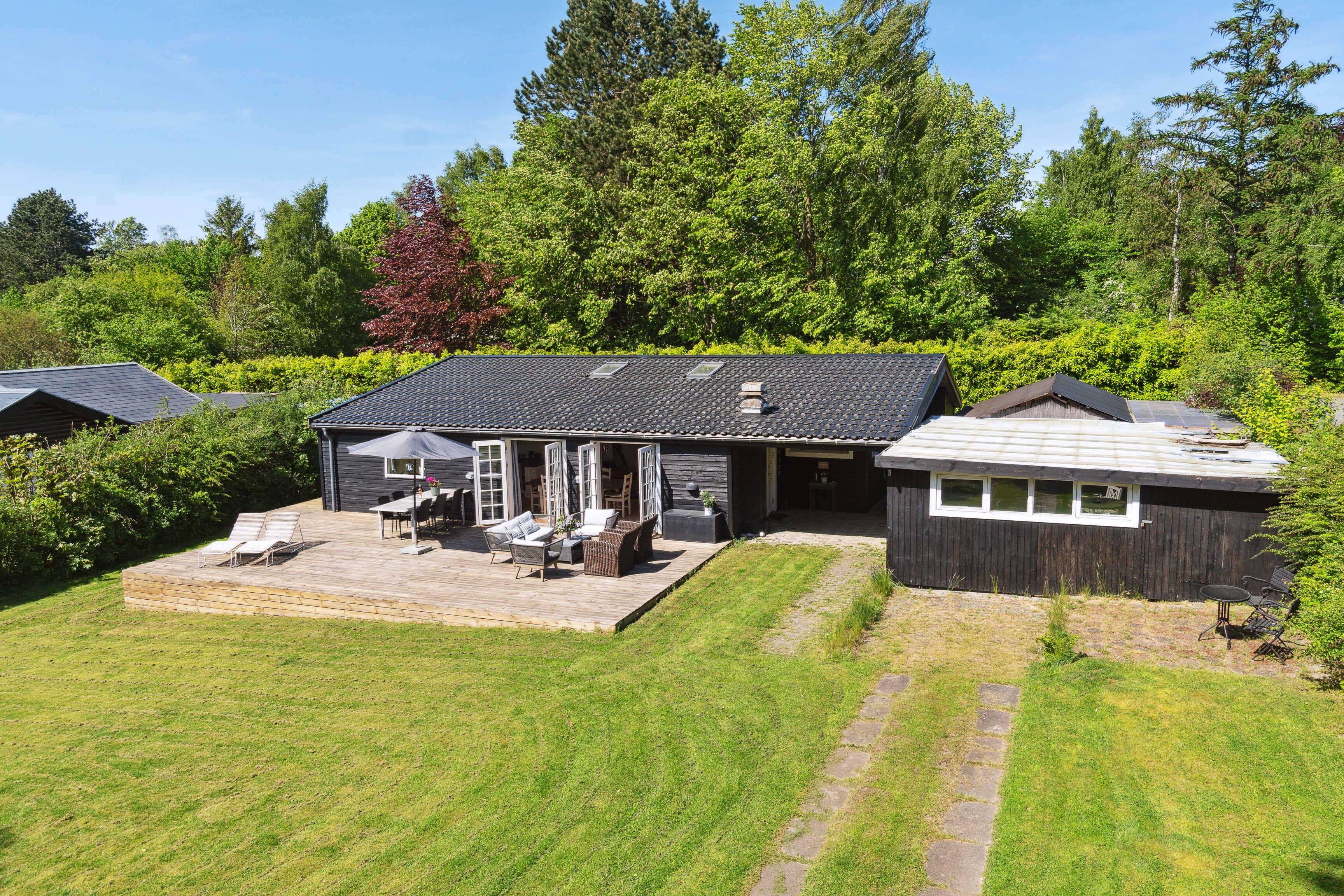 Ein schönes abgelegenes Ferienhaus, modern und gemütlich eingerichtet. Das Haus liegt zurückgesetzt auf privatem Grundstück in Dronningmølle, mit kurzer Entfernung zu malerischen Gebieten, dem guten kinderfreundlichen Sandstrand, Cafés, Restaurants und Lebensmittelgeschäften. Die Lage ist zentral für Ausflüge entlang der gesamten Nordküste, nach Kopenhagen und in Nordseeland. In der Nähe des Hauses gibt es einen offenen Gemeinschaftsbereich mit der Möglichkeit für Ballspiele und Spielen. Das Haus ist mit einem großen Gemeinschaftsraum mit offener Küche verbunden mit Wohnzimmer und Essbereich ausgestattet. Der große Raum hat ein Kathedralendecke und drei Doppeltüren mit direktem Zugang zur großen Holzterrasse. Das Ferienhaus bietet Platz für bis zu 5 Personen und ein Kind bis zu 3 Jahren. Es ist 120 m2 groß, wurde 1961 erbaut und regelmäßig renoviert. Das Haus befindet sich auf einem 1206 m² großen Grundstück, 700 m vom Meer und einem Angelteich entfernt. Der nächste Lebensmittelladen befindet sich in einer Entfernung von 425 m. Es gibt einen Golfplatz in einer Entfernung von 1950 m und einen Spielplatz in einer Entfernung von 625 m. Das Ferienhaus umfasst 60 m² offene Terrassenfläche und eine überdachte Terrasse von 28 m². Ein Grill steht zur Verfügung sowie Parkplätze am Ferienhaus. Das Haus verfügt insgesamt über 3 Schlafzimmer. Die Schlafgelegenheiten verteilen sich wie folgt: 2 Zimmer mit jeweils 2 Doppelbetten/Einzelbetten, einem Schreibtisch und ein Zimmer mit 2 Schlafplätzen in Einzelbetten/Doppelbett. Zusätzlich gibt es ein Kinderbett. Die Küche ist mit einem Kühlschrank mit Gefrierfach, einem Herd mit 4 Kochplatten, einem Backofen, einer Mikrowelle, einem Geschirrspüler und verschiedenen kleinen Küchengeräten wie Kaffeemaschinen, Toaster und Mini-Mixer ausgestattet. Es gibt ein Badezimmer mit Fußbodenheizung, Dusche und WC. Das Ferienhaus verfügt über einen Smart-TV und Chromecast. WLAN ist verfügbar. Haustiere sind nicht erlaubt.
