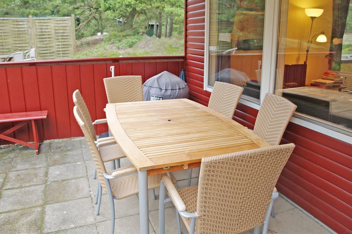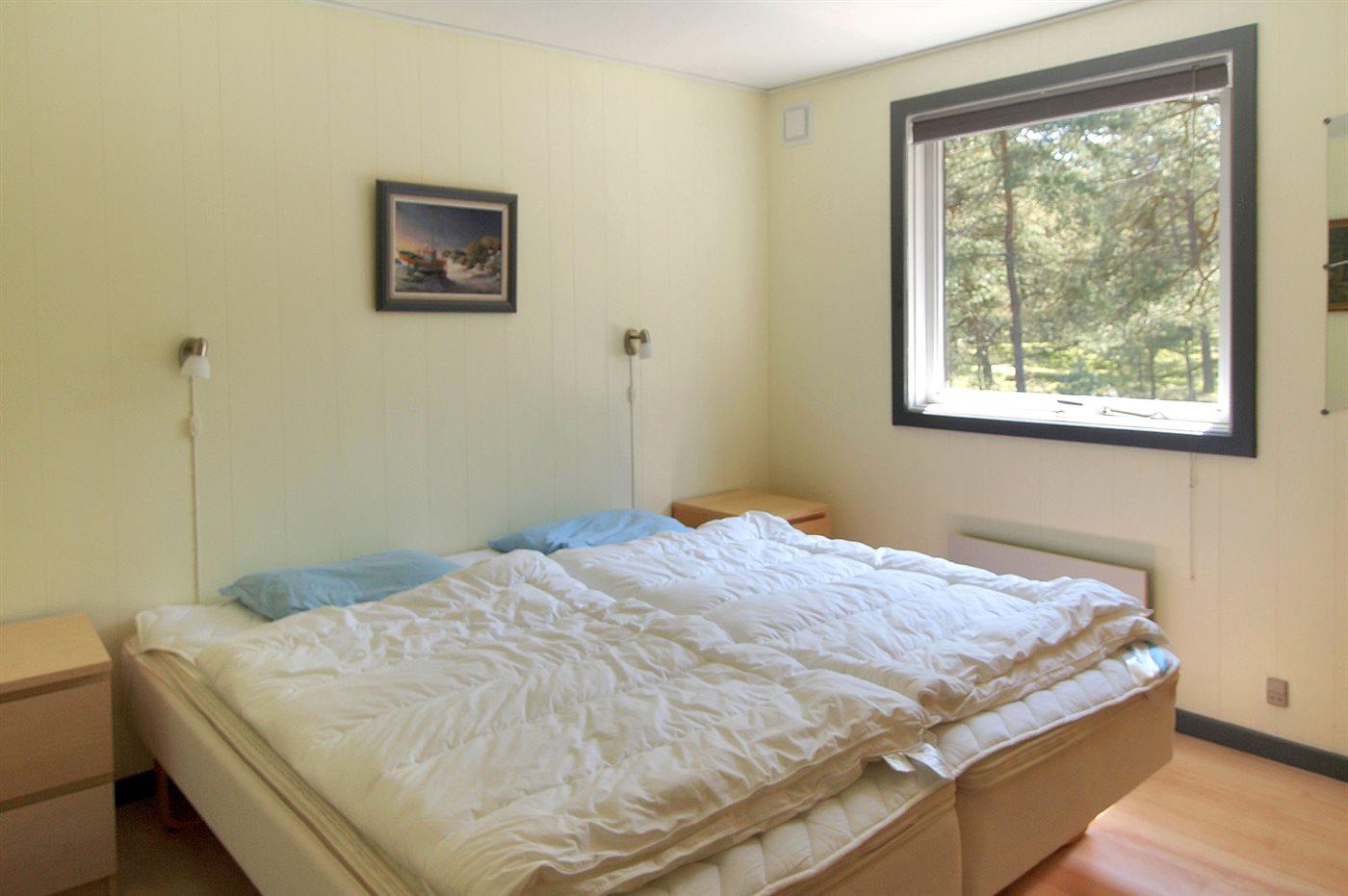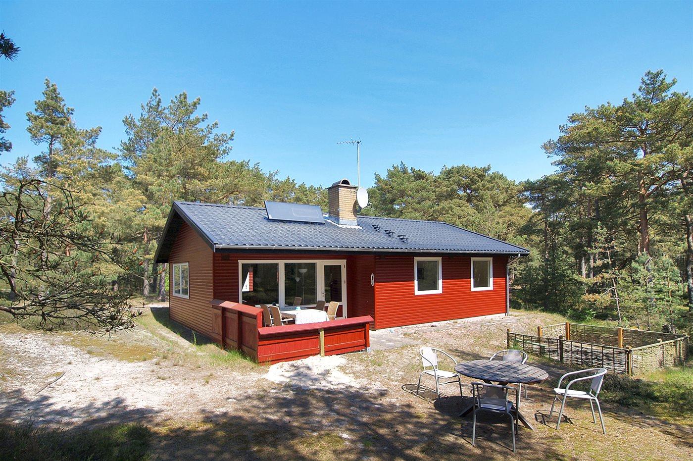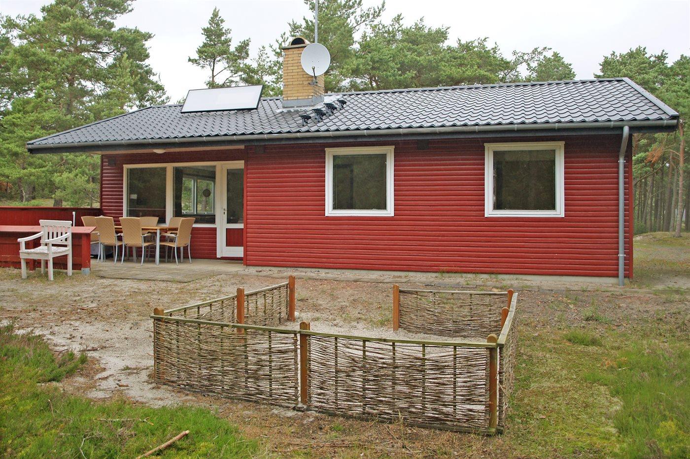 Besonders gut gelegenes Ferienhaus aus Holz, 1987 gebaut, in 1. Reihe zum Dünengebiet bei Sommer Odde gelegen. Der Strand unterhalb des Hauses ist sehr ungestört, und die hohen Dünen bieten gute Möglichkeiten fürs Sonnenbaden an. Es gibt auch gute Angelmöglichkeiten im Gebiet. Zum Haus gehört sowohl offenes als auch überdachtes Terrassenareal mit Gartenmöbeln. Innen gibt es Laminatholzböden sowie helle Wände und Decken. Badezimmer mit Dusche. Die Küche ist mit dem Wohnzimmer kombiniert und u. a. mit Mini- Geschirrspüler, Waschmaschine, Ceran-Feld, Umluftofen, Mikrowelle, Kaffeemaschine sowie Bosch Tassimo Kaffeeautomat ausgestattet. Das große Wohnzimmer ist mit TV mit digitalem Satellitenanschluss, DVD- und CD-Spieler sowie Kaminofen (und Gitter für Kindersicherung) eingerichtet. Vom Wohnzimmer gibt es direkten Zugang zur Terrasse. Die Schlafplätze des Hauses verteilen sich auf 1 Zimmer mit Doppelbett und 2 mit je 2 Einzelbetten. Für die kleinen Feriengäste sind Sandkiste und Schaukel vorhanden. Kostenlose, kabellose Internetverbindung (eigener Computer muss mitgebracht werden). Waschmaschine zur Verfügung. Geräumiger Geräteraum. In der Nähe liegen Dueodde Golfplatz mit 18 Löchern und Snogebæk, ein lebendiges Fischerdorf mit wenigen aktiven Fischern, Restaurants, ökologischer Eisfabrik, Räuchereien u .a .m.